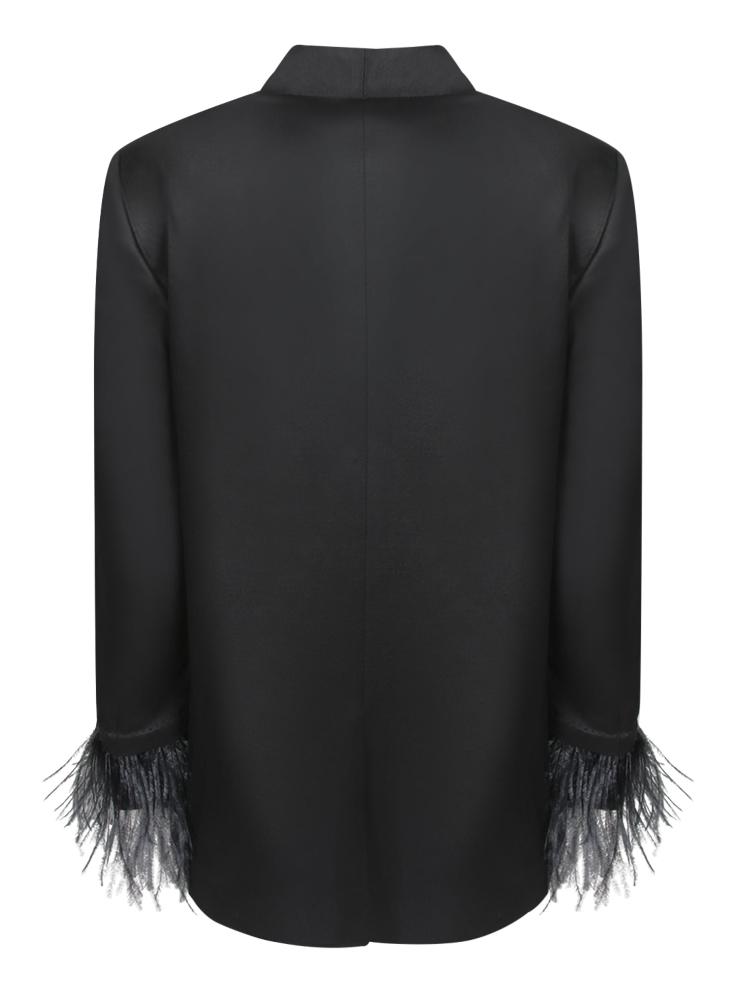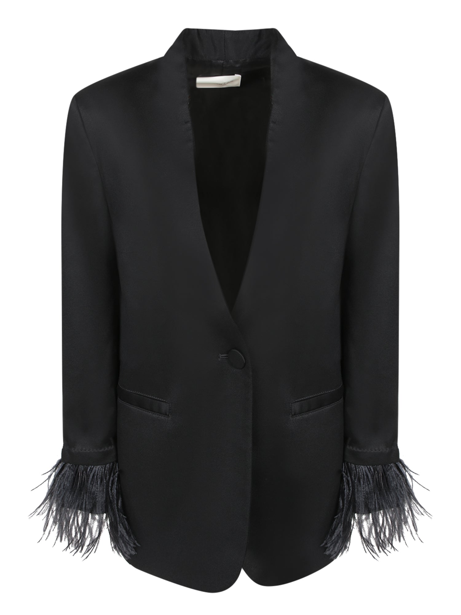 Single-breasted jacket in smooth fabric, with velvet lapels and fringe details on the sleeves.