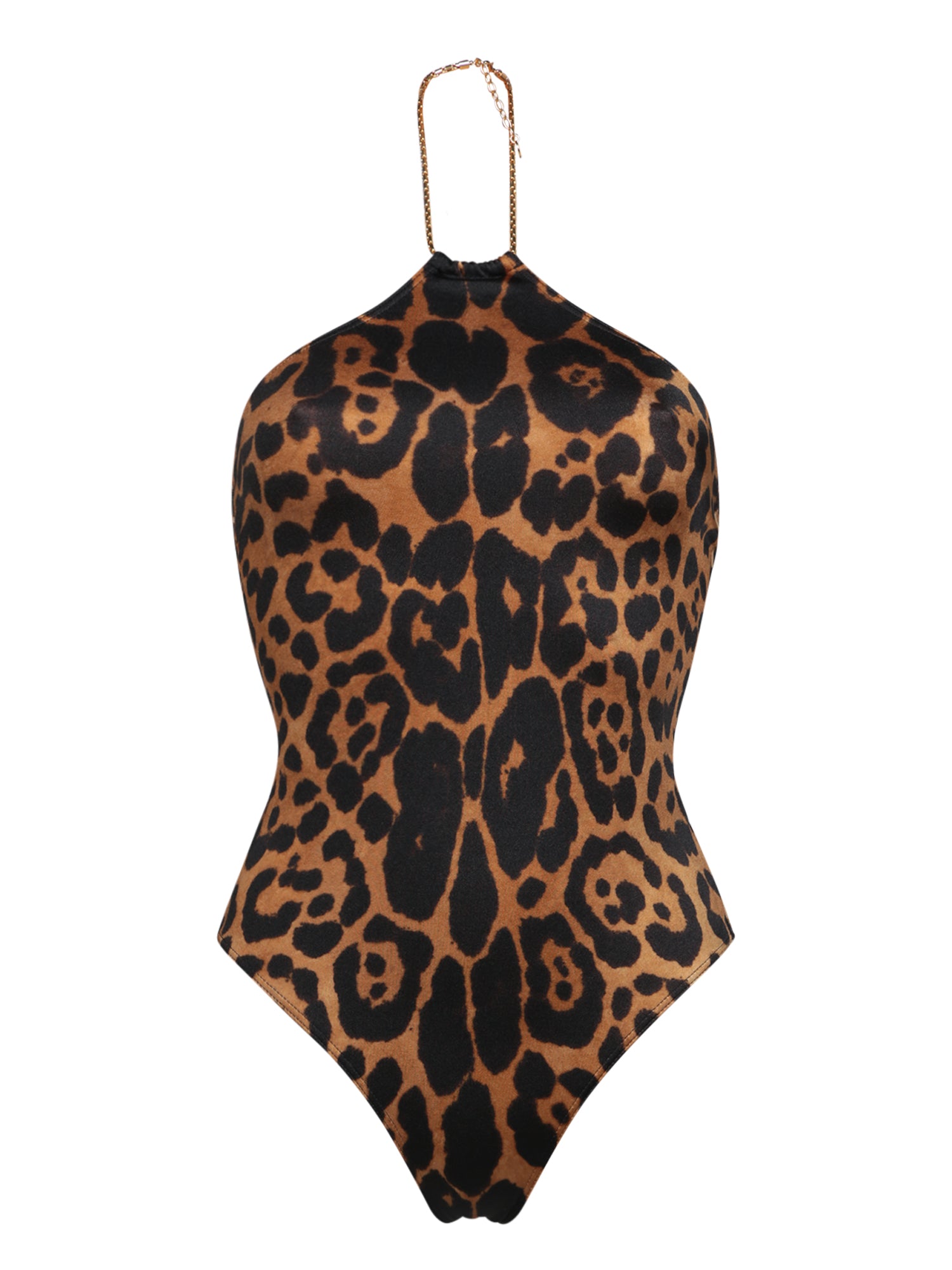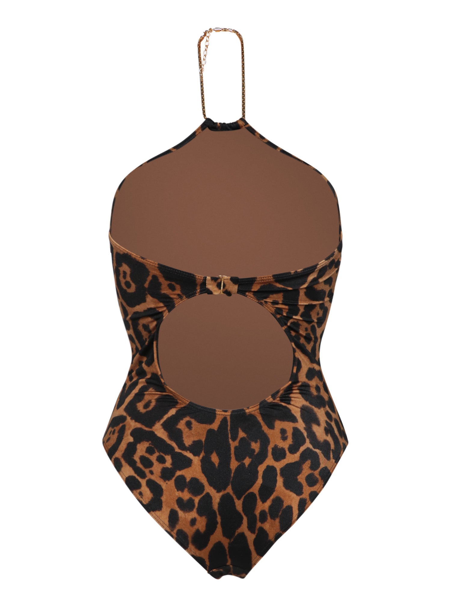 One-piece swimsuit. Leopard print. Halter tie with gold chain details.