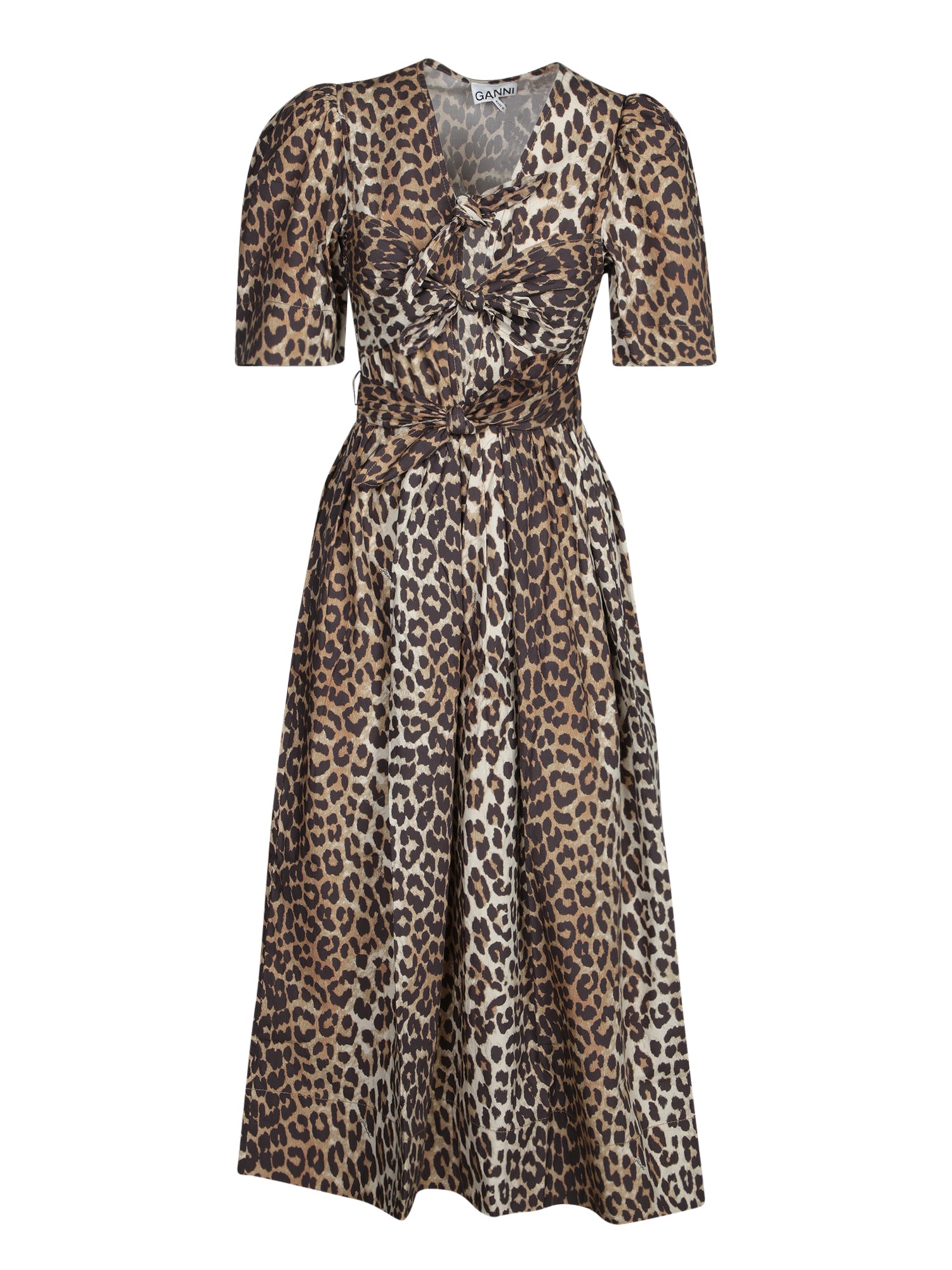 This charming GANNI midi dress, crafted in lightweight cotton with a leopard print, brightens up the wardrobe with a bold touch. The wrap design and decorative knots accentuate the silhouette for a feminine and elegant look.