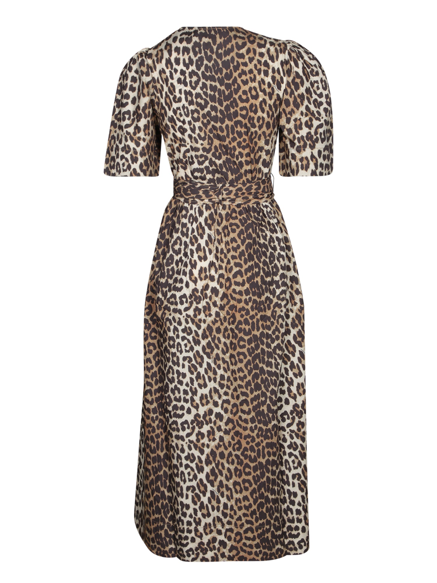 Short-sleeved dress with leopard print. Features a V-neckline and decorative knots on the front.
