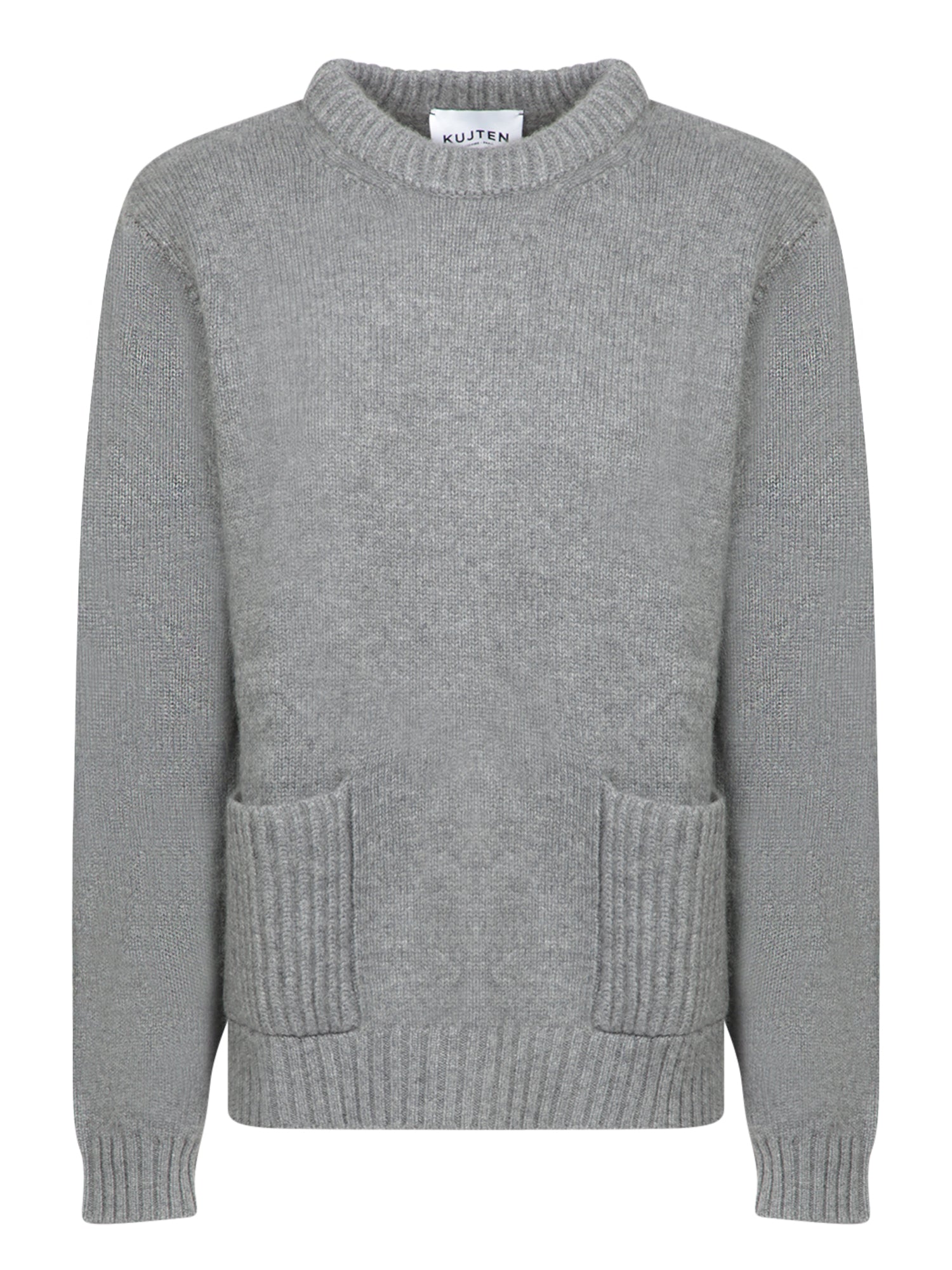 Explore casual sophistication with Kujten's Lida Grey Crew Neck Sweater, featuring a minimalist design with kangaroo pockets. Perfect for an everyday look that doesn't compromise on elegance.