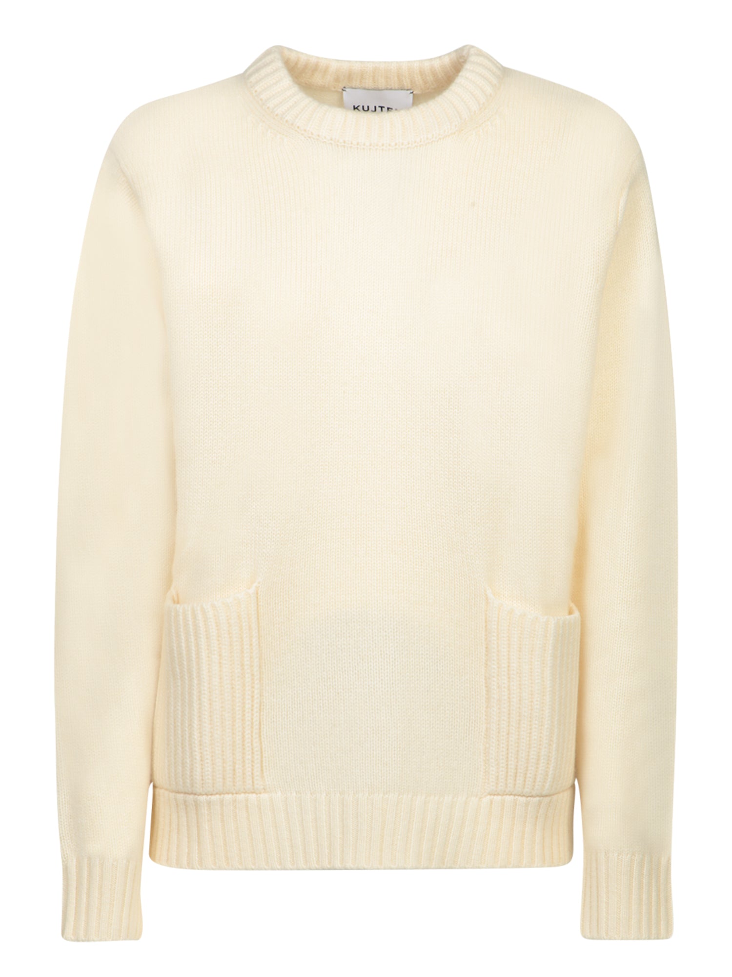 Explore contemporary comfort with Kujten's sweater in pristine white. Featuring distinctive front pockets and ribbed trim for a perfect fit.