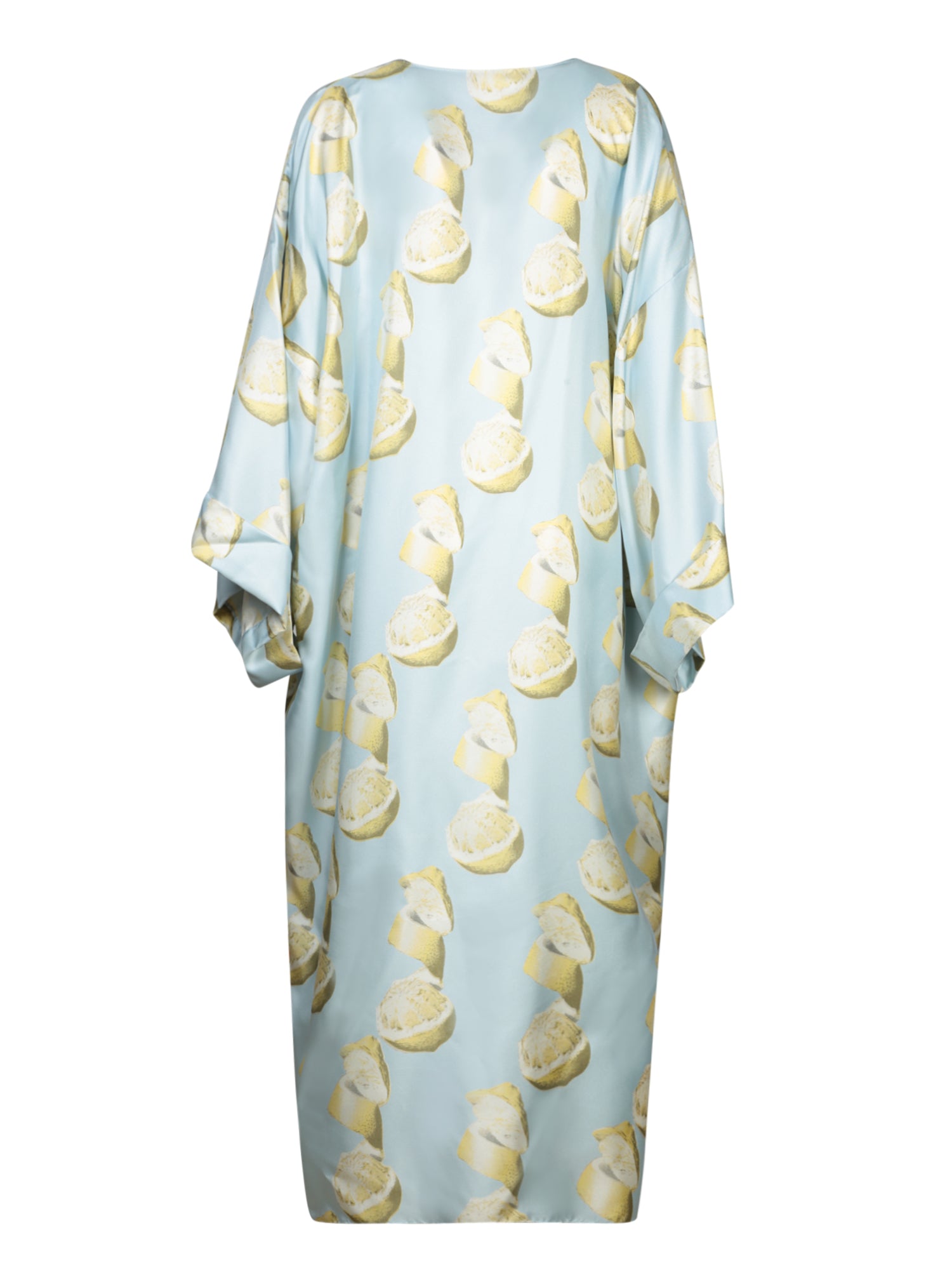 Long silk kaftan with lemon print. V-neck with decorative laces. Wide kimono-style sleeves.
