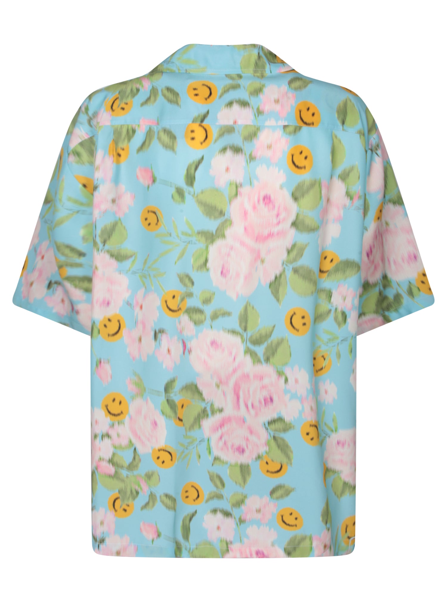 This Moschino light silk shirt features a vibrant floral and emoticon print, perfect for adding a cheerful touch to your summer wardrobe. The soft structure and relaxed design ensure both comfort and style.
