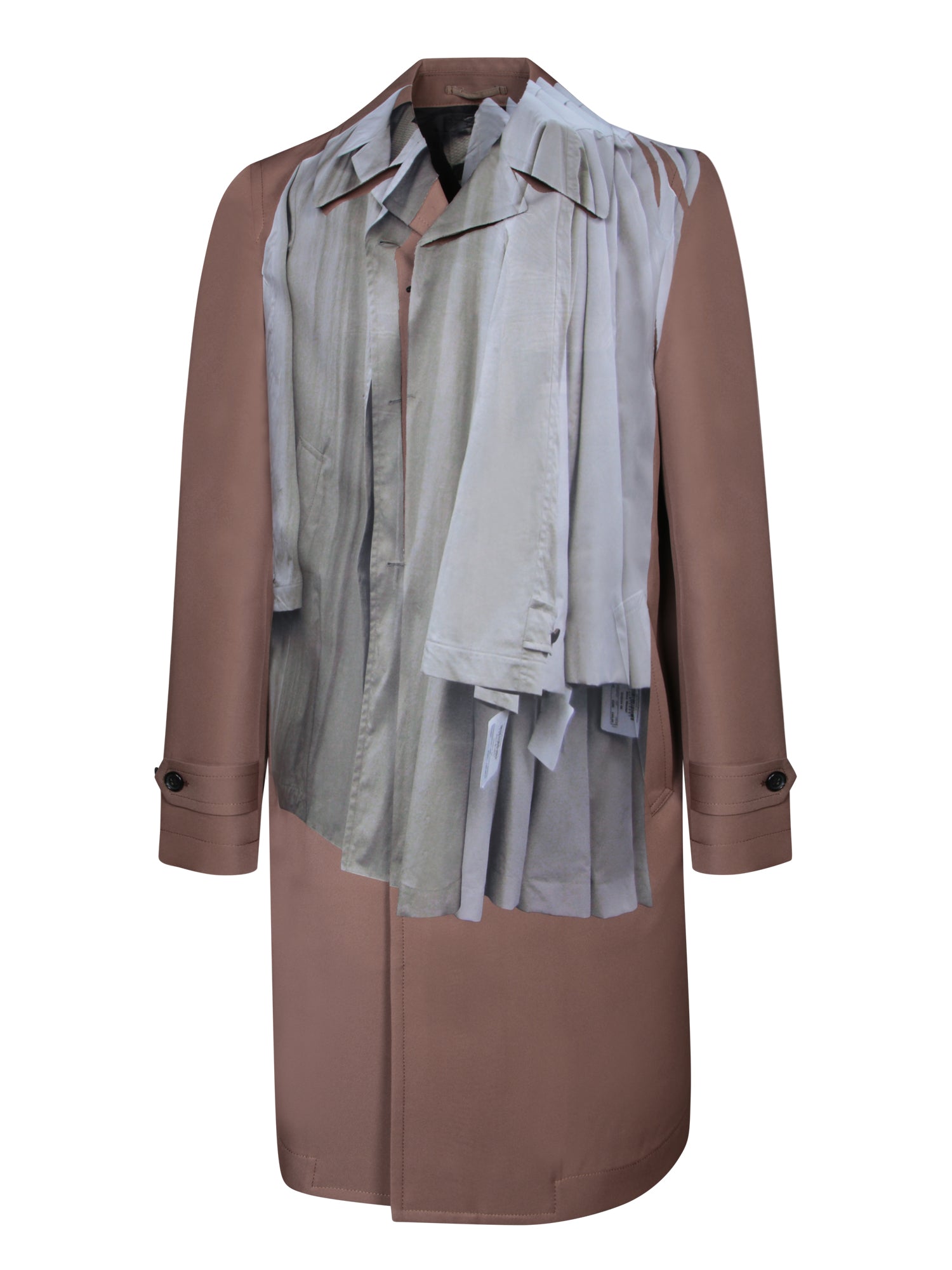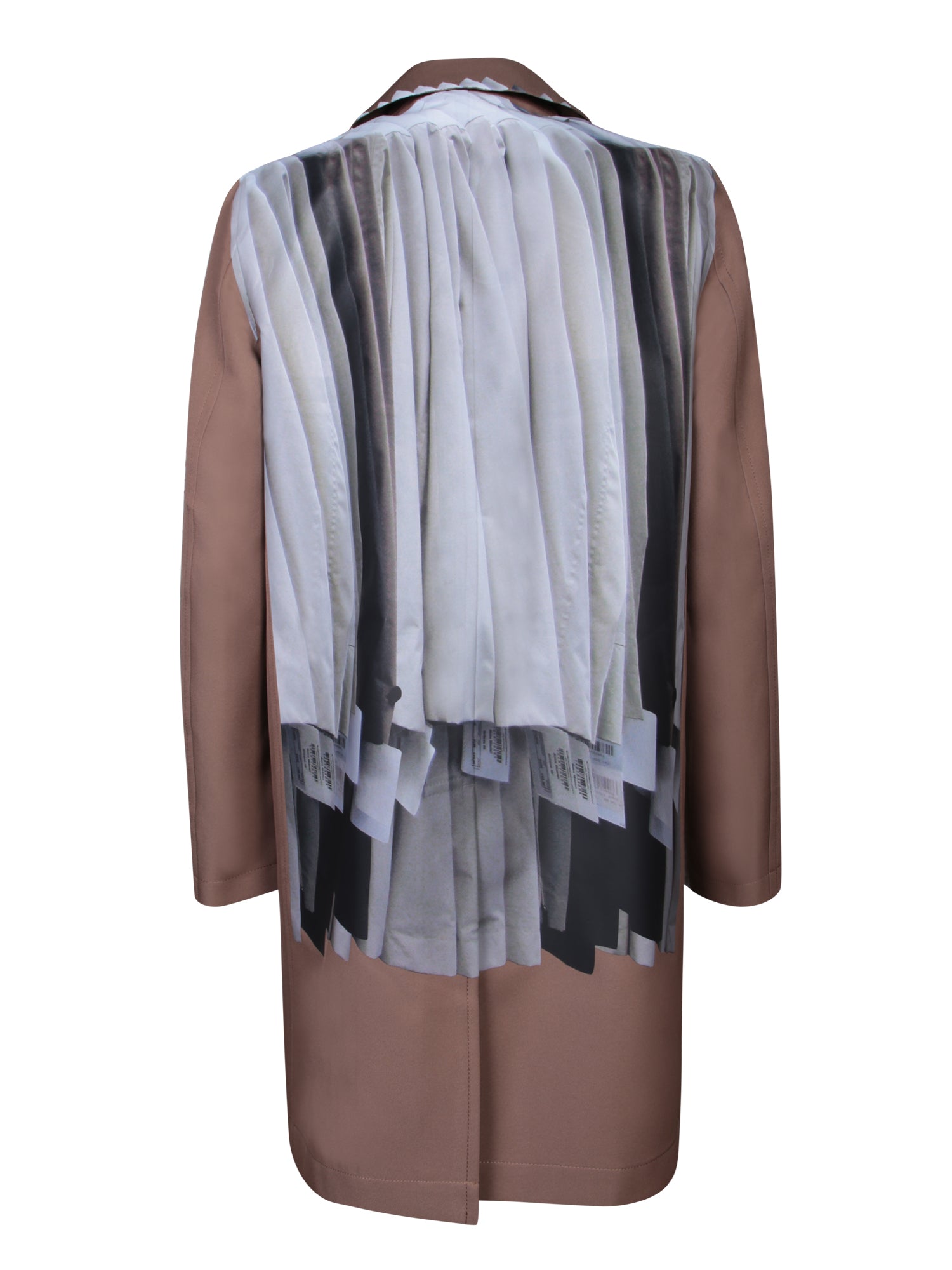Mid-length coat with lapel collar, button closure, and ruffle detailing.