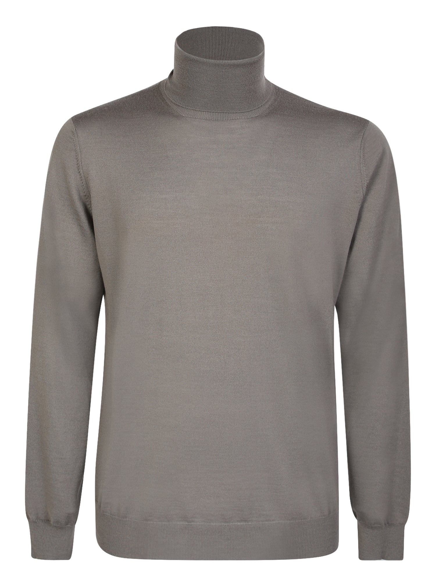 High collar. Long sleeves. Ribbed knit. Elastricated hem and trim. Slim cut. Color: mastic
