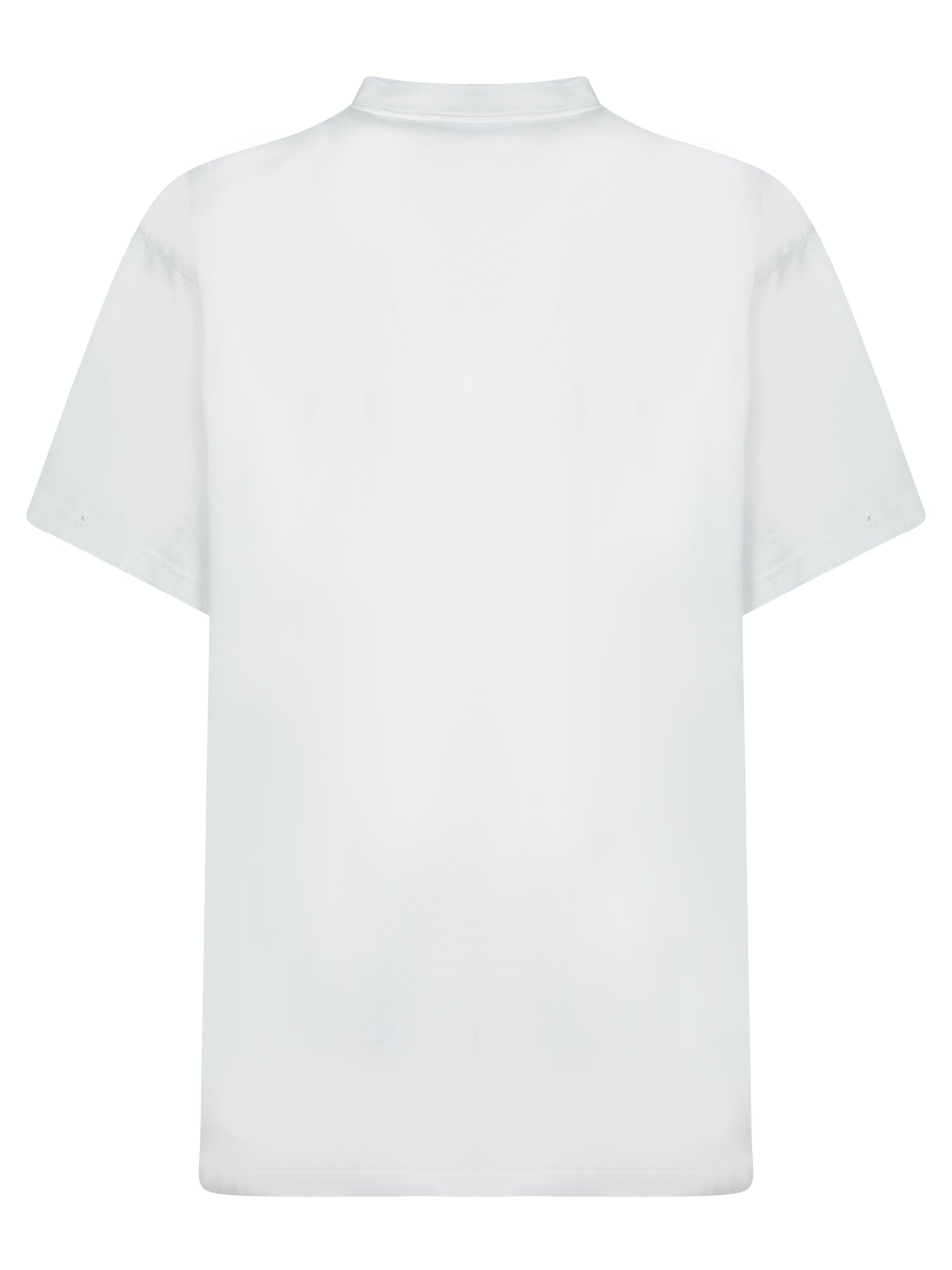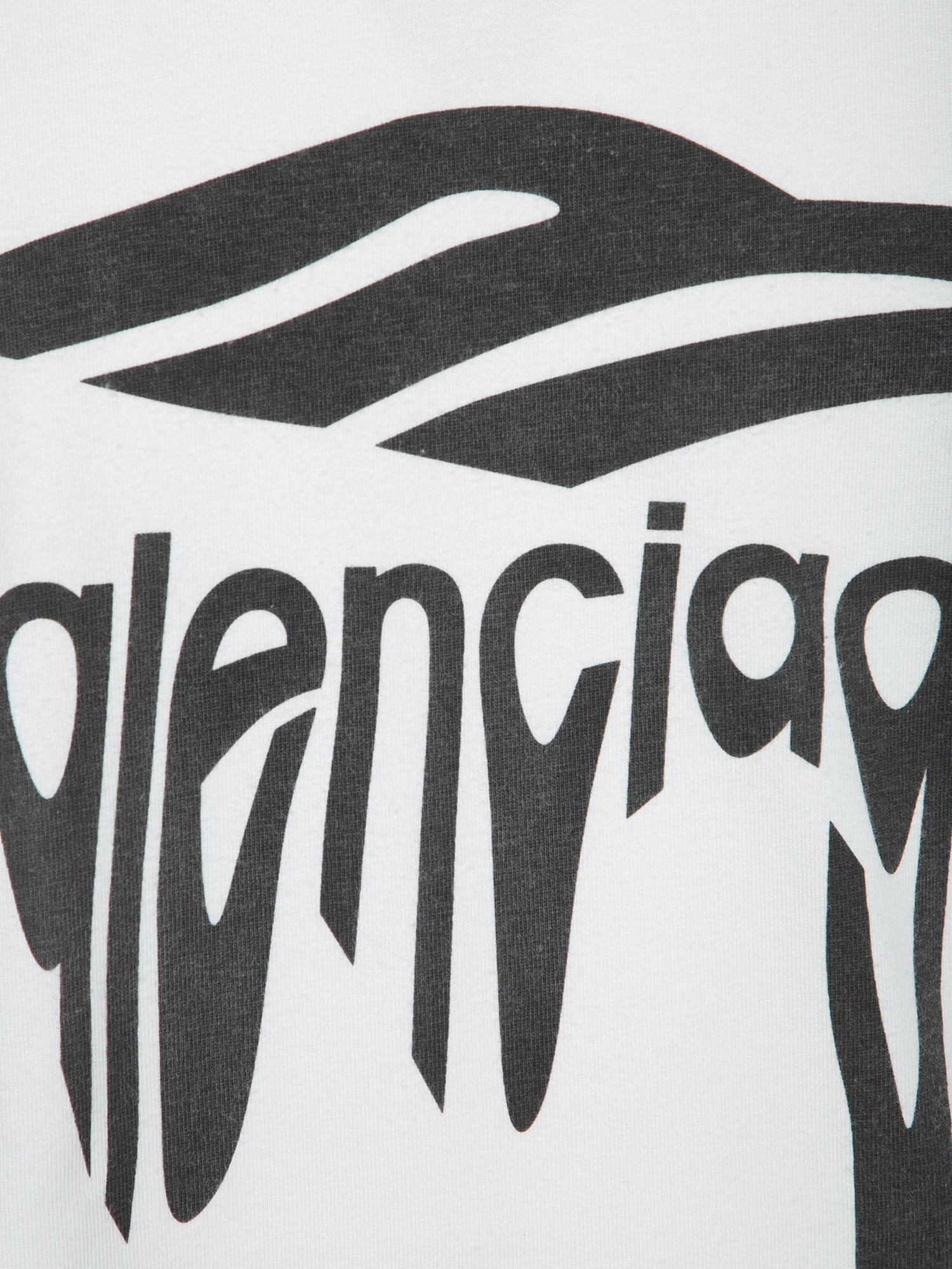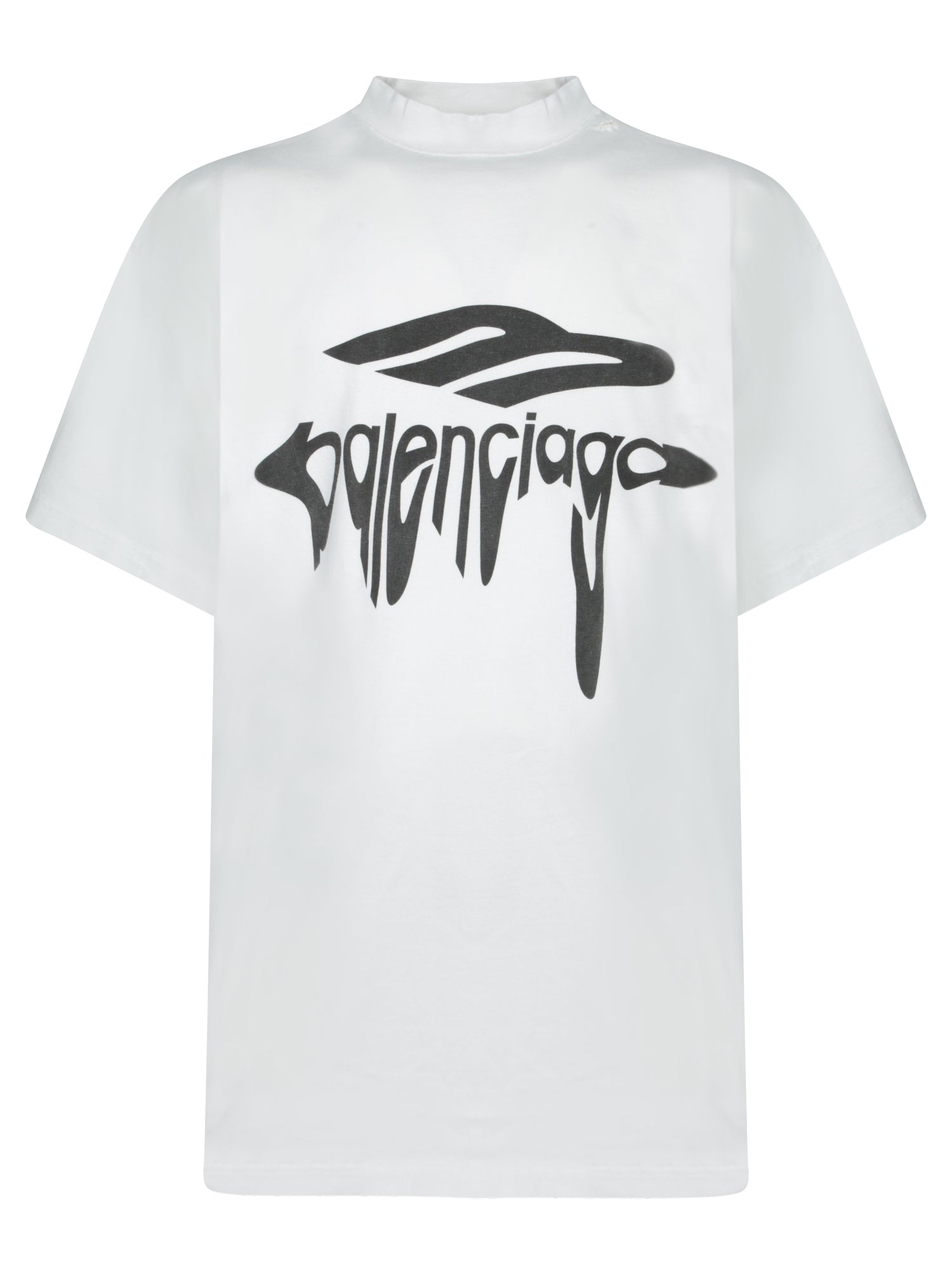 This Balenciaga T-shirt features a bold black liquid logo on a white base, blending urban sophistication with high fashion in an essential casual garment.