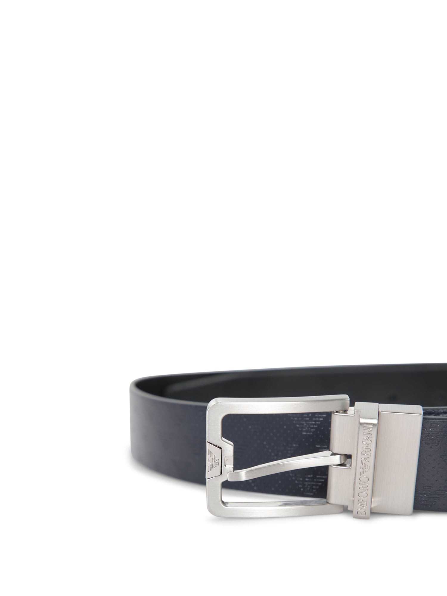 Leather belt with embossed logo pattern. Rectangular silver-tone metal buckle.