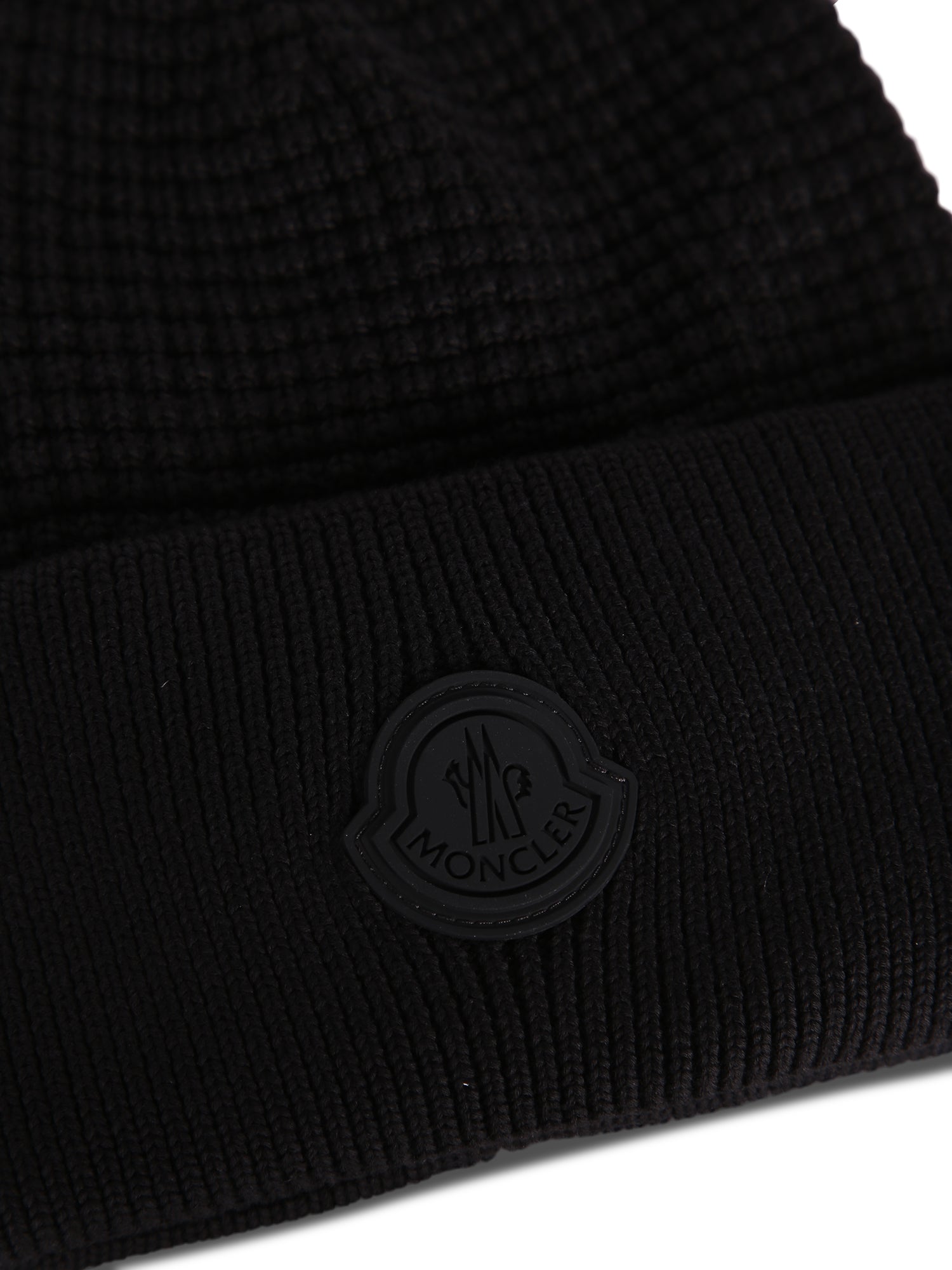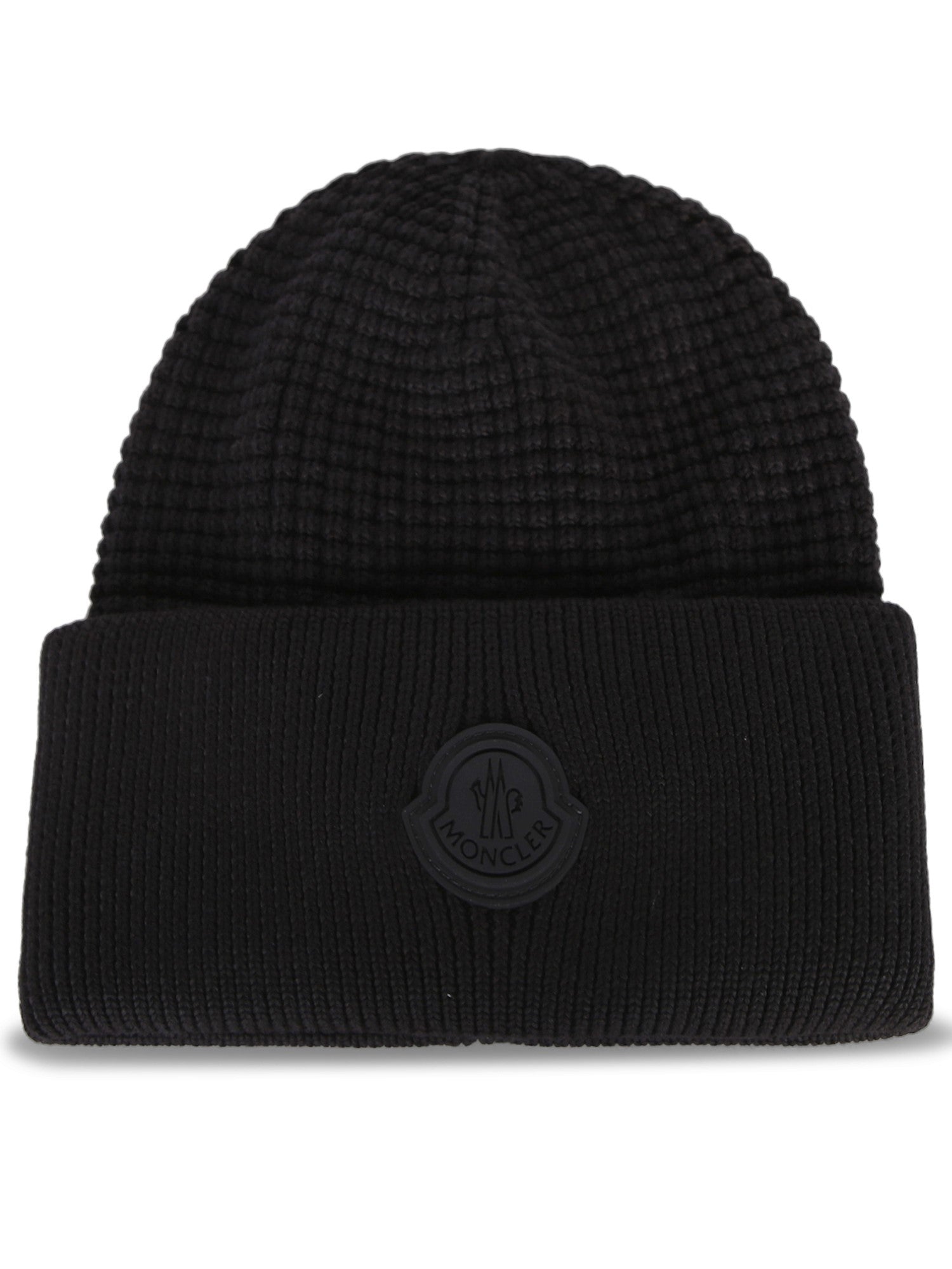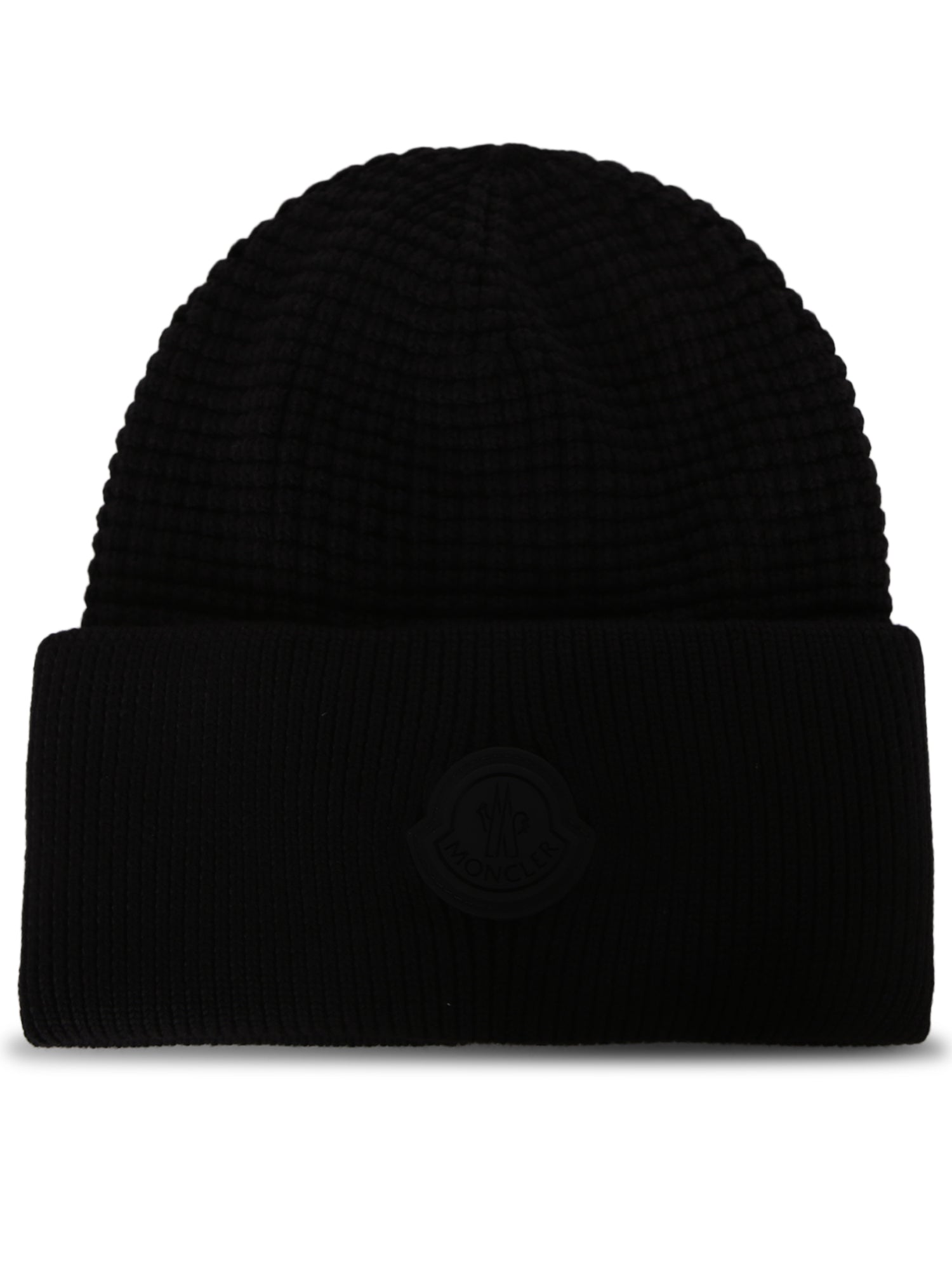 Knitted beanie hat, embossed Moncler logo, ribbed design, fold-over brim.