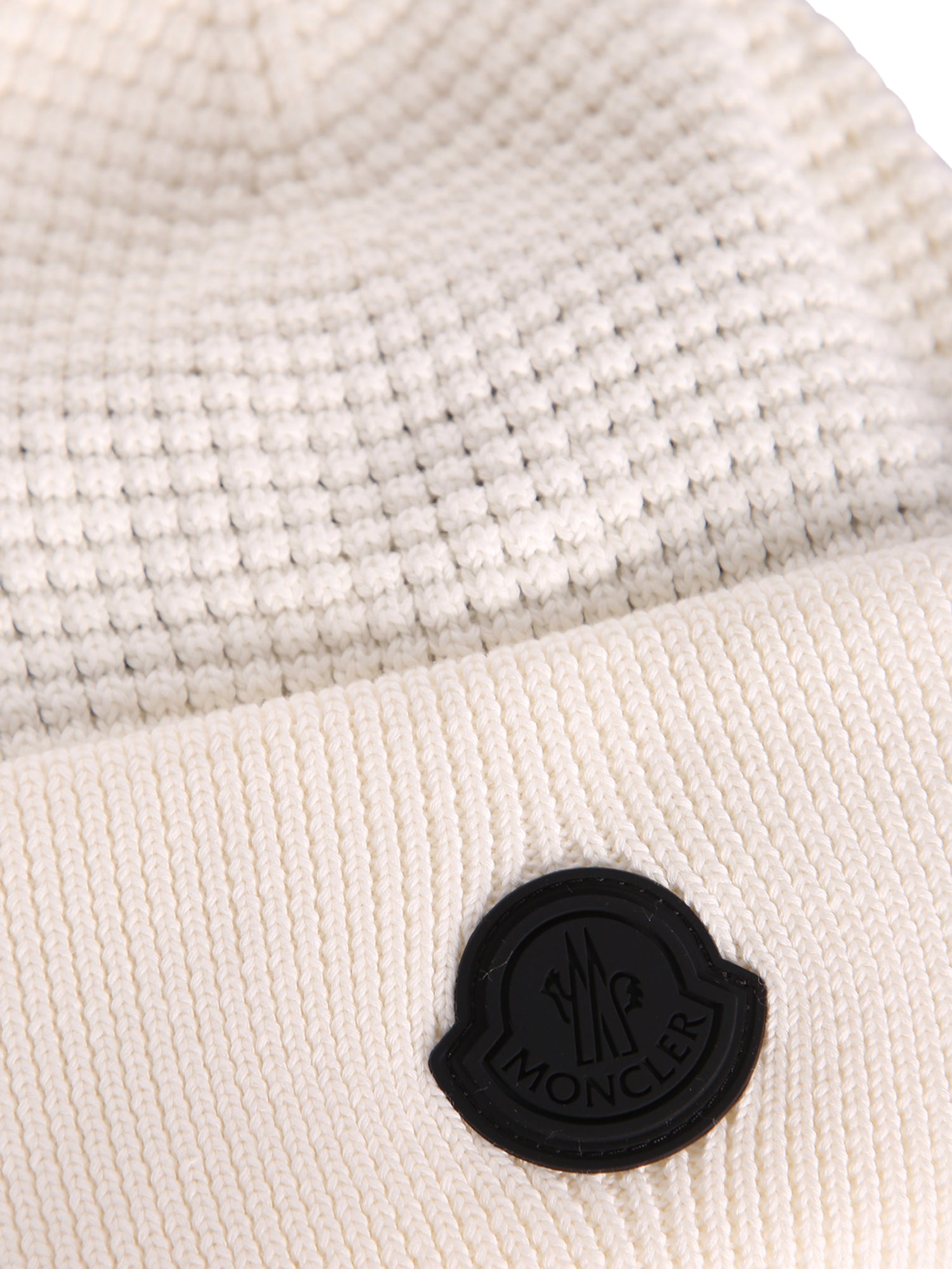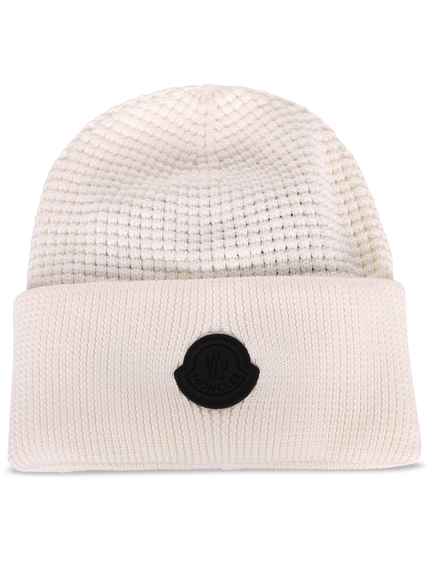 Ribbed knit beanie. Fixed cuff. Applied logo detail.