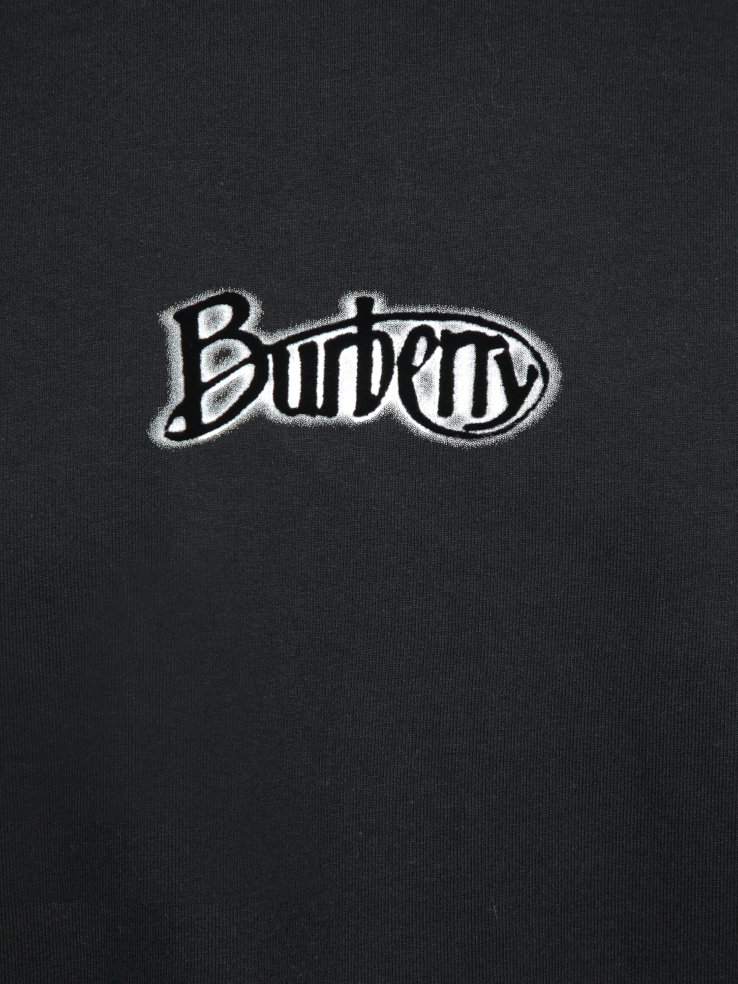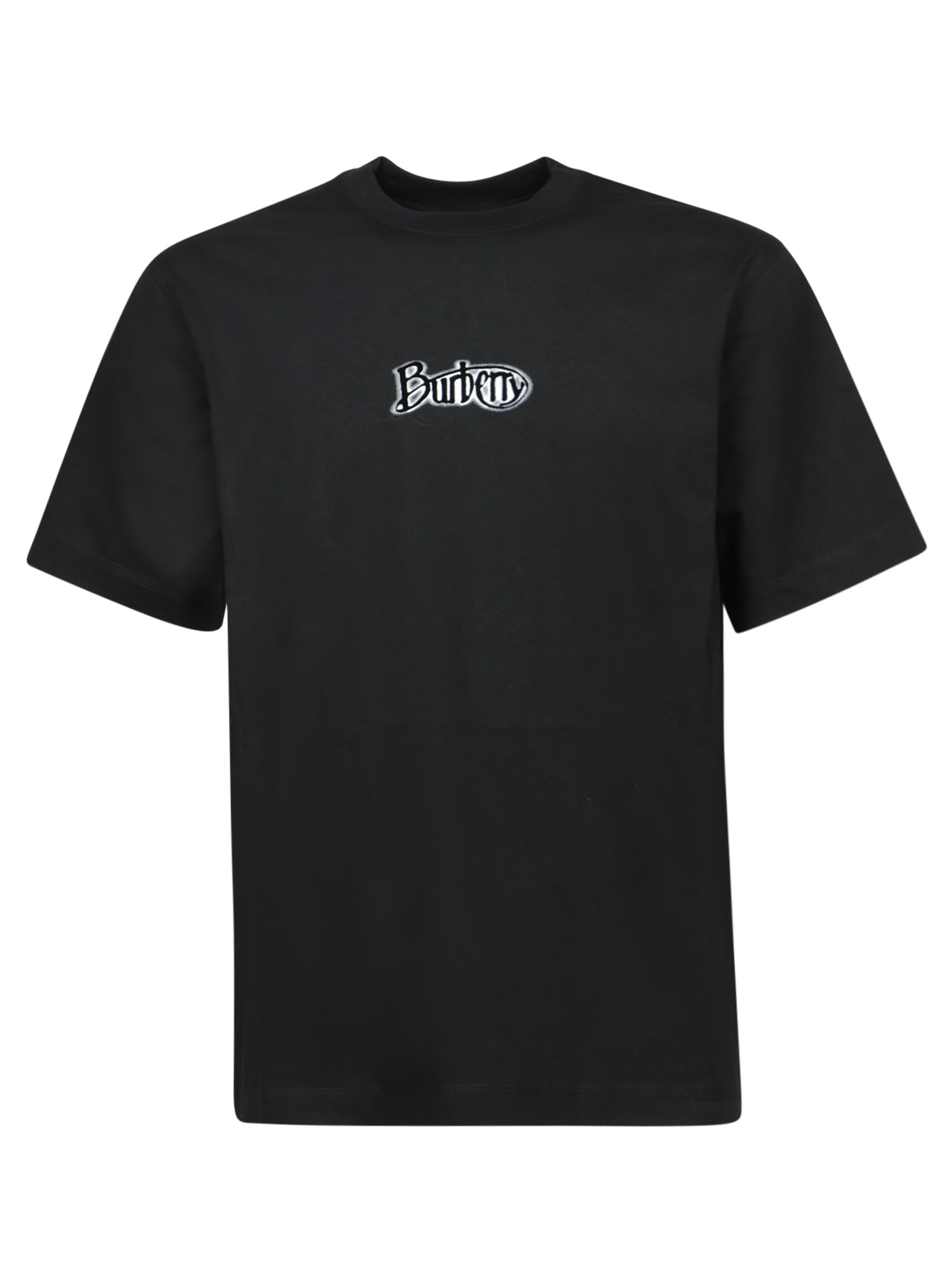 This black cotton T-shirt from Burberry is distinguished by its minimalist design, featuring an eye-catching white logo on the chest, adding a distinctive touch to the piece.