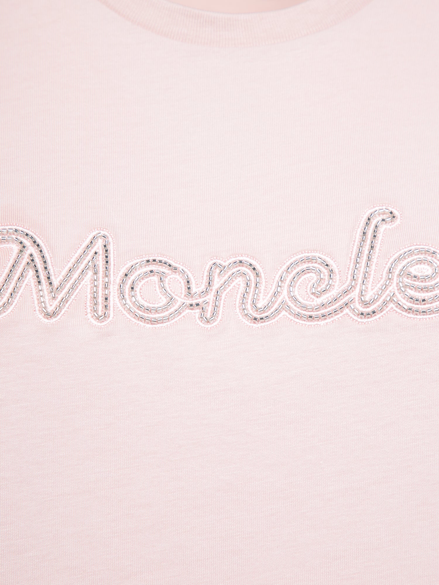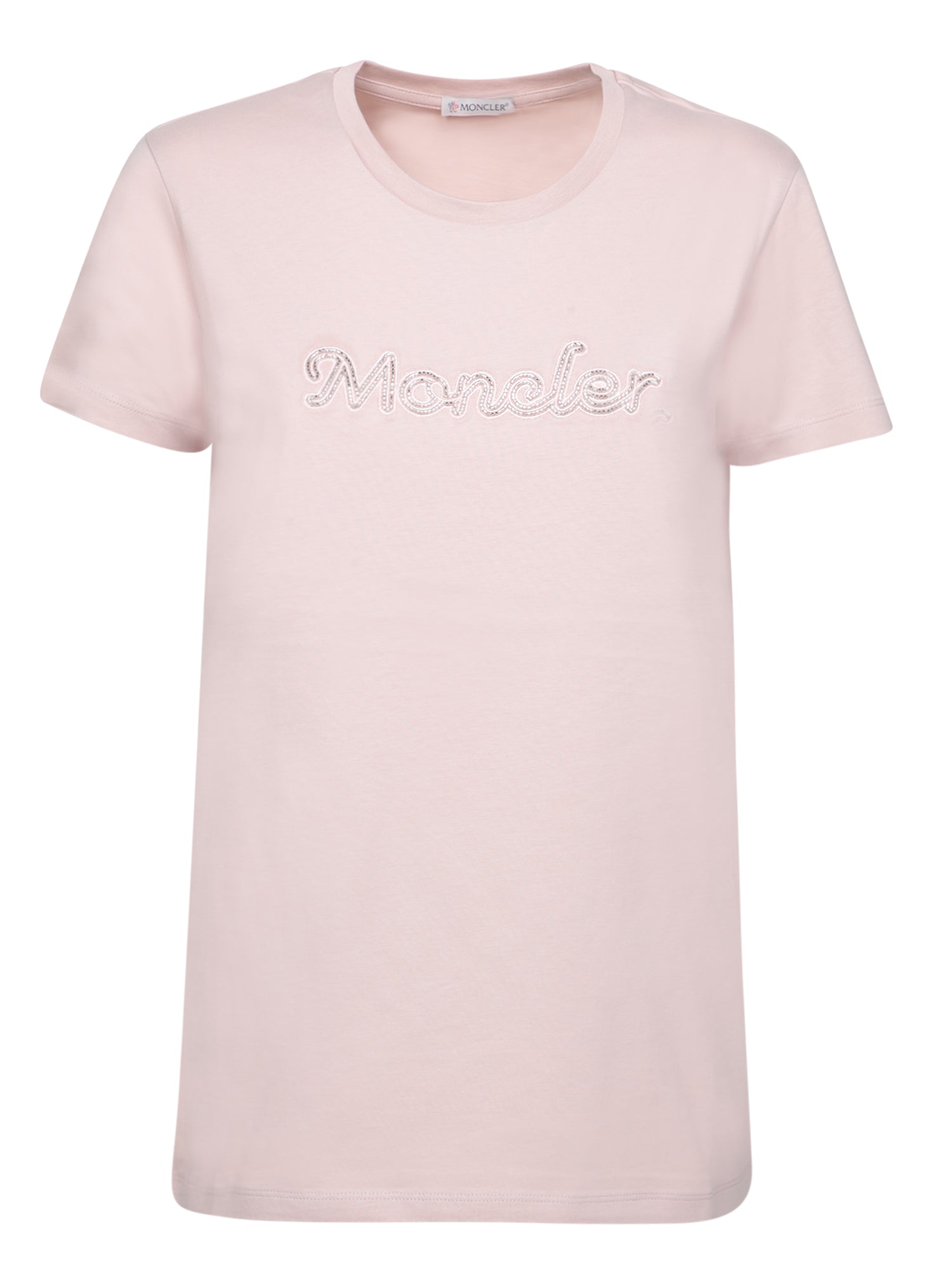 A delicate pastel pink merges with the elegance of the Moncler embroidered logo in sparkling thread, offering a touch of casual sophistication.