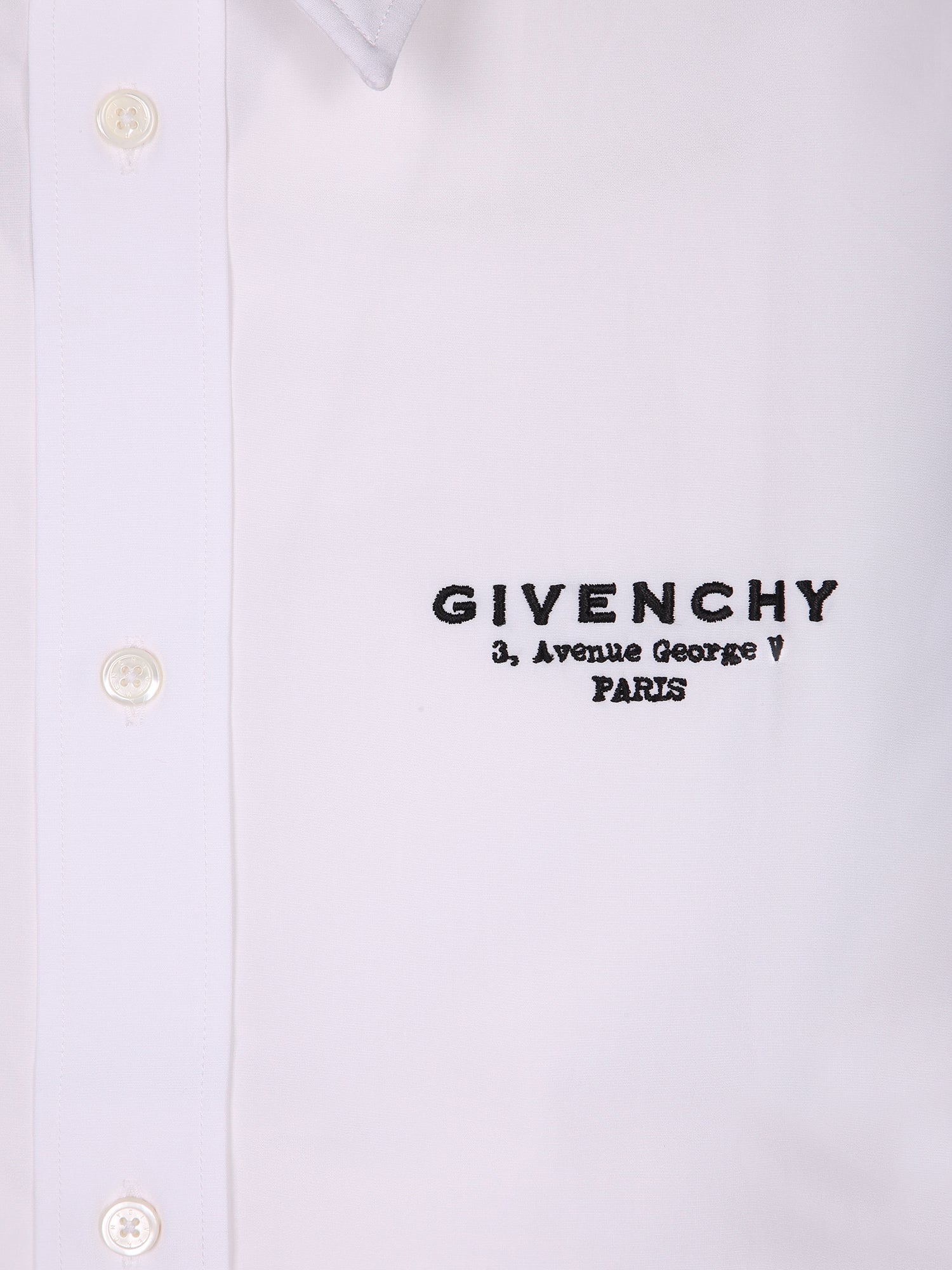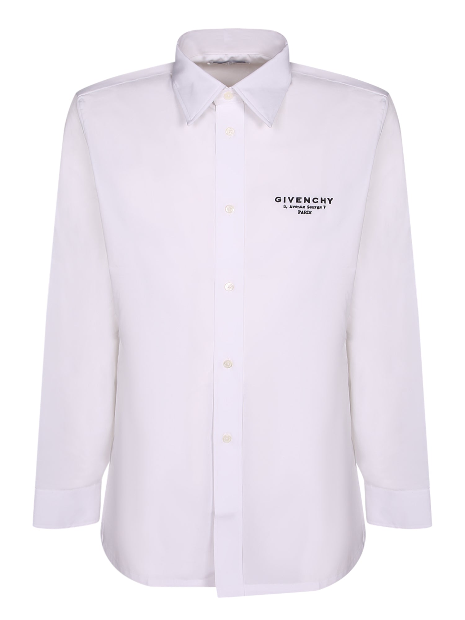 Long sleeve shirt in lightweight fabric, classic collar, button front closure. Black Givenchy logo on the chest.