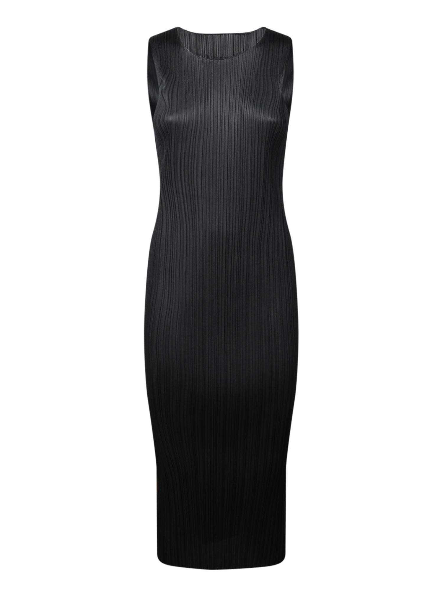 Sleeveless long dress. Pleated fabric. Round neckline.