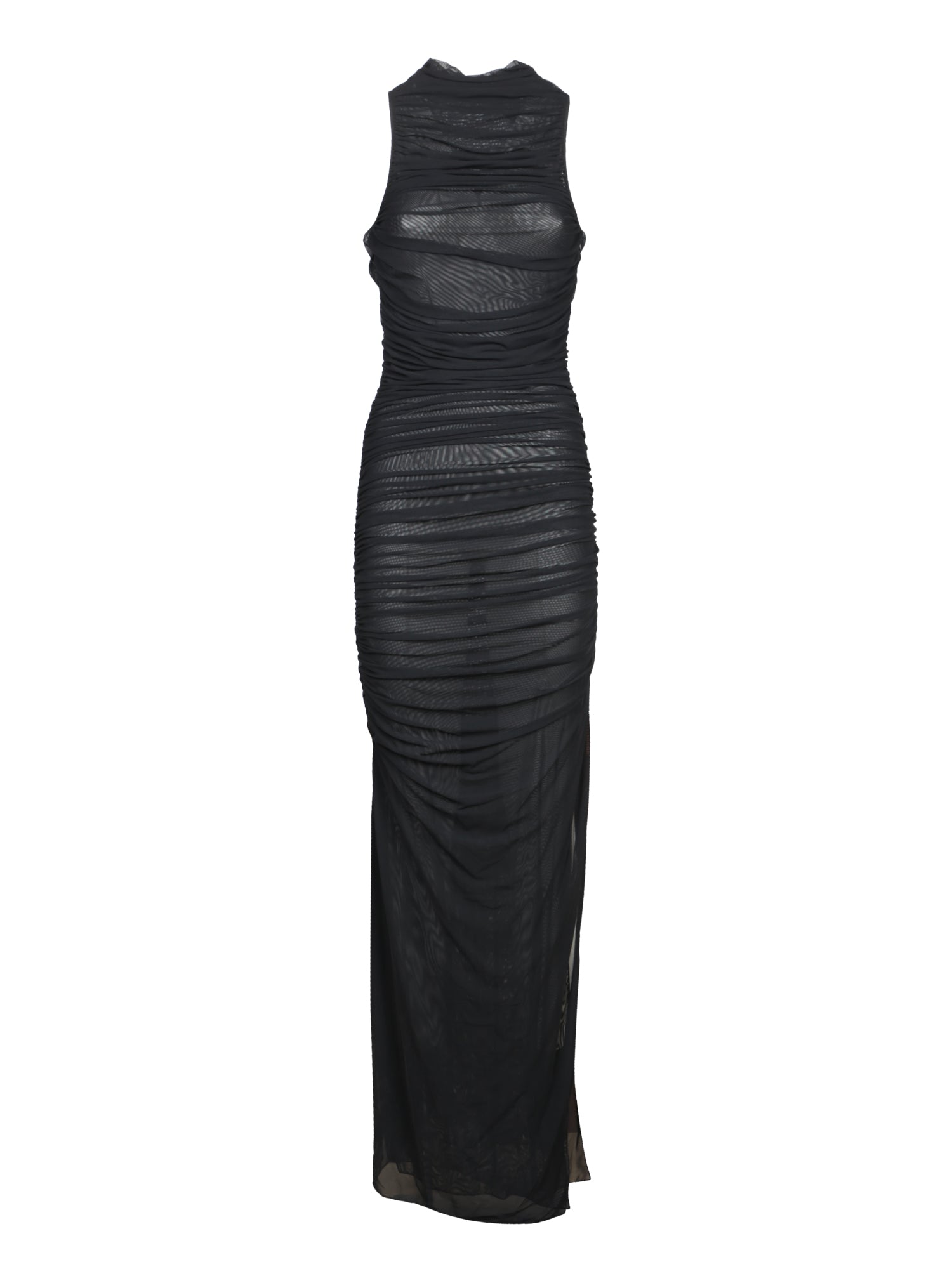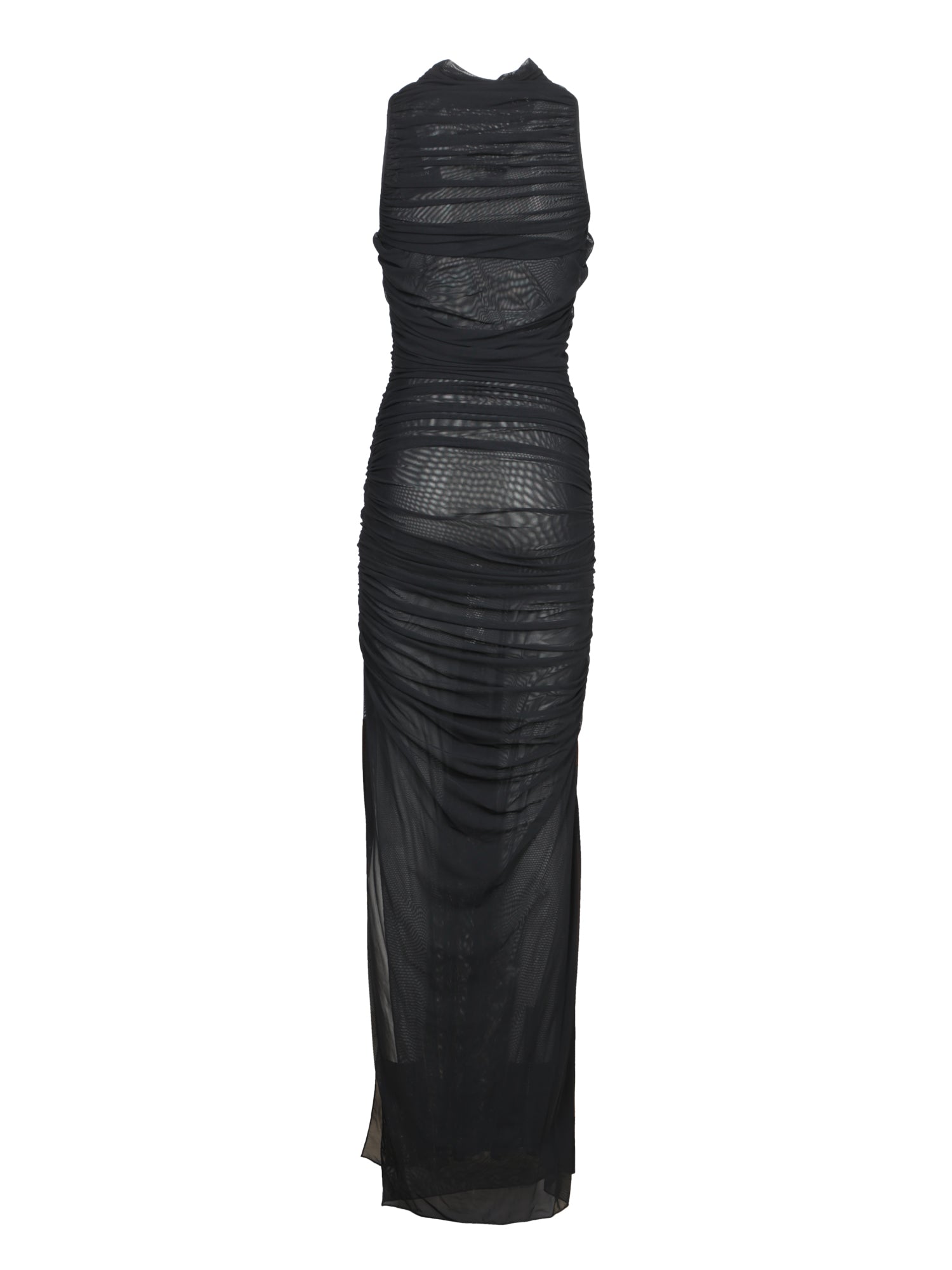 Sleeveless long dress. Mesh fabric with wavy details. Form-fitting design.