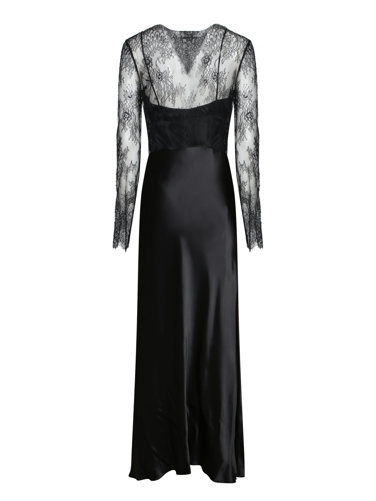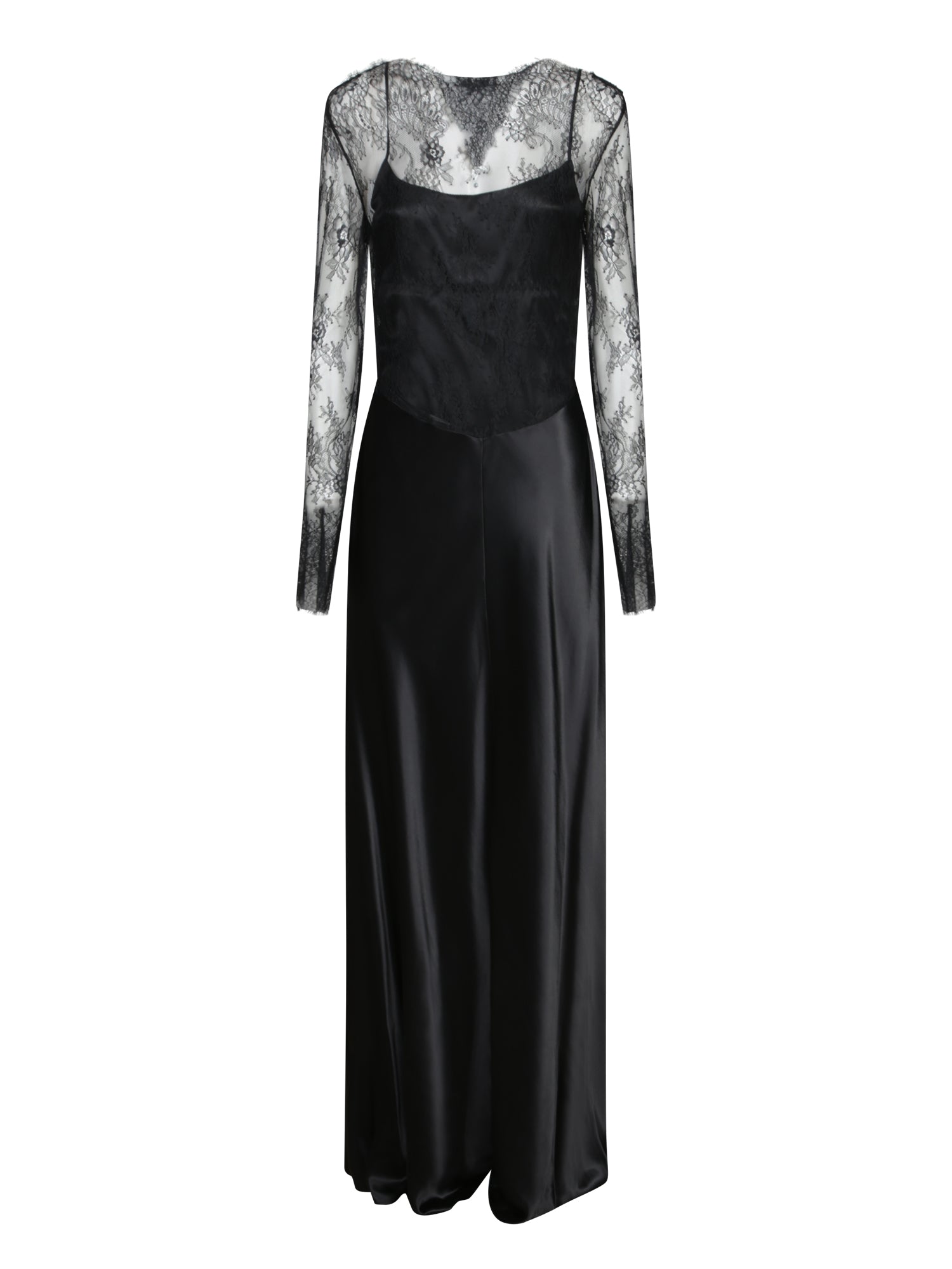 Long lace sleeves, satin bodice with lace details, flowing satin skirt.