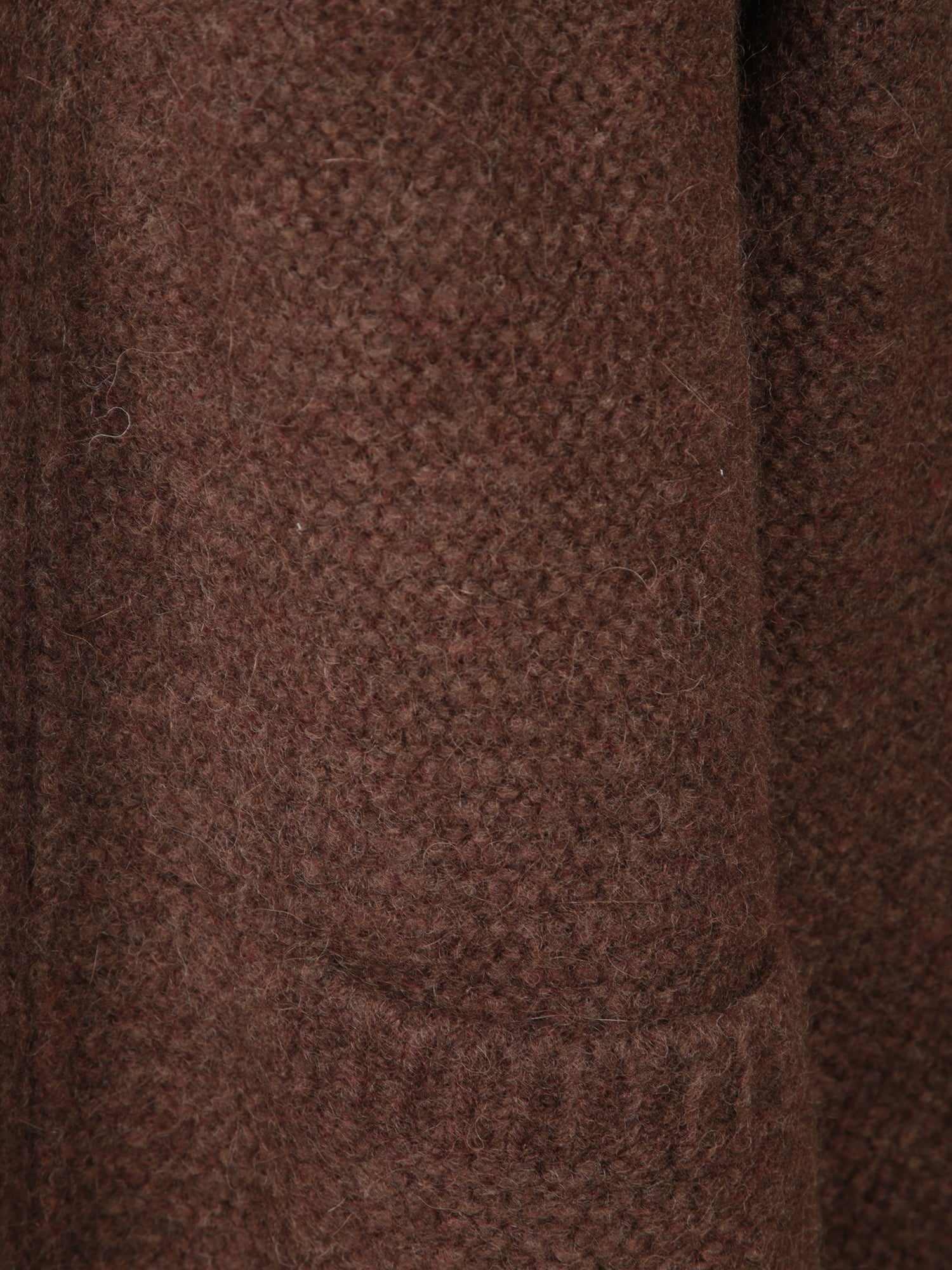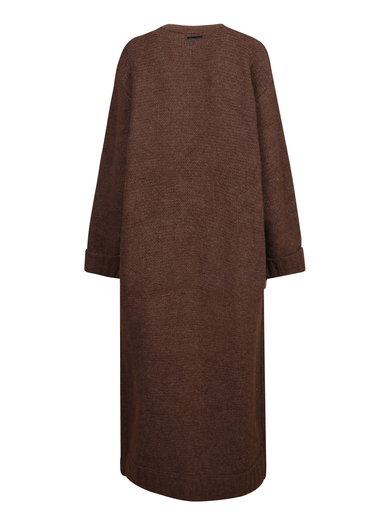Long open-front cardigan with patch pockets and ribbed cuffs.