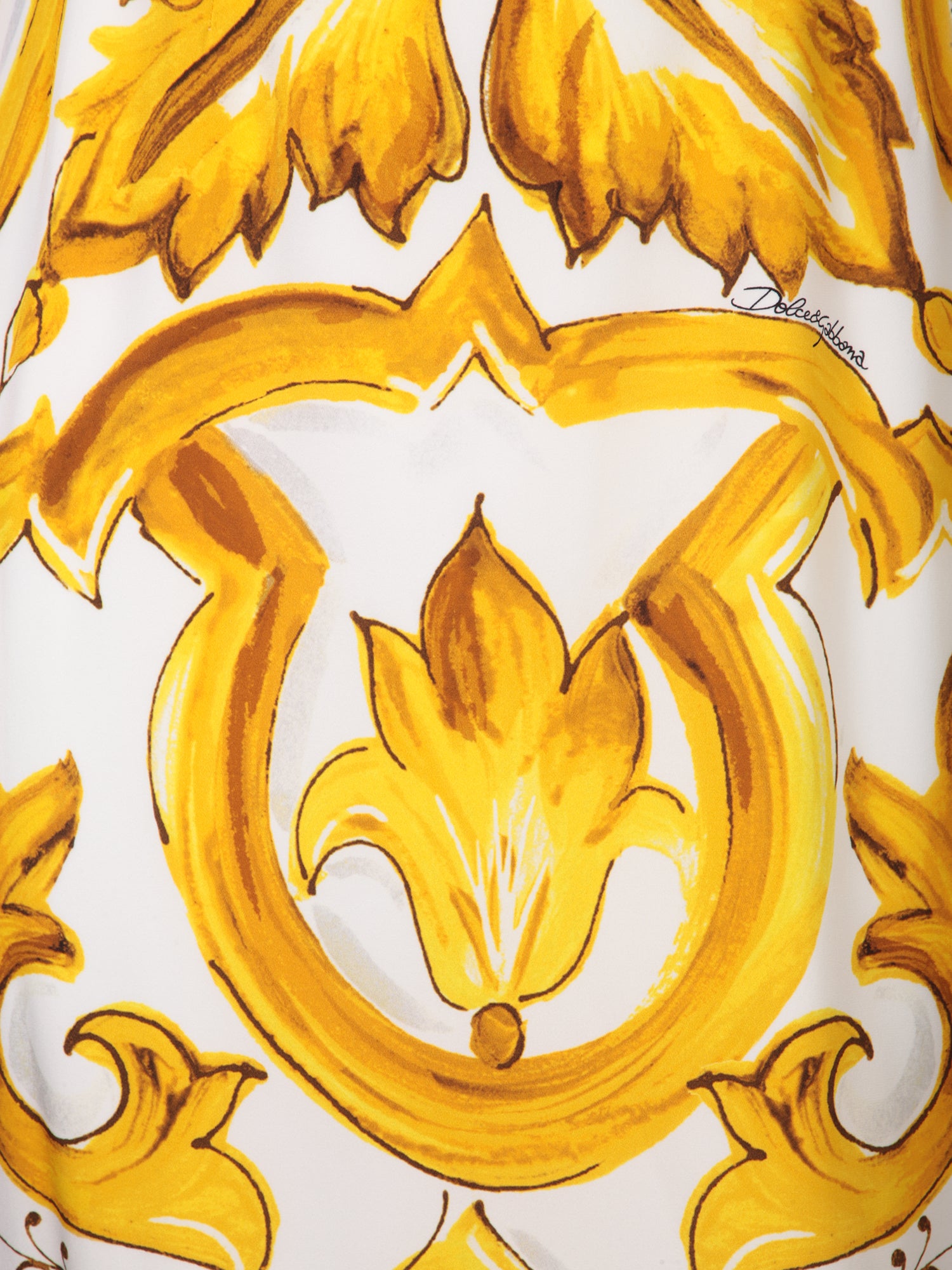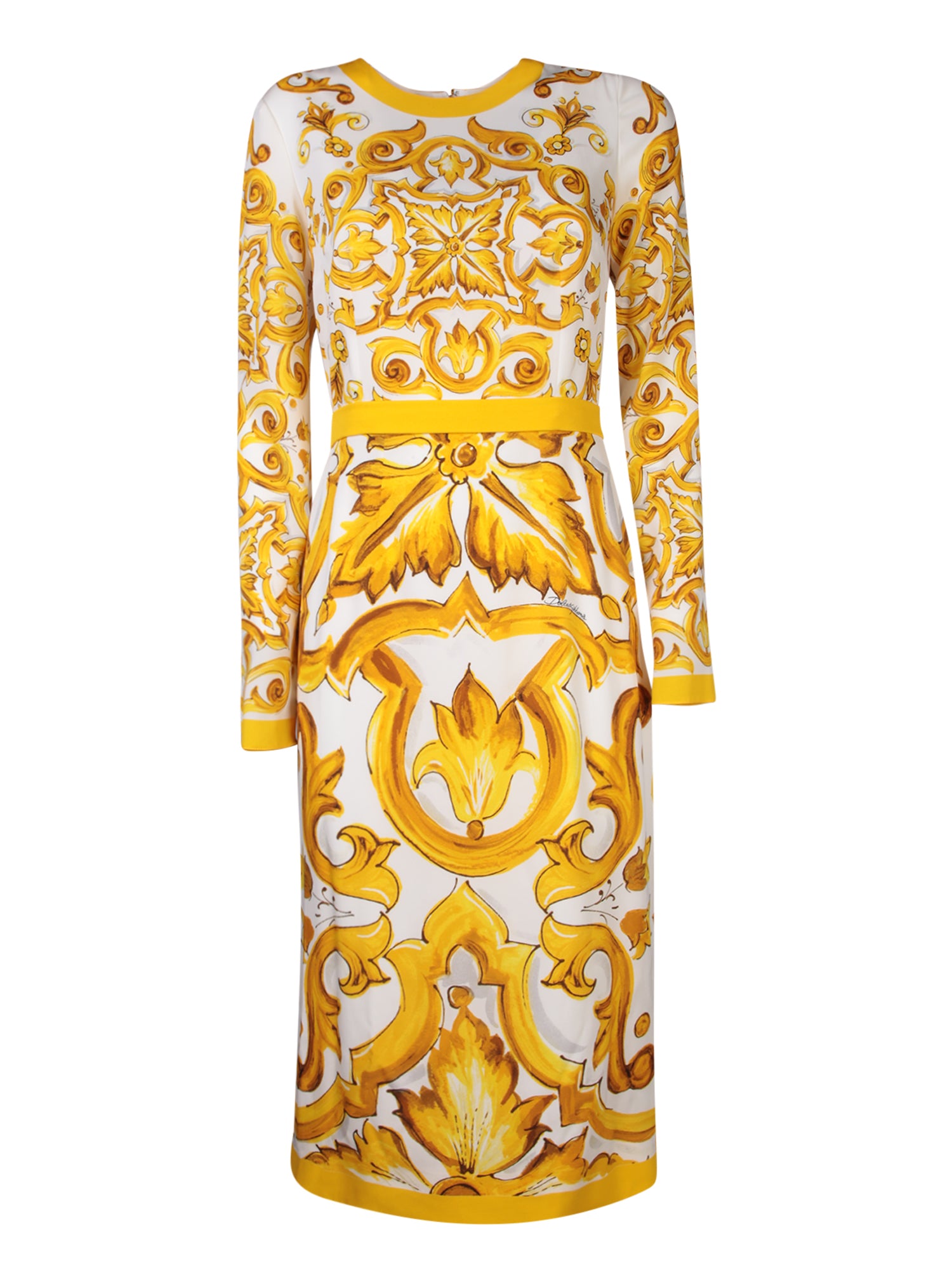 This elegant Dolce & Gabbana dress features a maiolica pattern inspired by classic Italian ceramics, complemented by a yellow belt that enhances the silhouette.