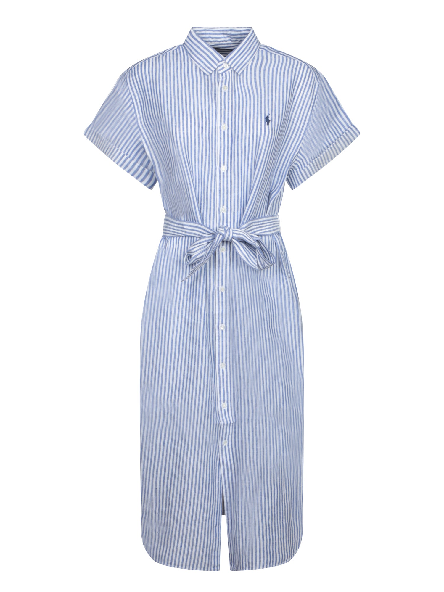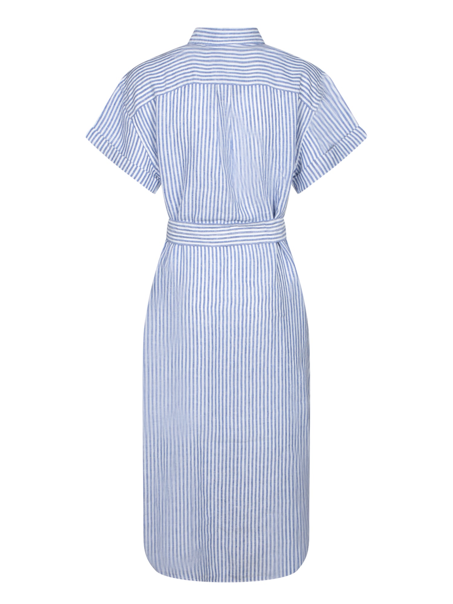 Striped linen dress with shirt collar, short sleeves, and fabric belt.
