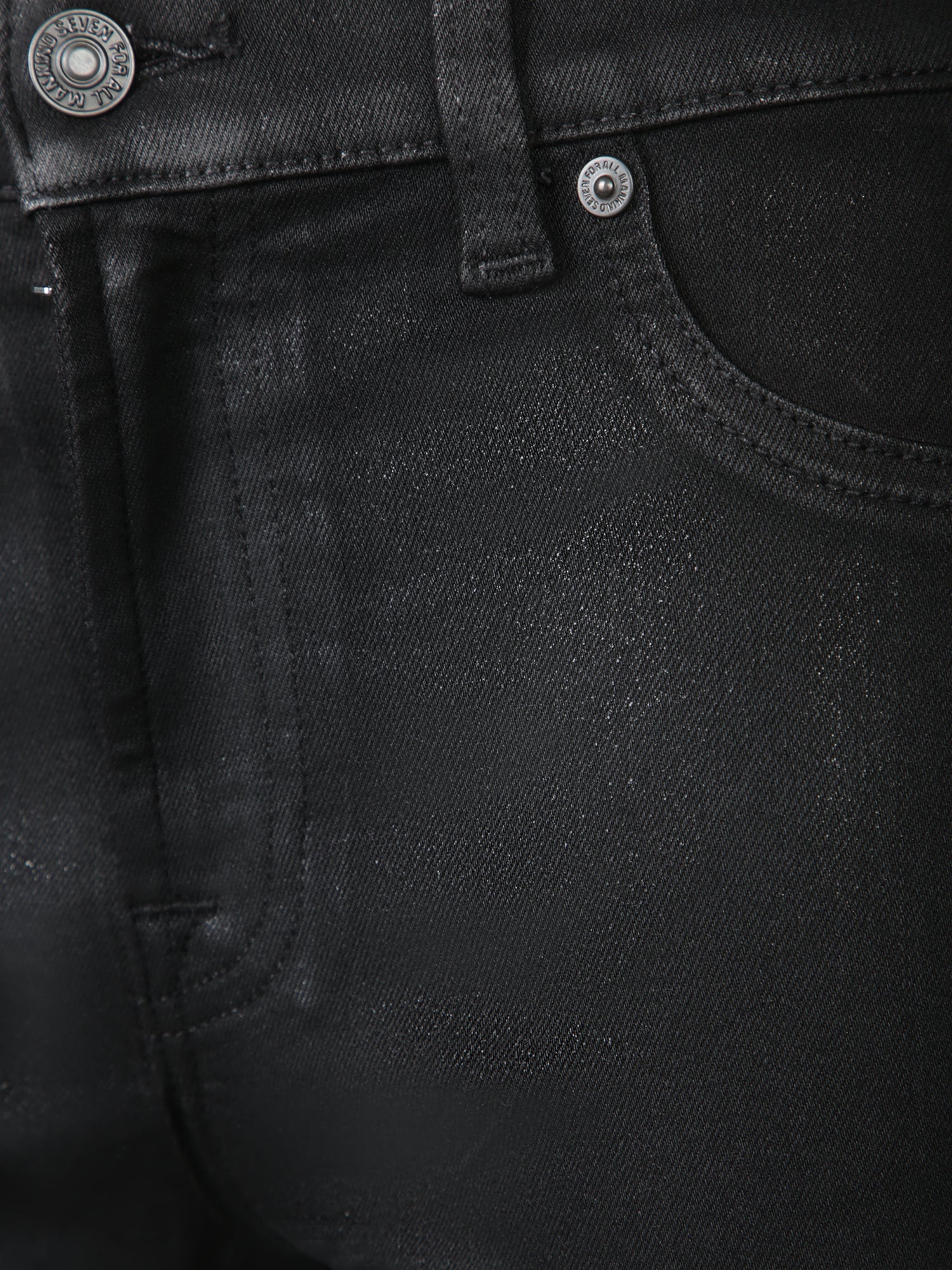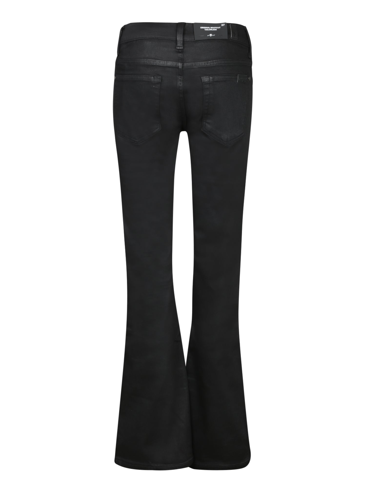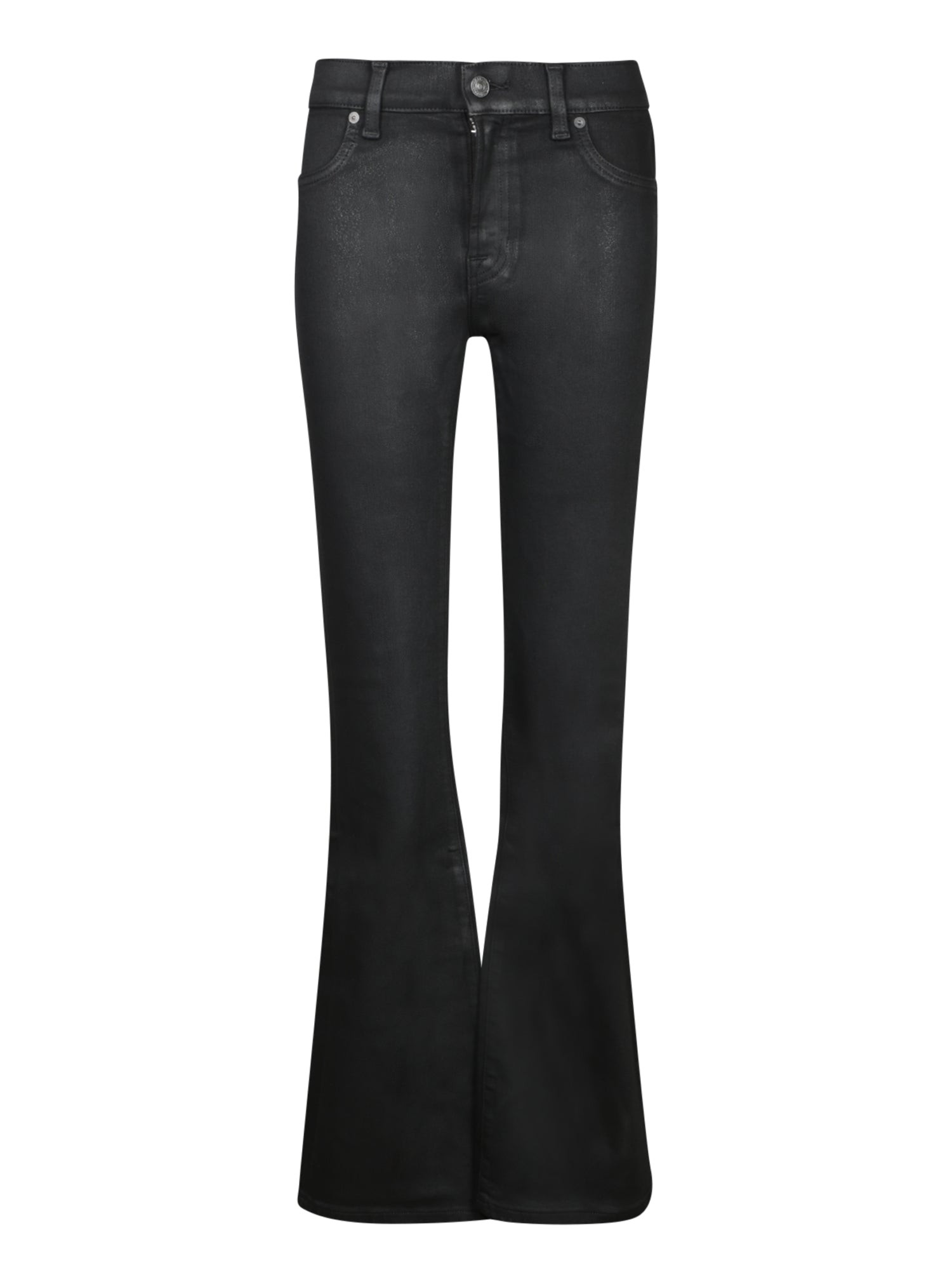 Flared jeans with a black coating. Regular waist and closure with zipper and button.