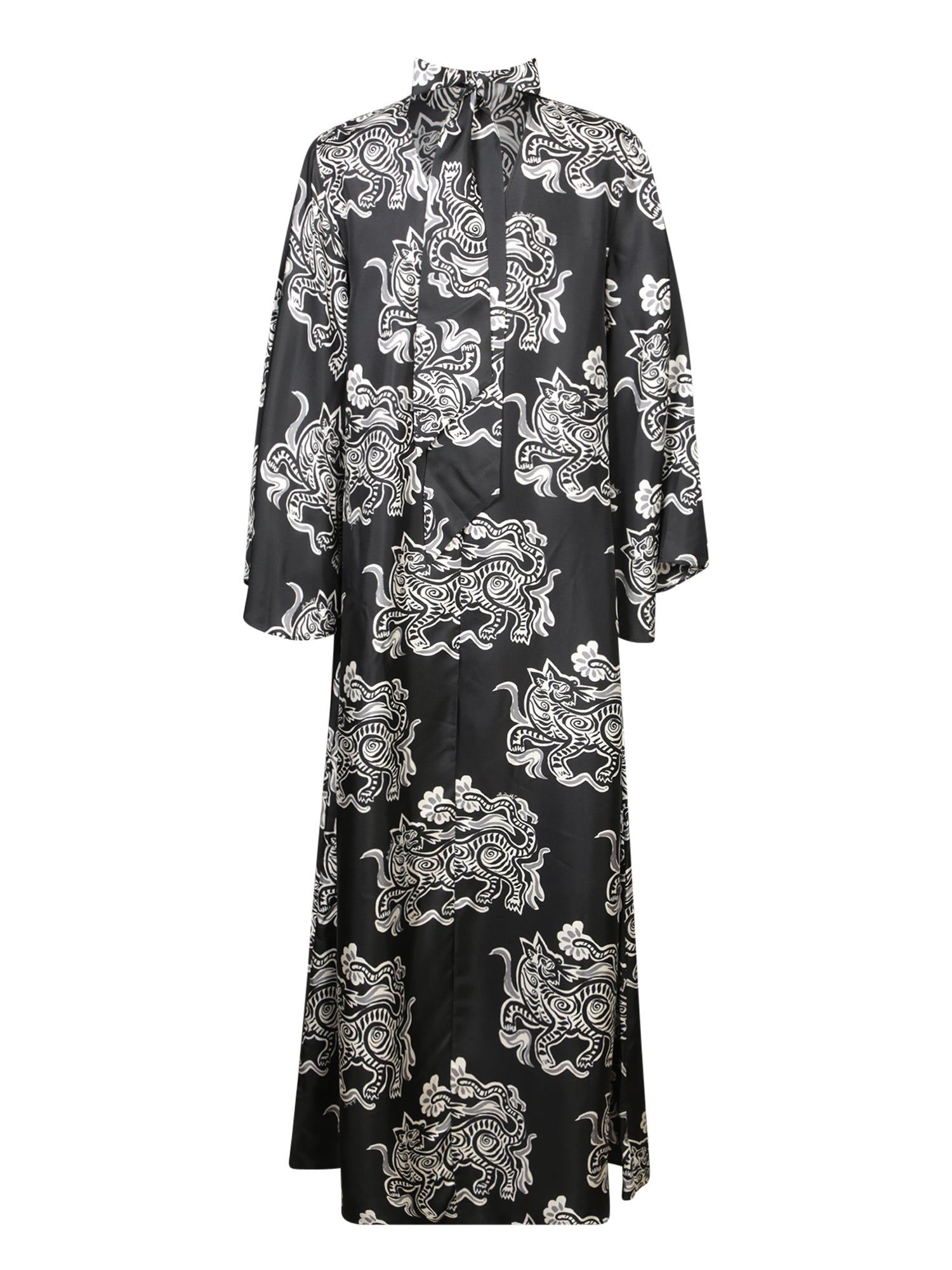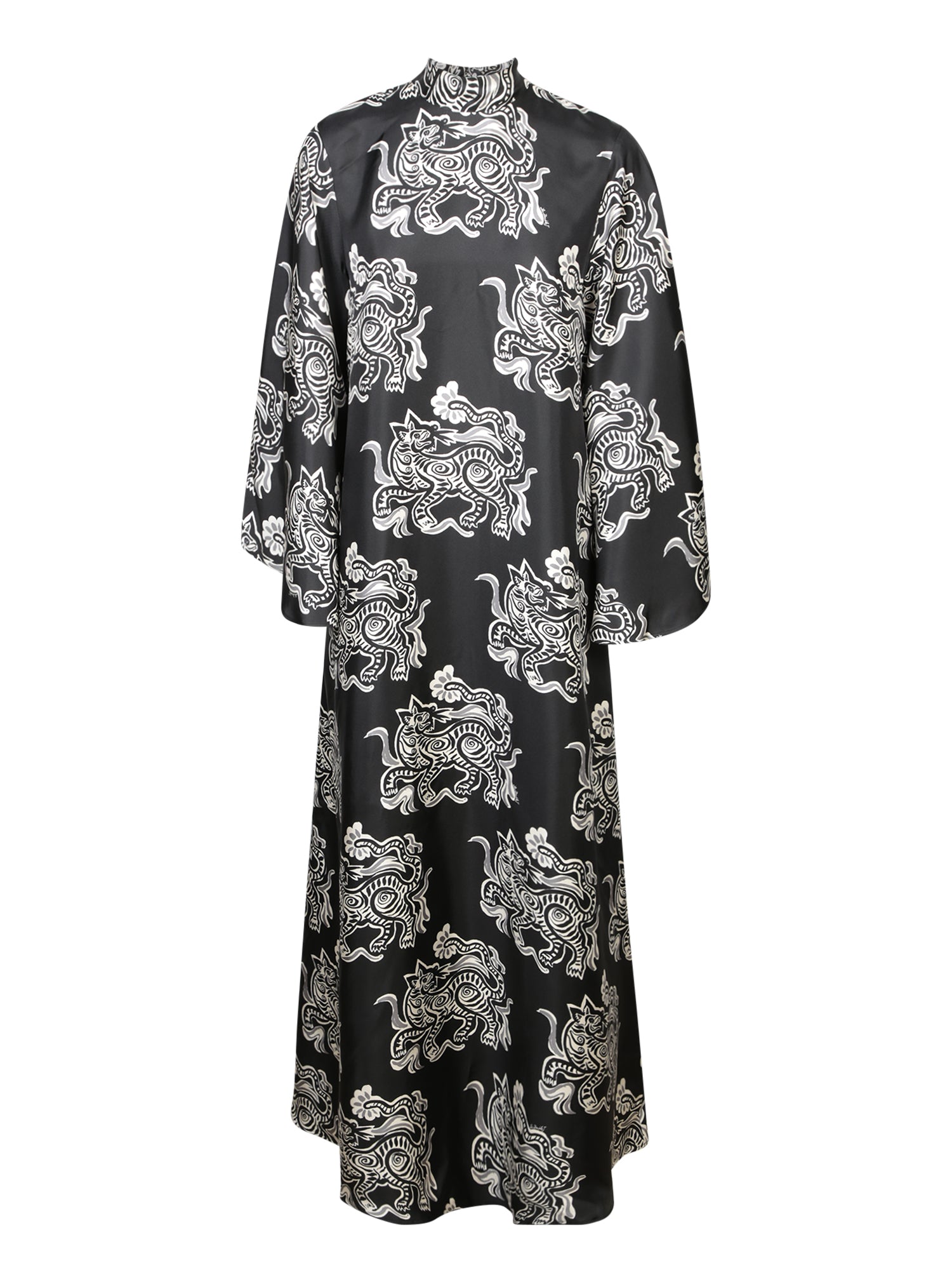 Long silk dress with baroque print. Long sleeves, high collar, and back zip closure.