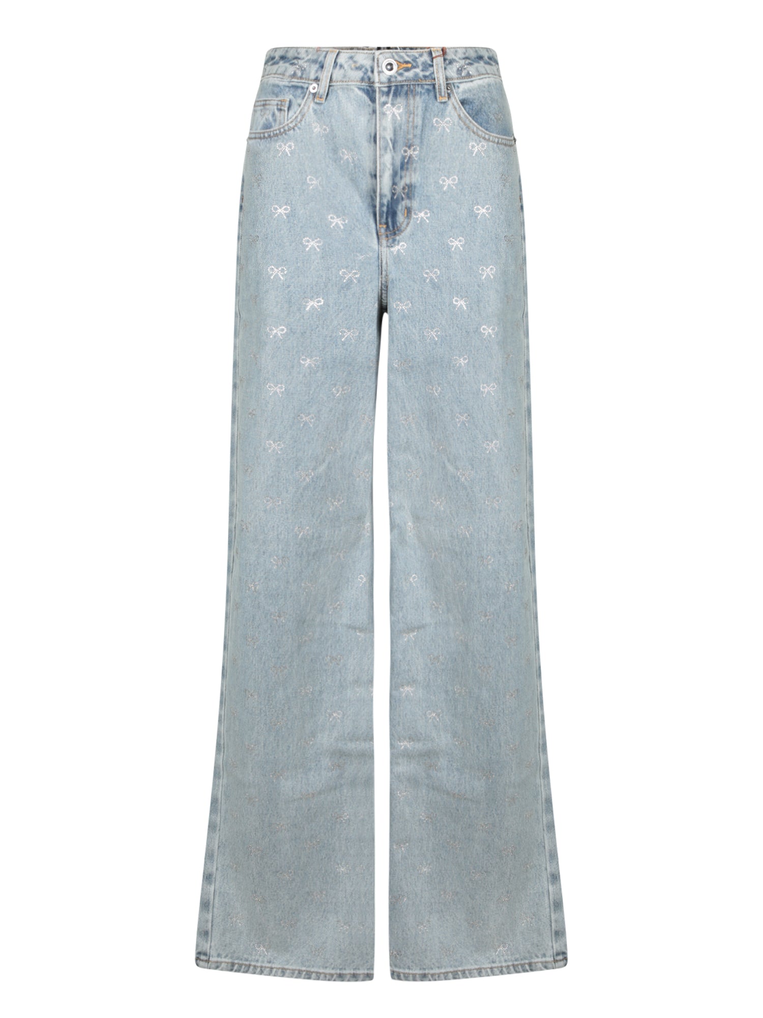 Flared jeans with a light coating, zip and button closure, five pockets.