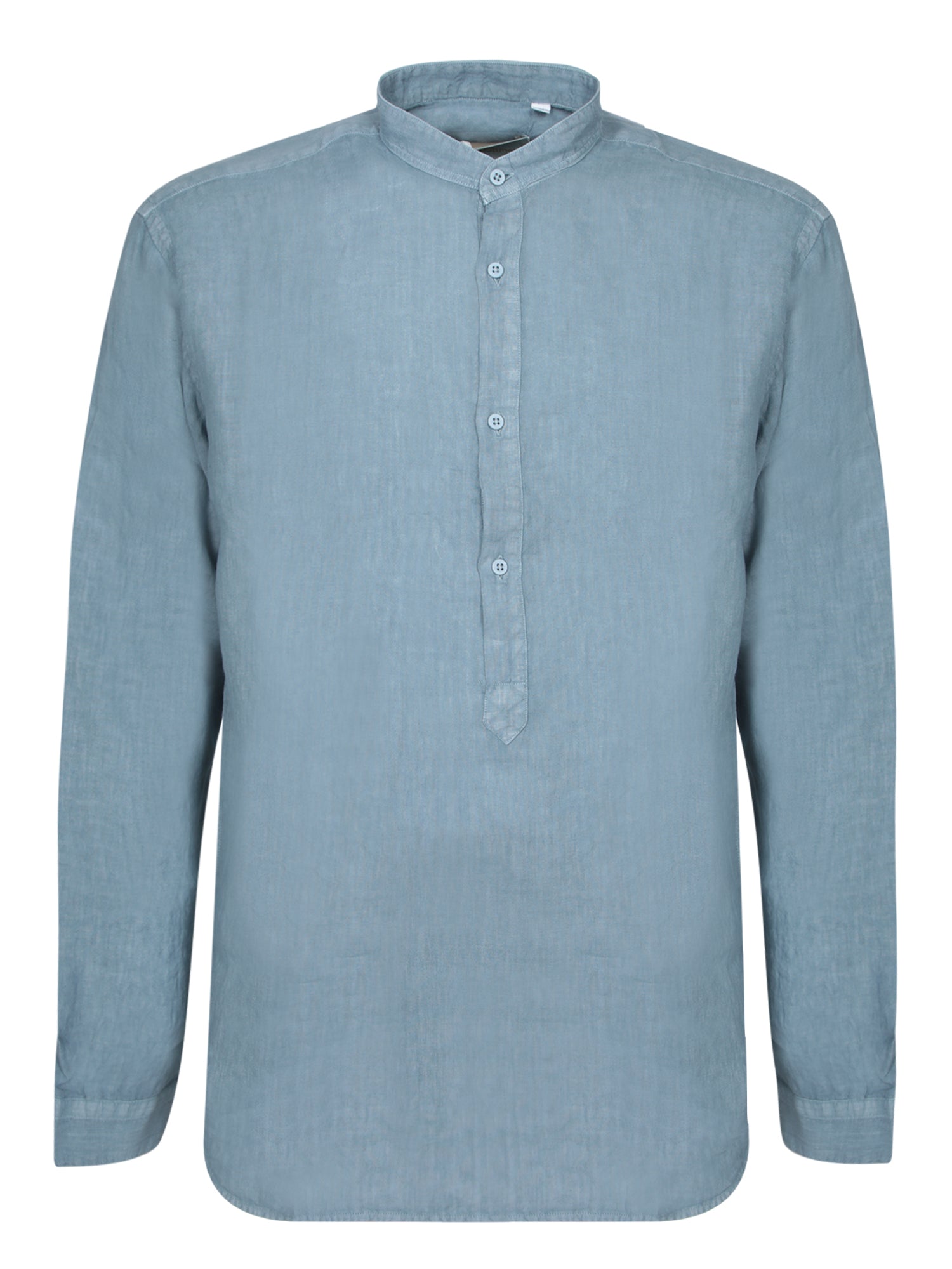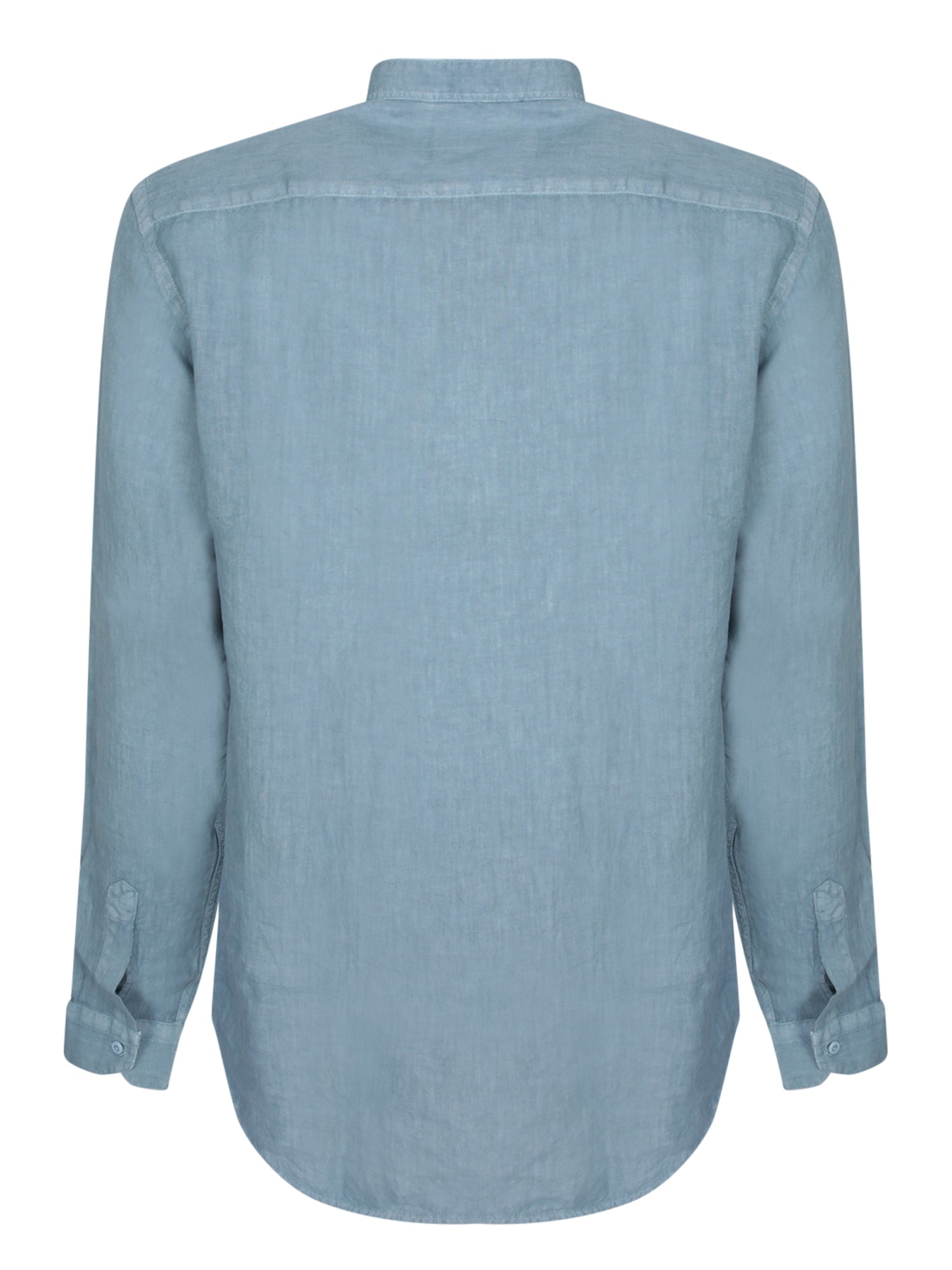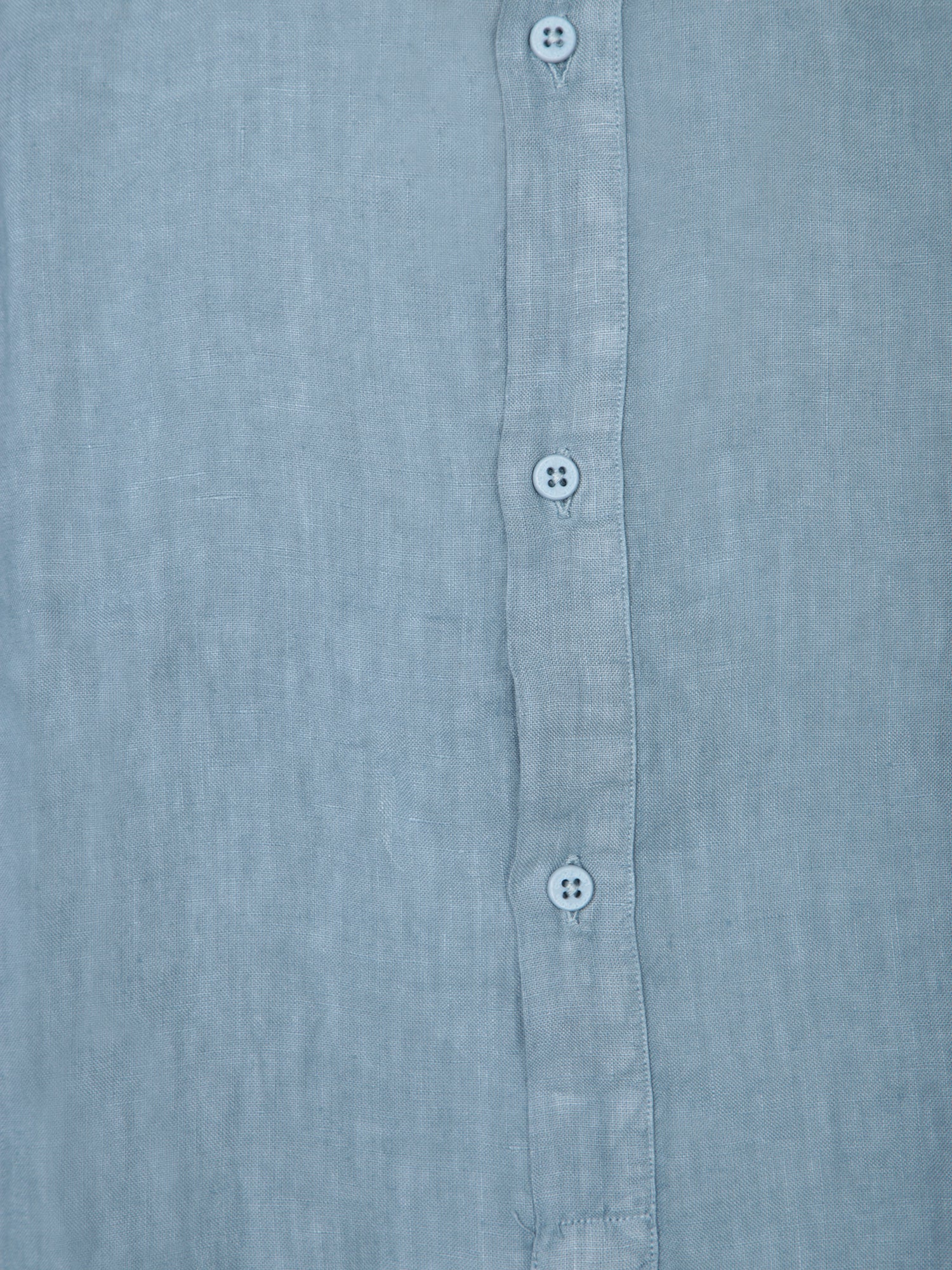 Elegant pure linen light blue shirt, ideal for a casual-chic look. Tailored details like the mandarin collar and minimalist cut enhance the fabric's natural elegance.