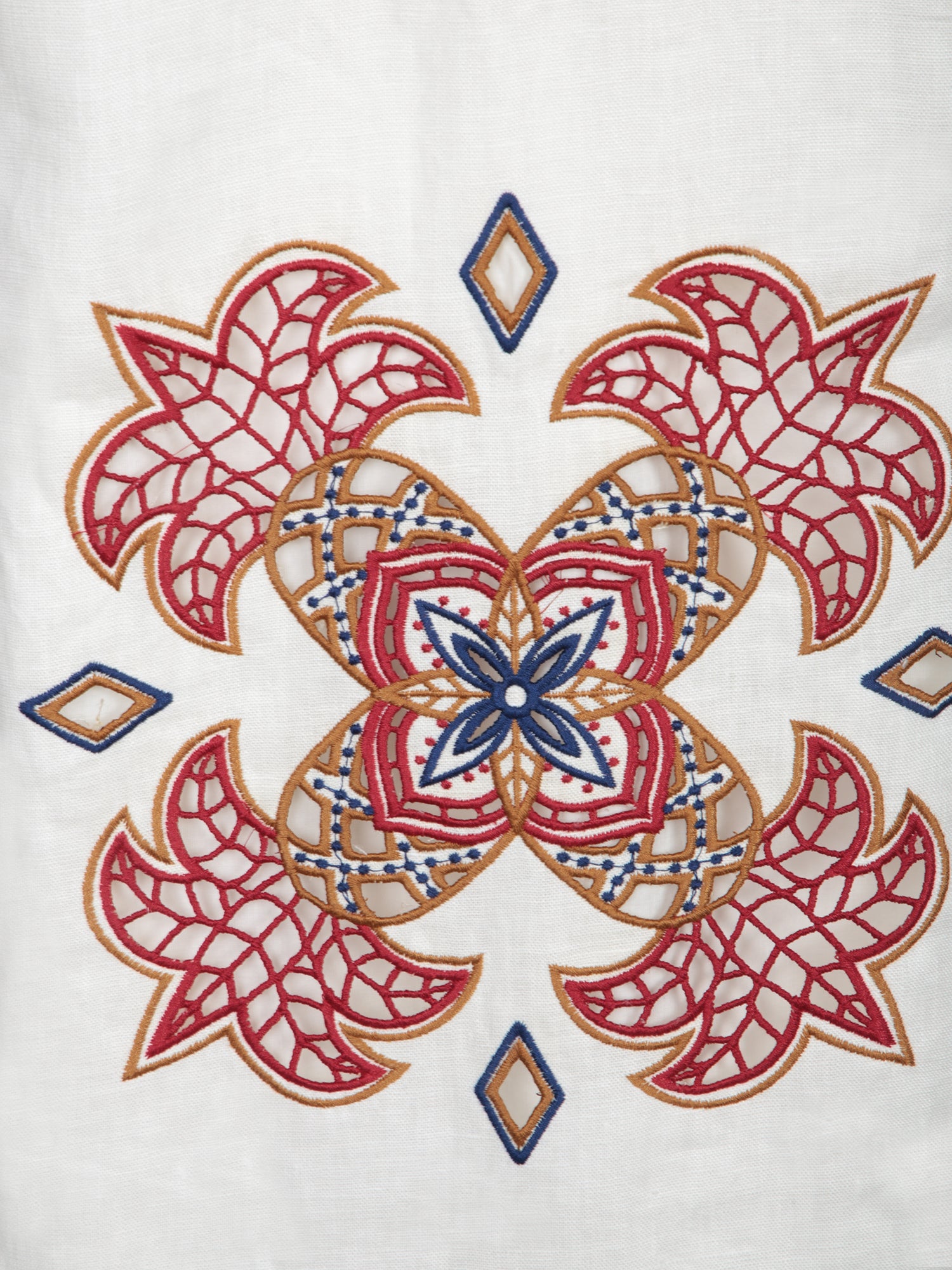 This Farm Rio midi dress captivates with its intricate multicolored embroidery, inspired by traditional design. The sleek silhouette and red trim detailing enhance an elegant and sophisticated look.