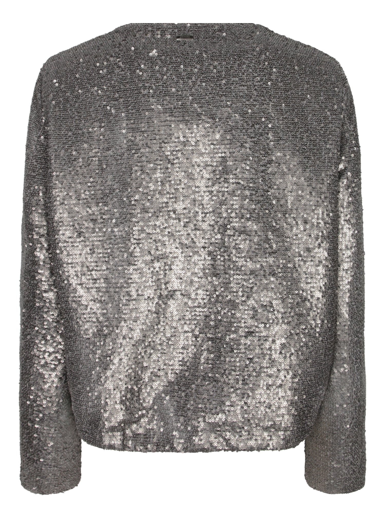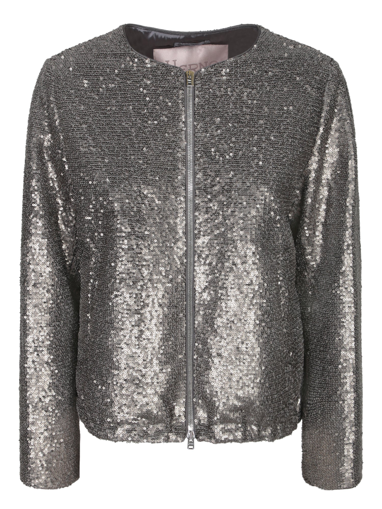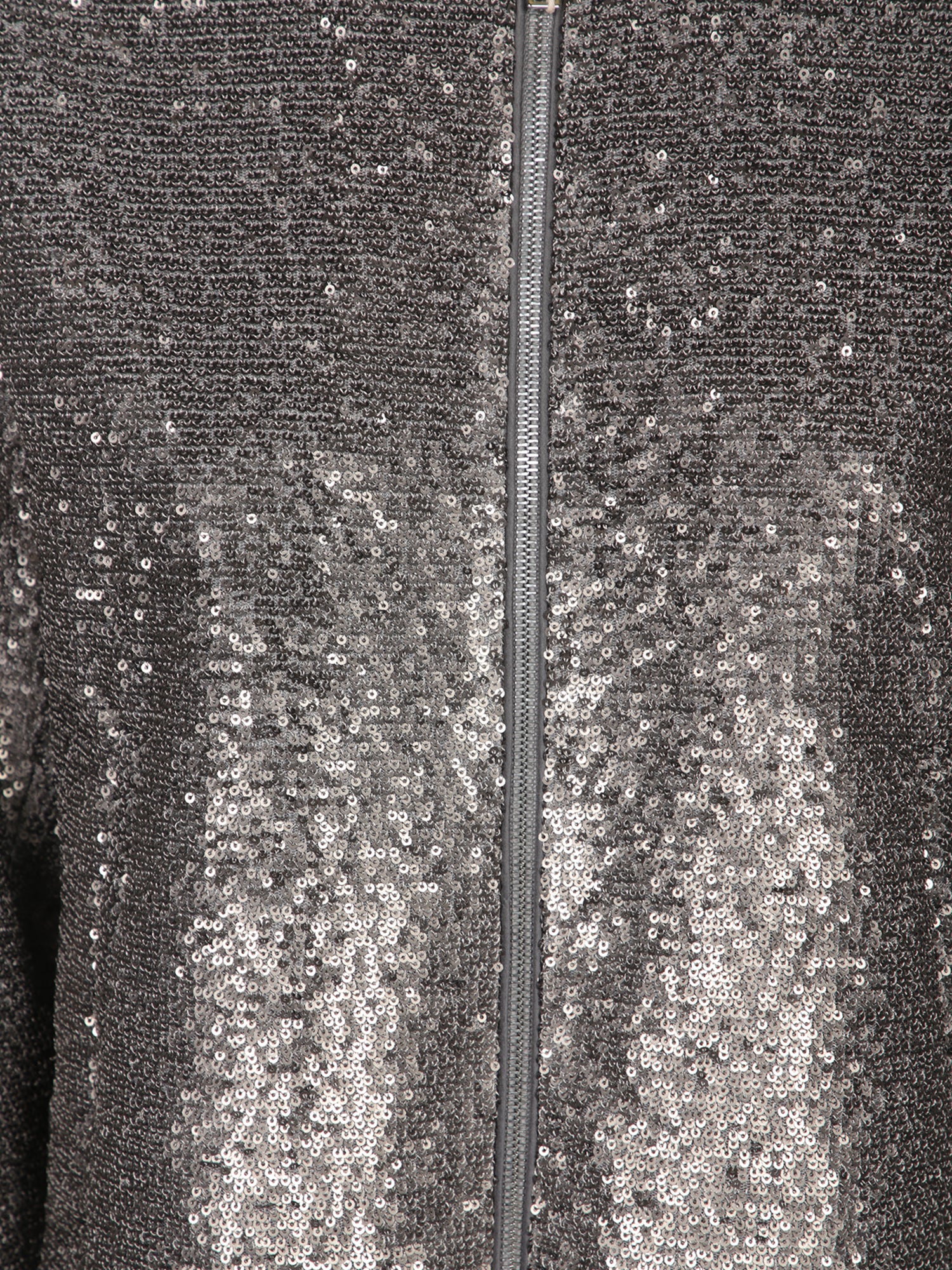 Sequined jacket, long sleeves, front zip, dark grey fabric.