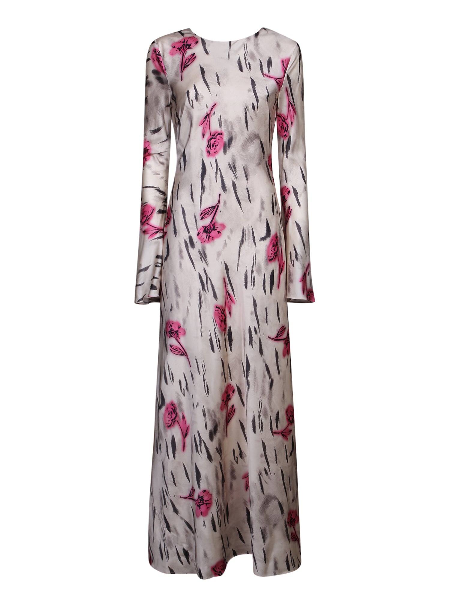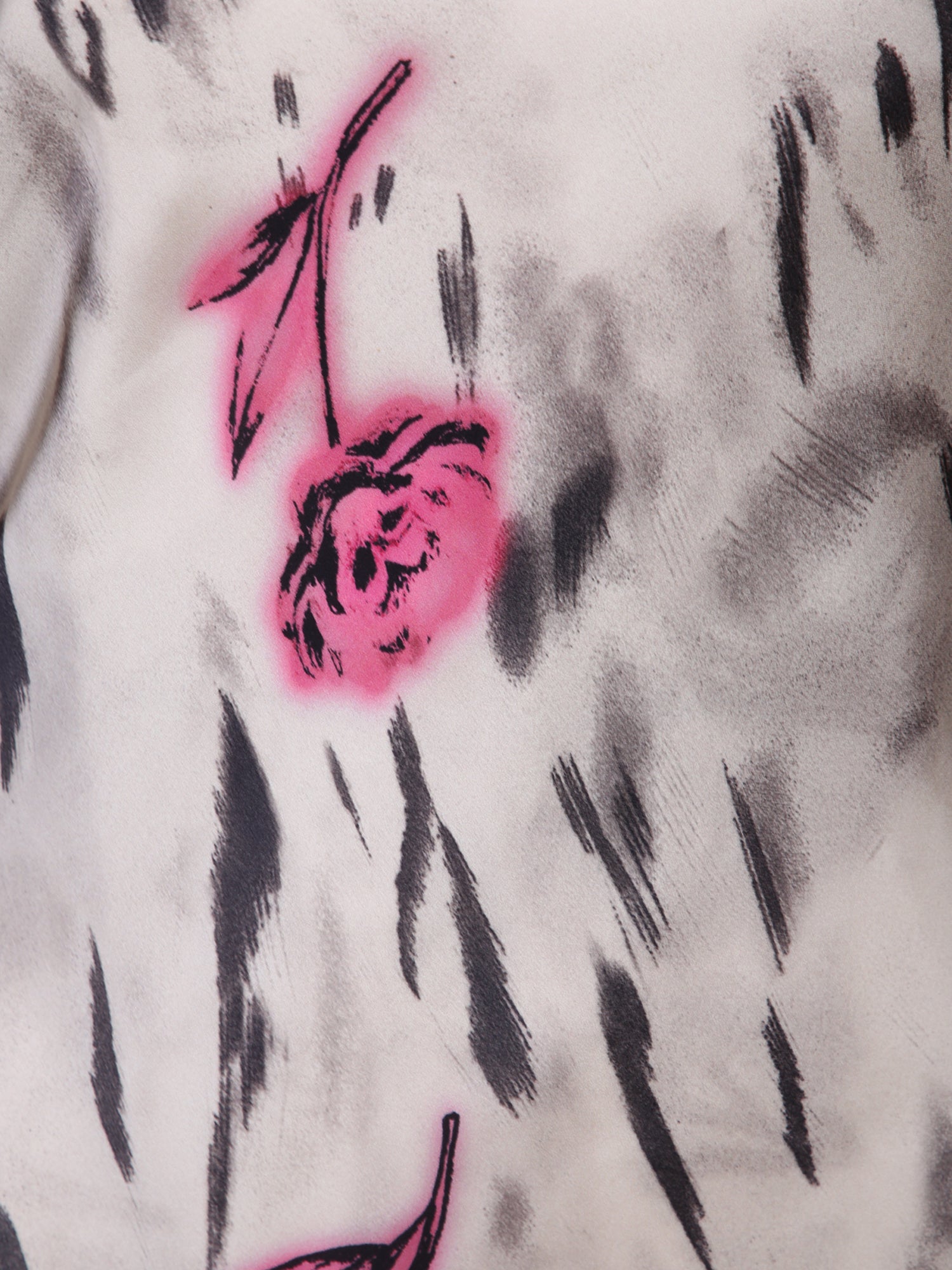Long sleeves. Satin fabric. Pink floral print on an ivory background.