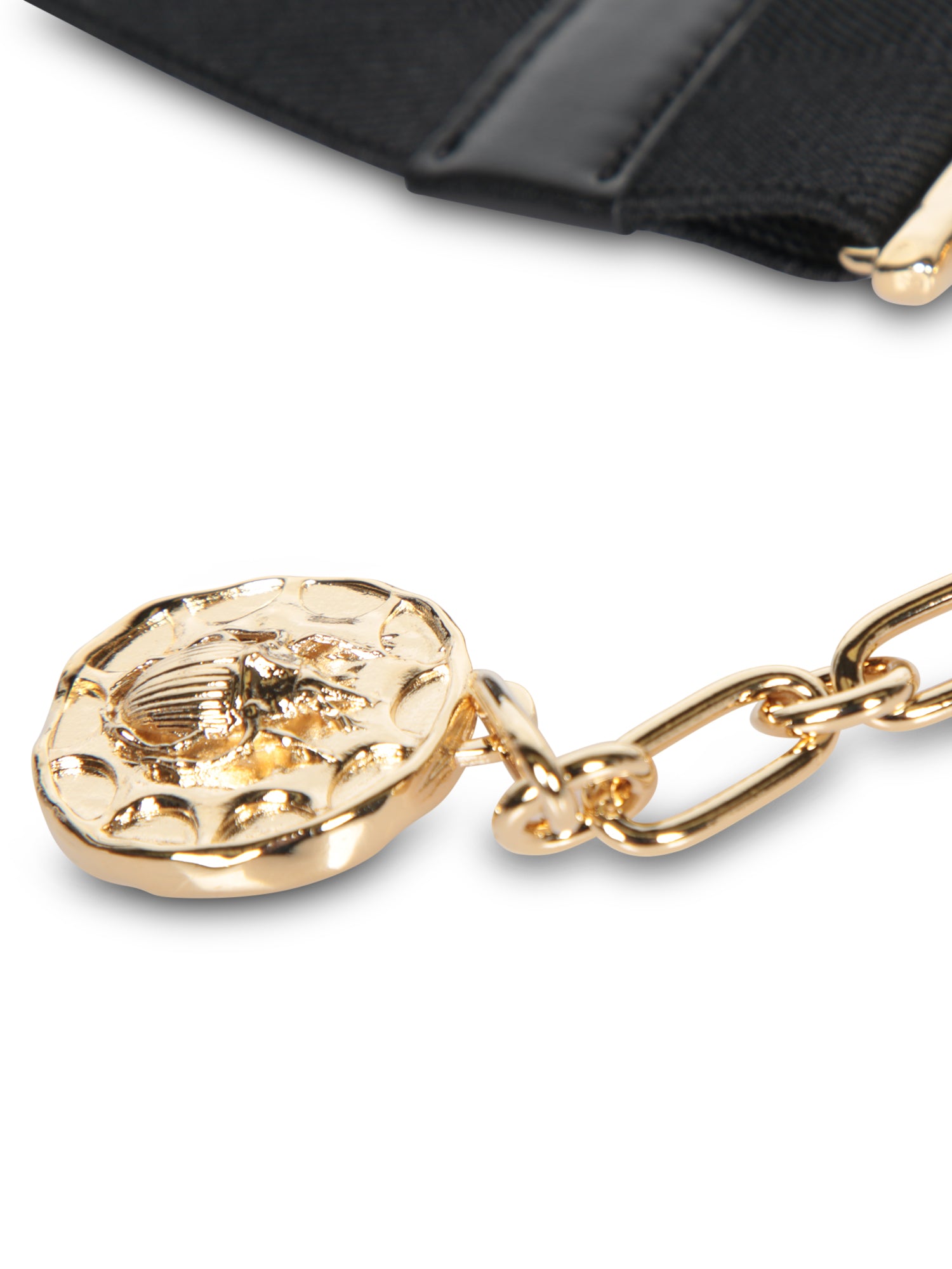 Black fabric belt with golden metallic details and a hanging chain.