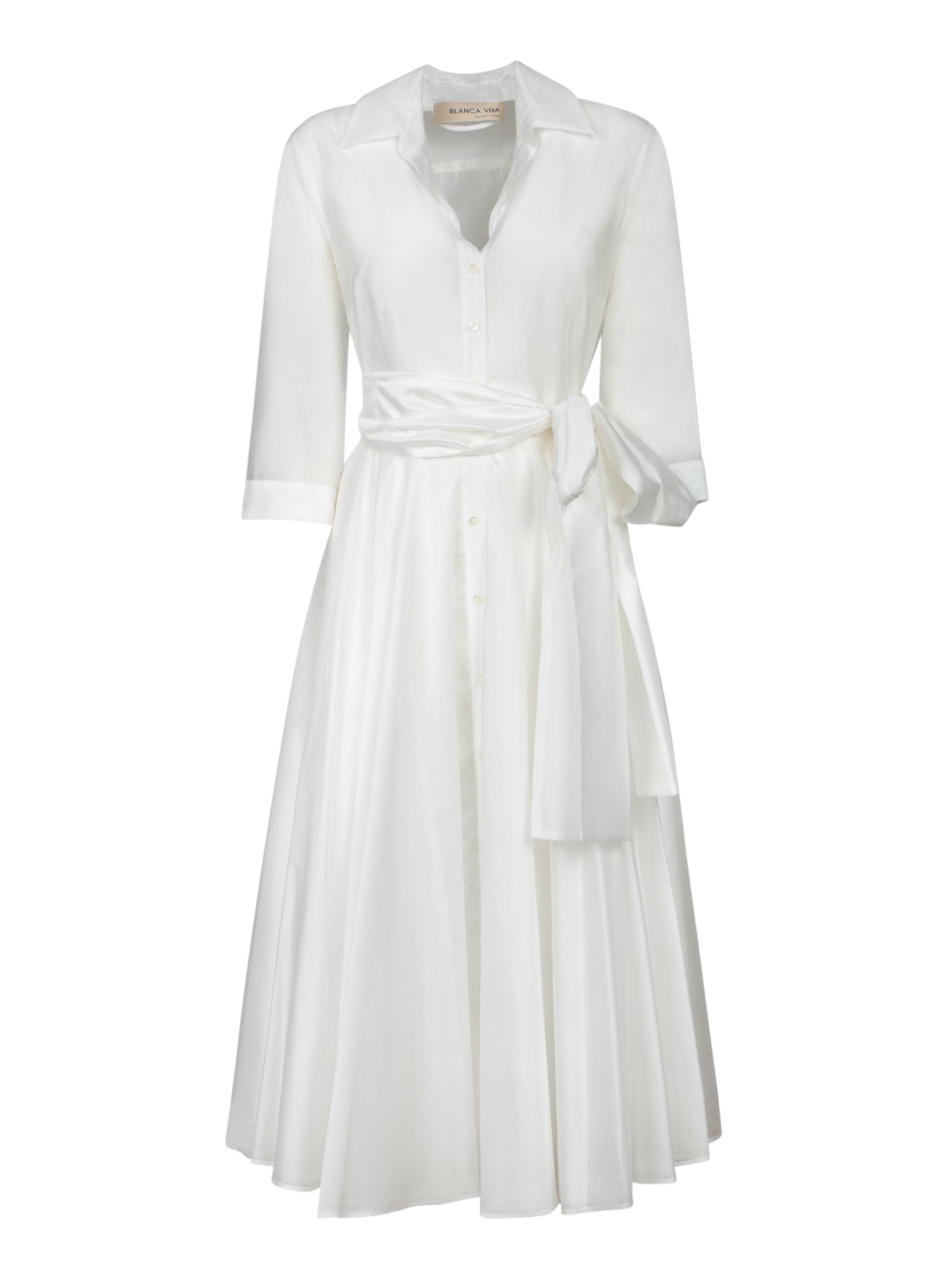 Elegance and refinement blend in this Blanca Vita dress, featuring a translucent fabric that highlights its lightness. The silhouette is enhanced by a wrap-around belt, ideal for defining the waist.
