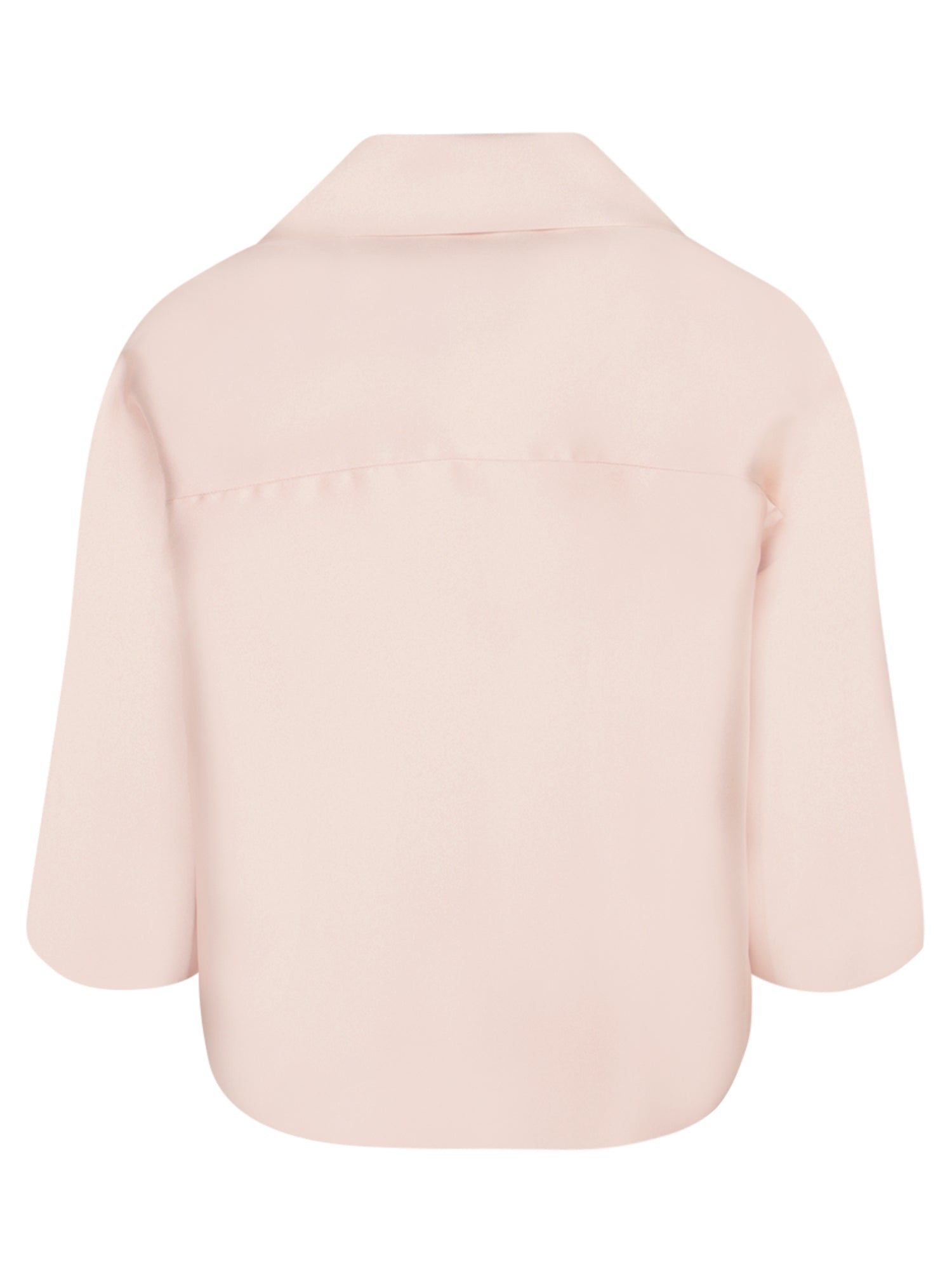 Tailored jacket with front opening, pointed collar, and three-quarter sleeves. Made from satin mikado fabric.