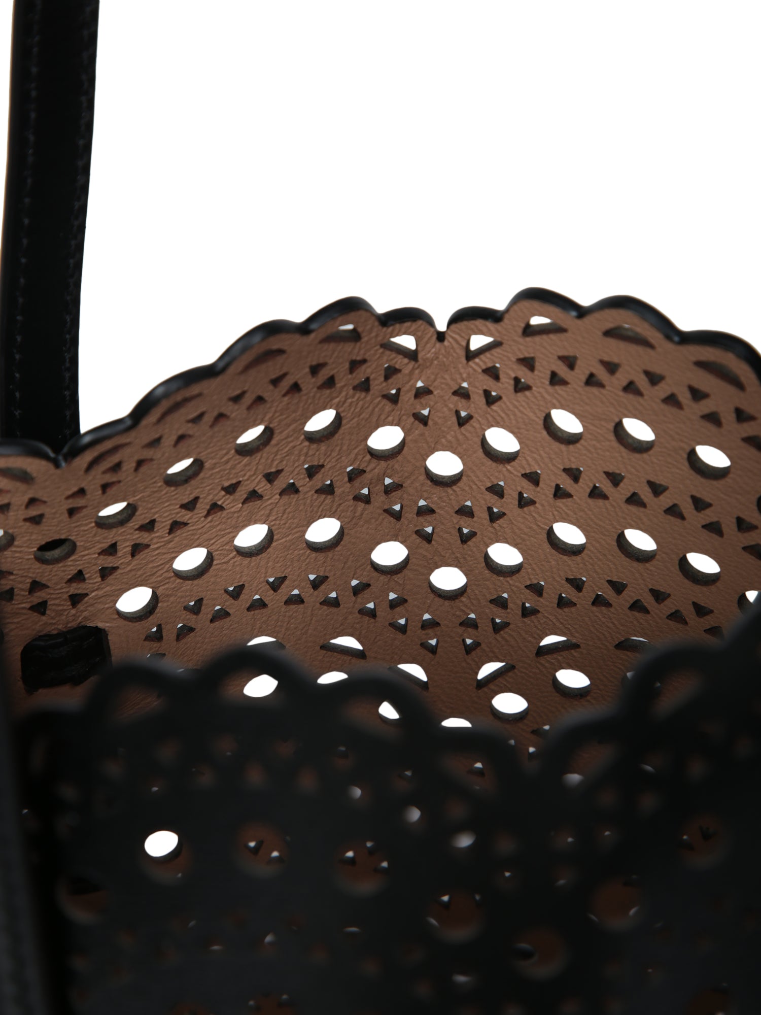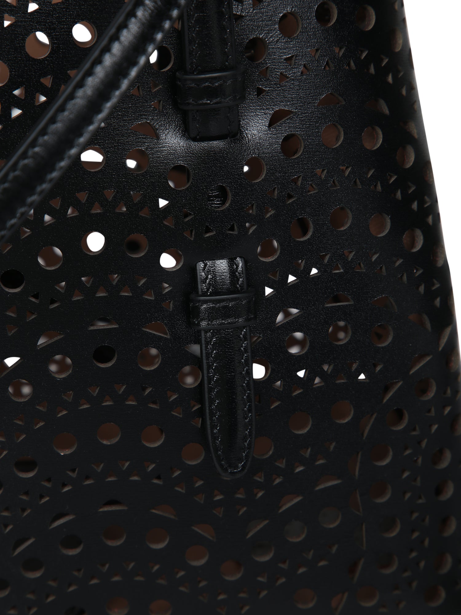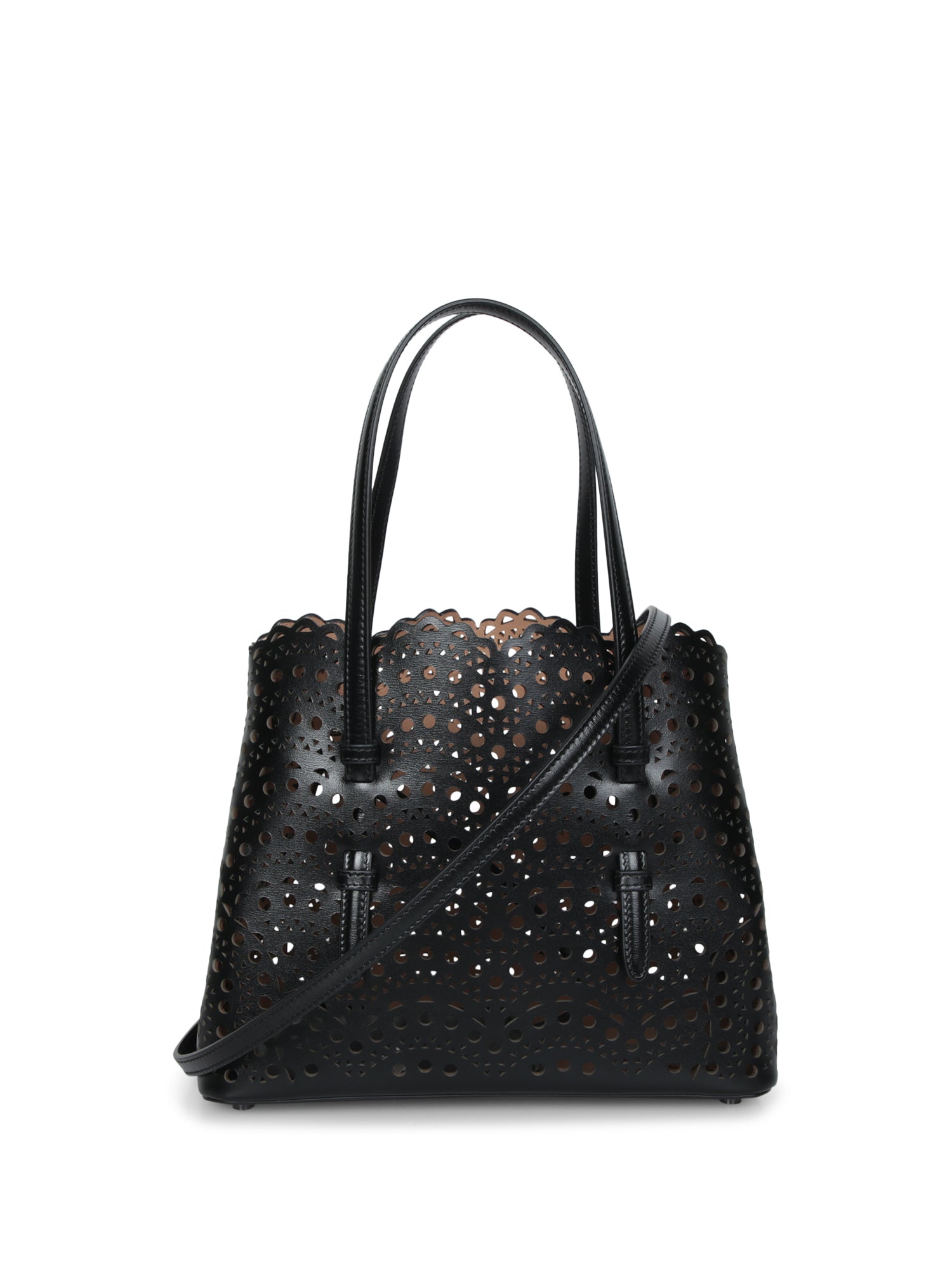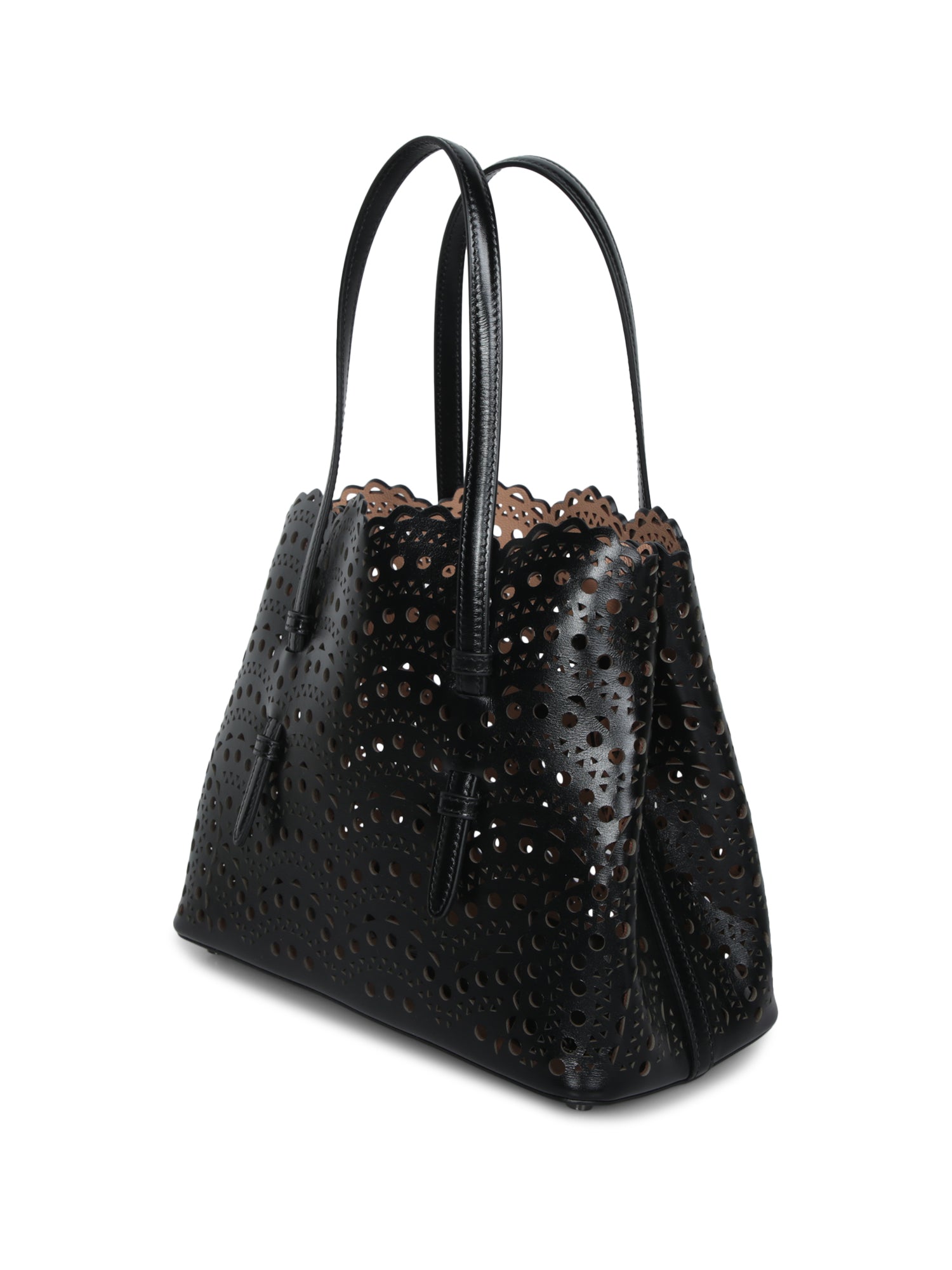 A masterpiece in finely perforated black leather that is both practical and chic. Alaïa's Mina 25 Bag features a structured shape with discreet stitching for a flawless finish. With spacious interiors, it is perfect for daily necessities.