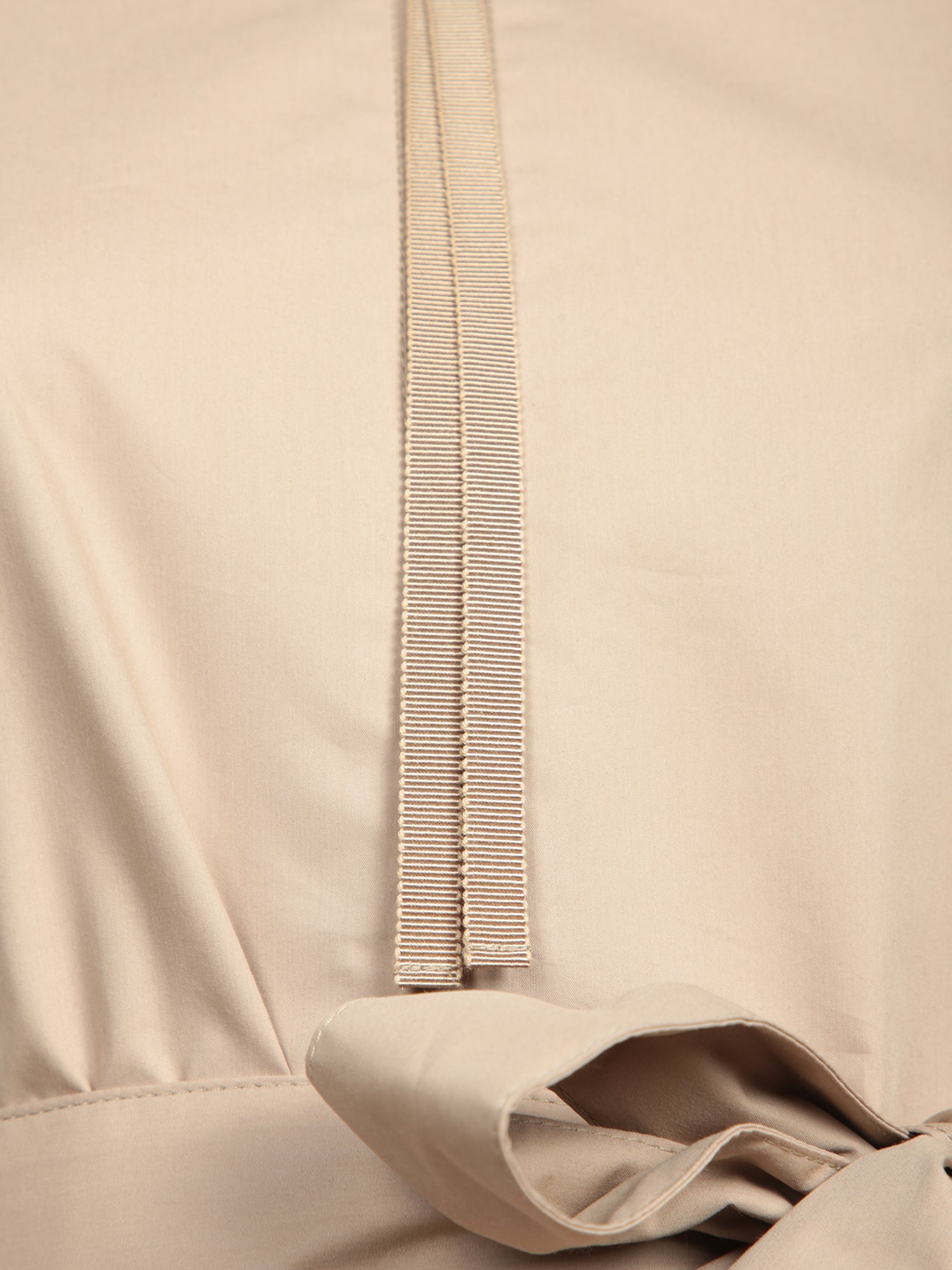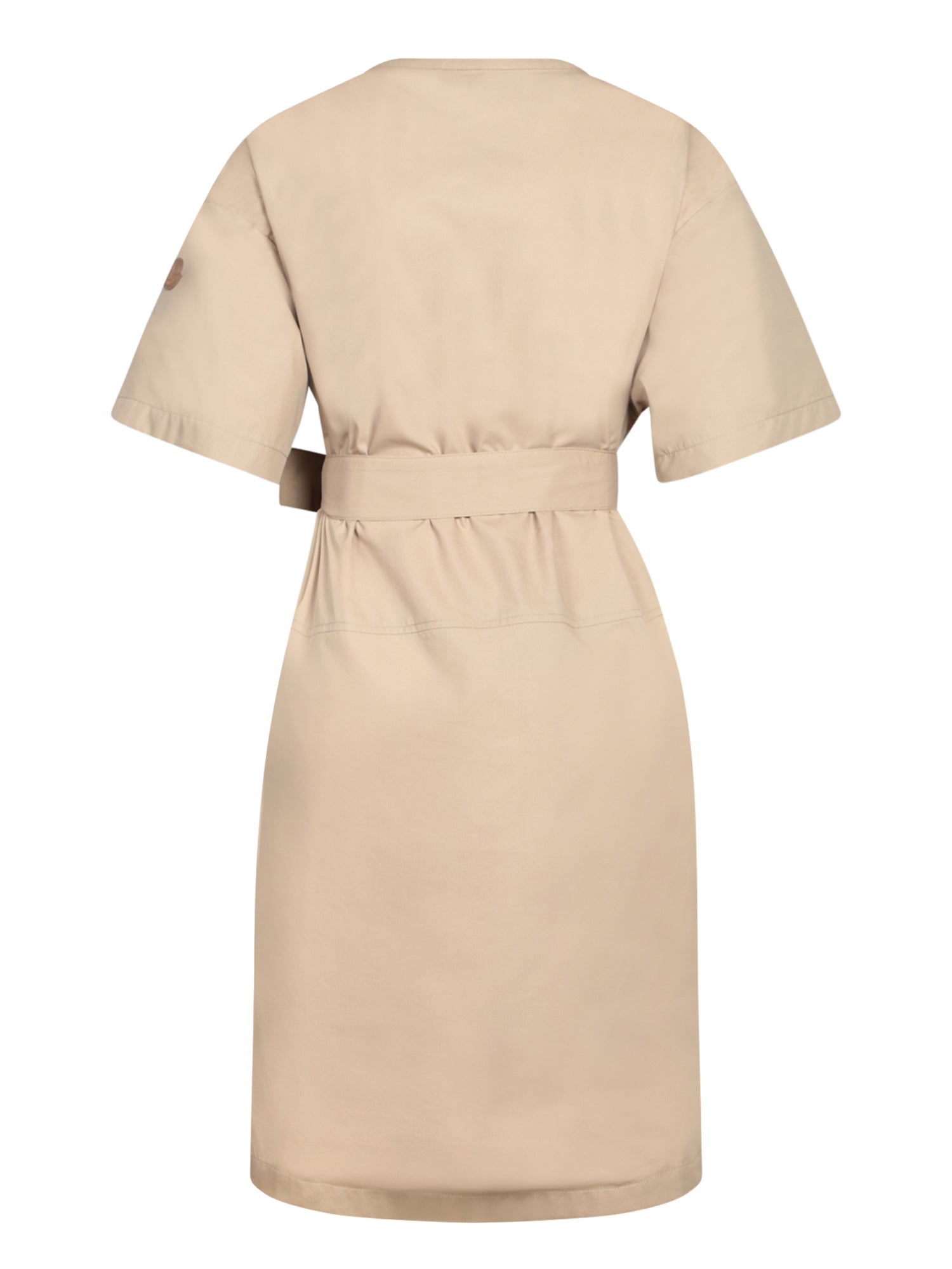 Beige dress with belt and front zipper. Short sleeves and round neckline. Refined finishes.