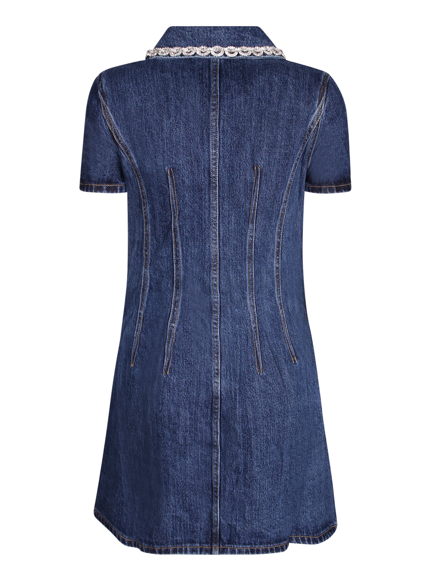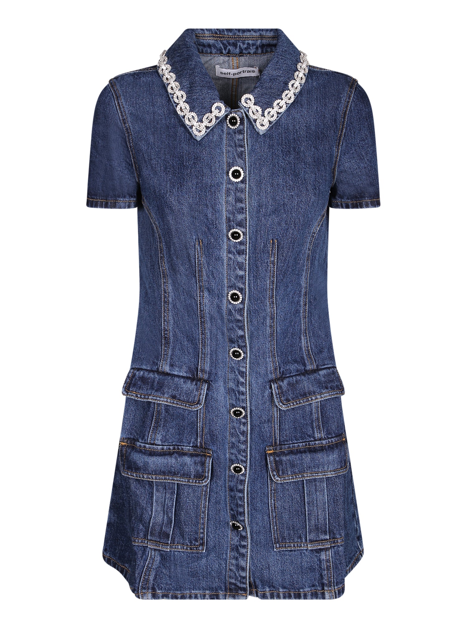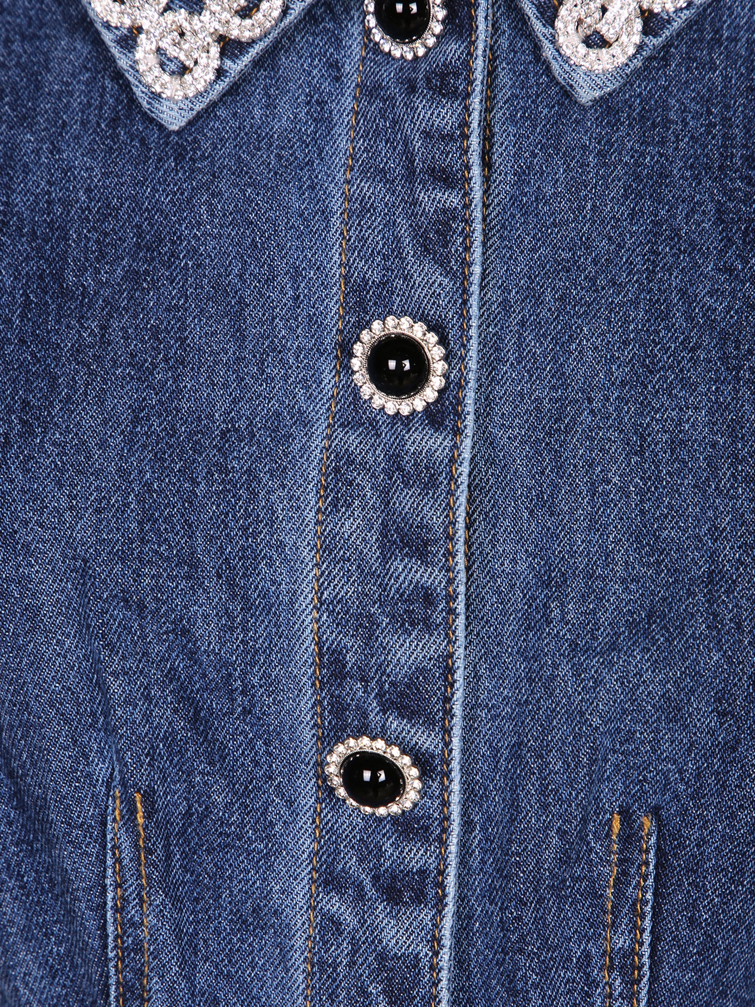 Short sleeves, crystal-embellished collar, front button closure, front patch pockets.