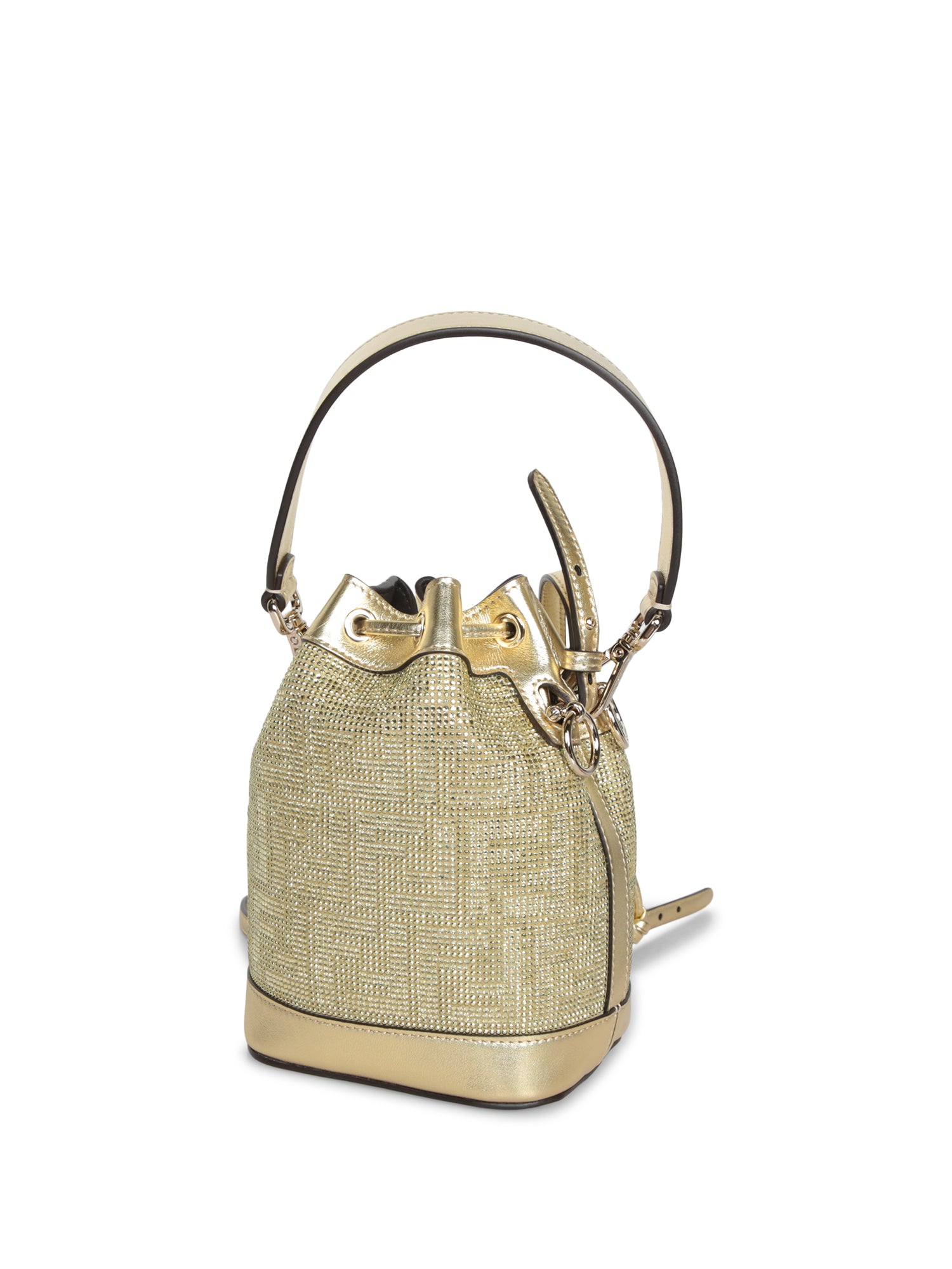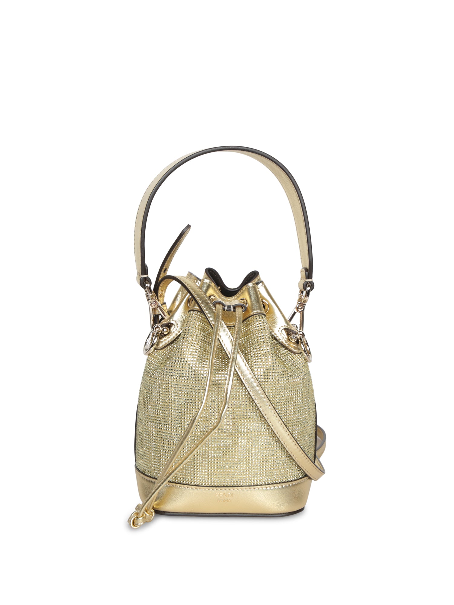 This elegant Fendi Mon Tresor bag features refined gold fabric, luxurious leather accents, and golden hardware adding a touch of class.