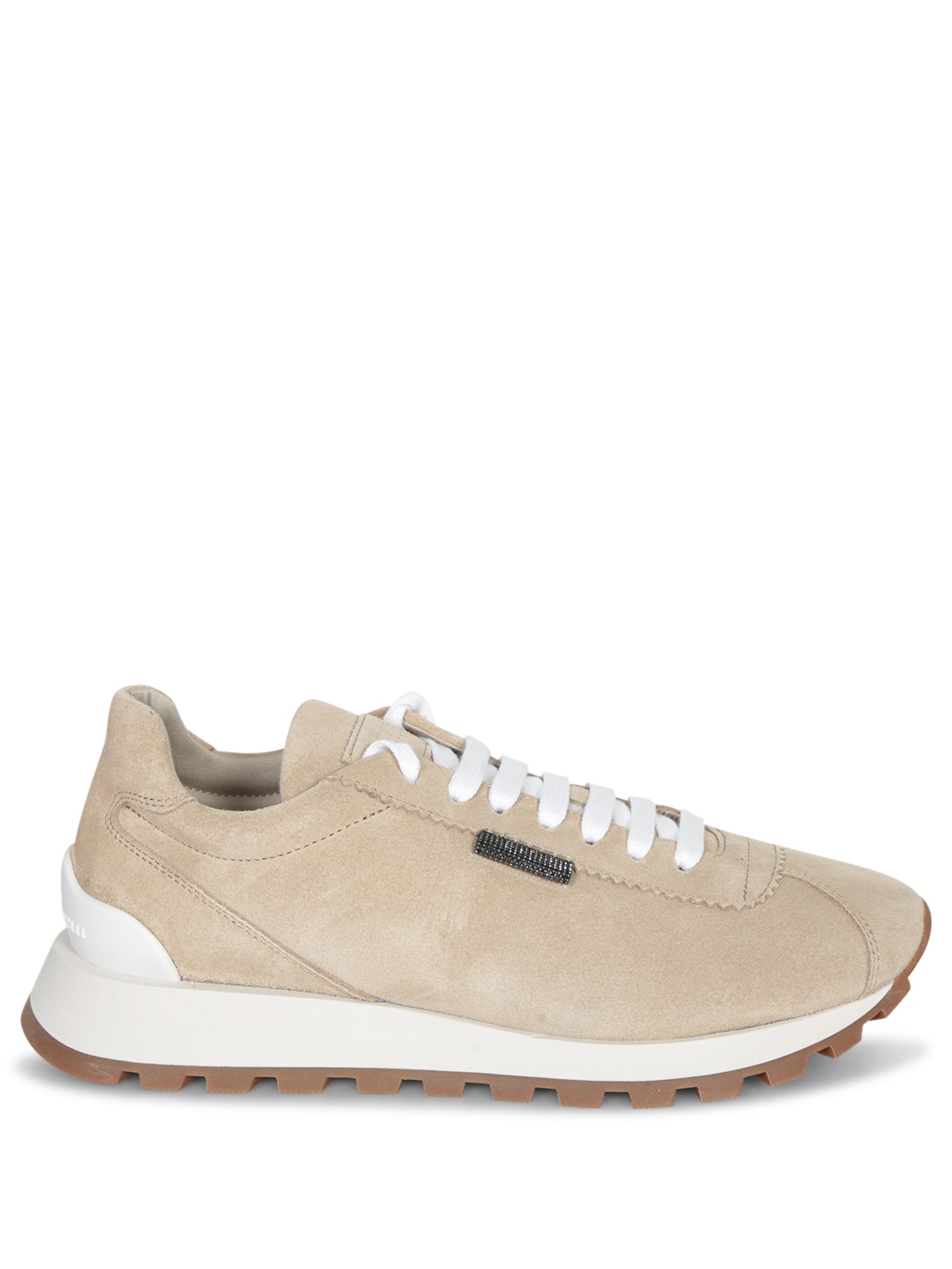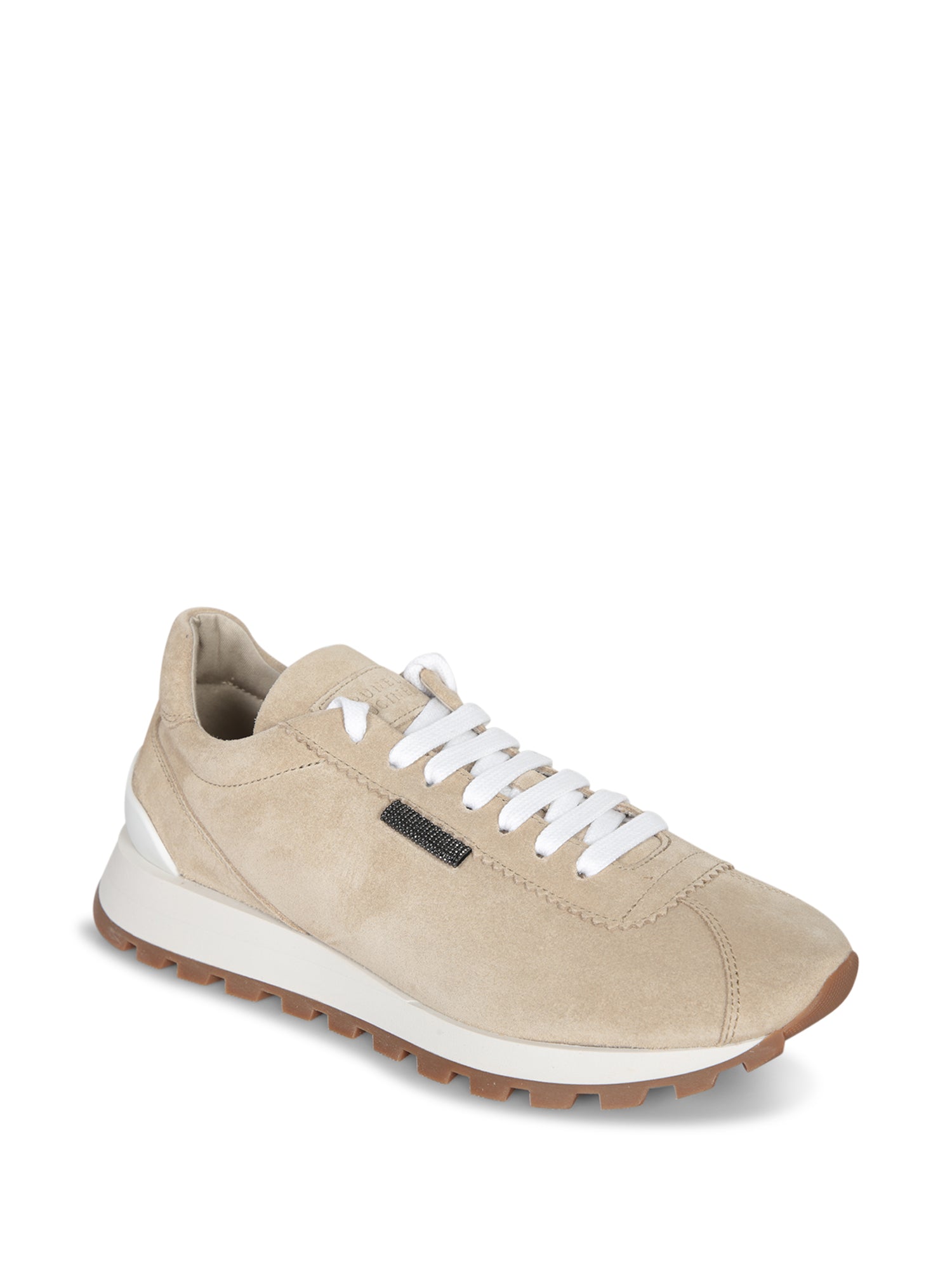 Beige suede sneakers. Monile detail design. White and brown rubber sole.