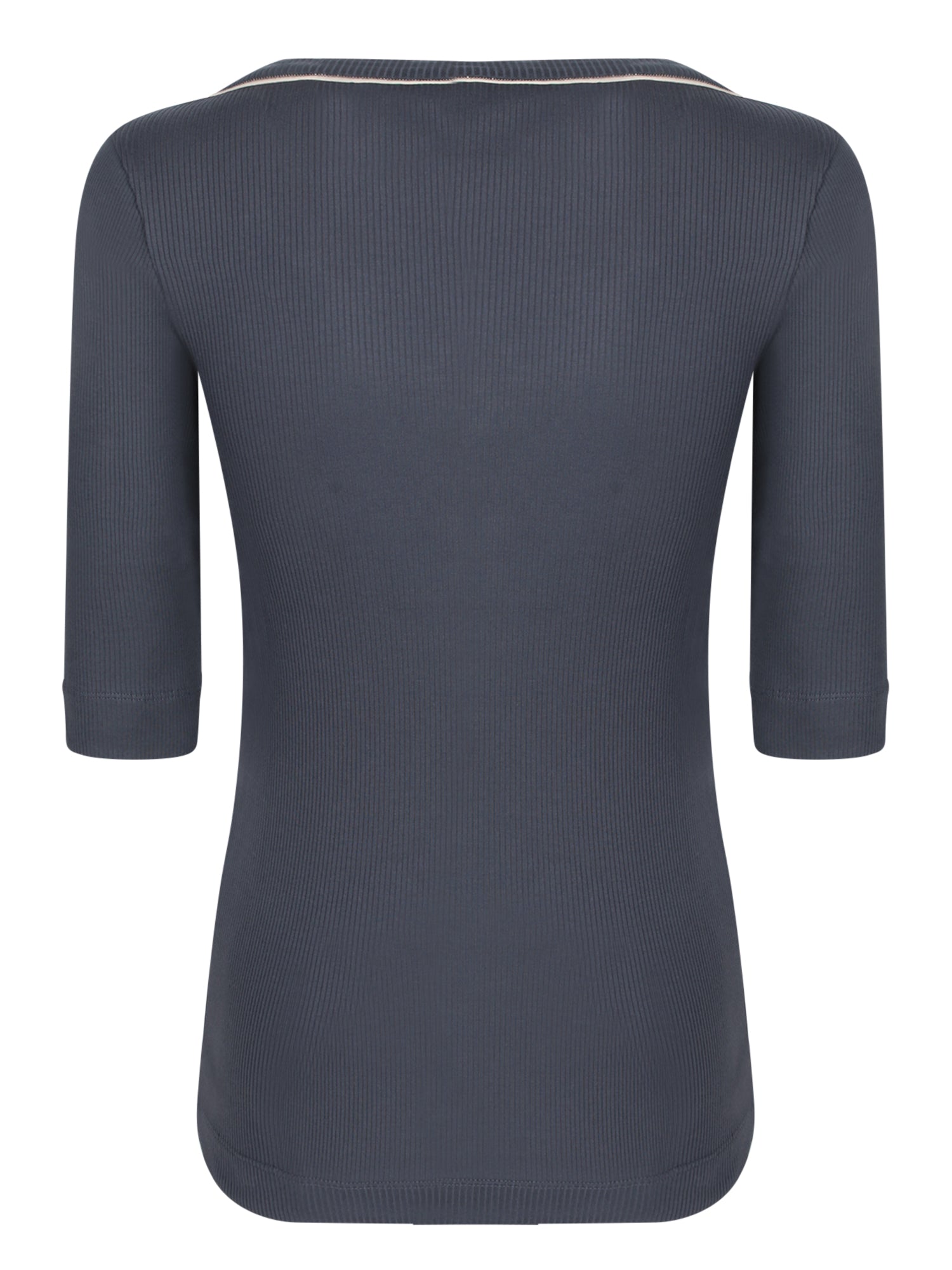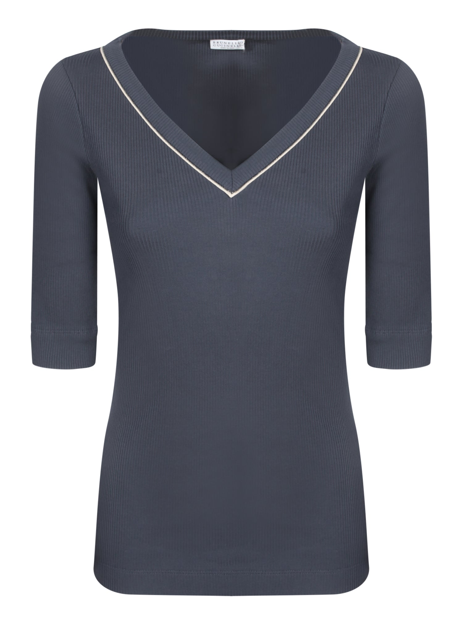 This elegant Brunello Cucinelli T-shirt features a sophisticated Monile trim along the V-neckline, three-quarter sleeves, and a soft knitted texture that provides both comfort and style.