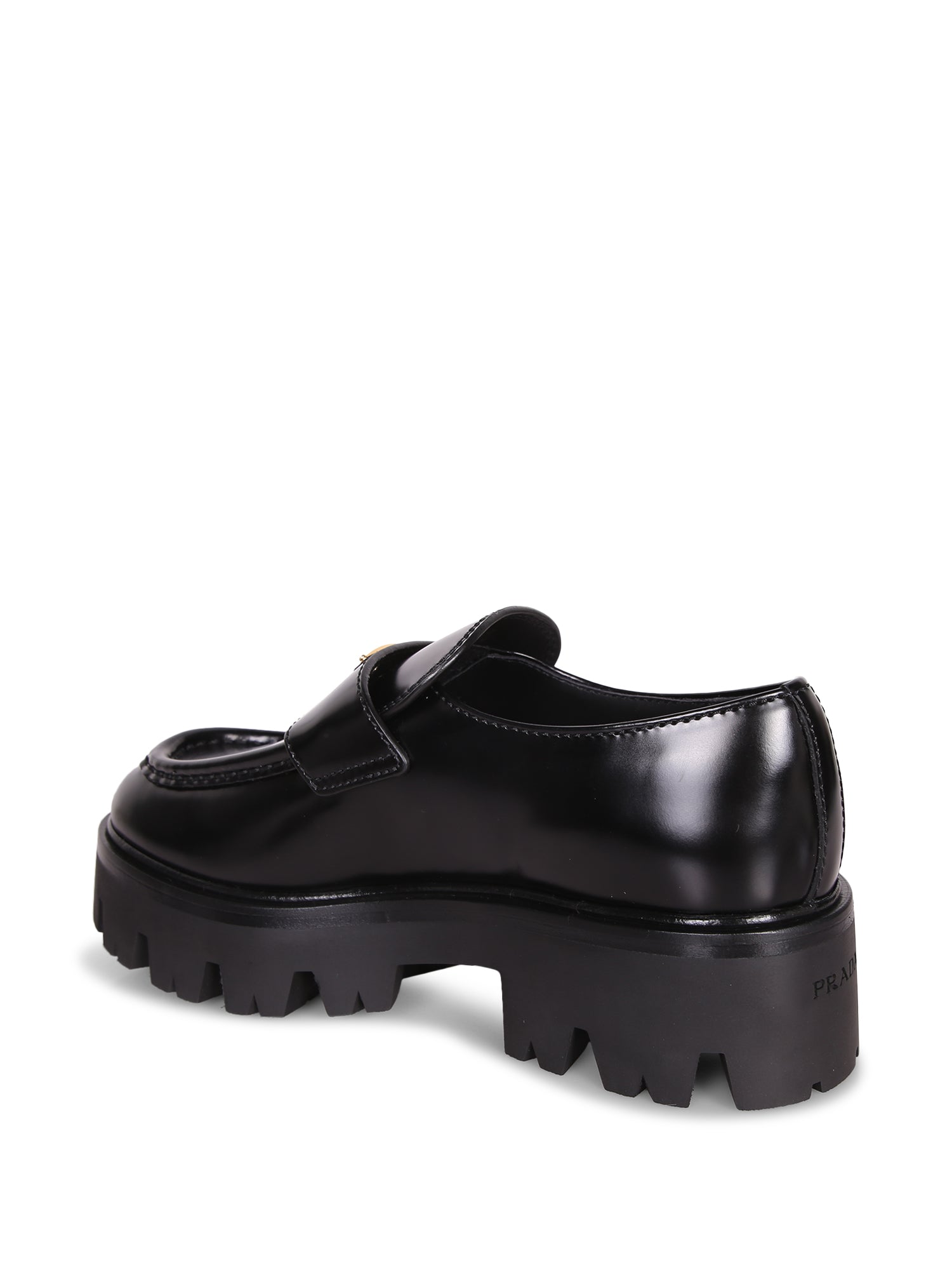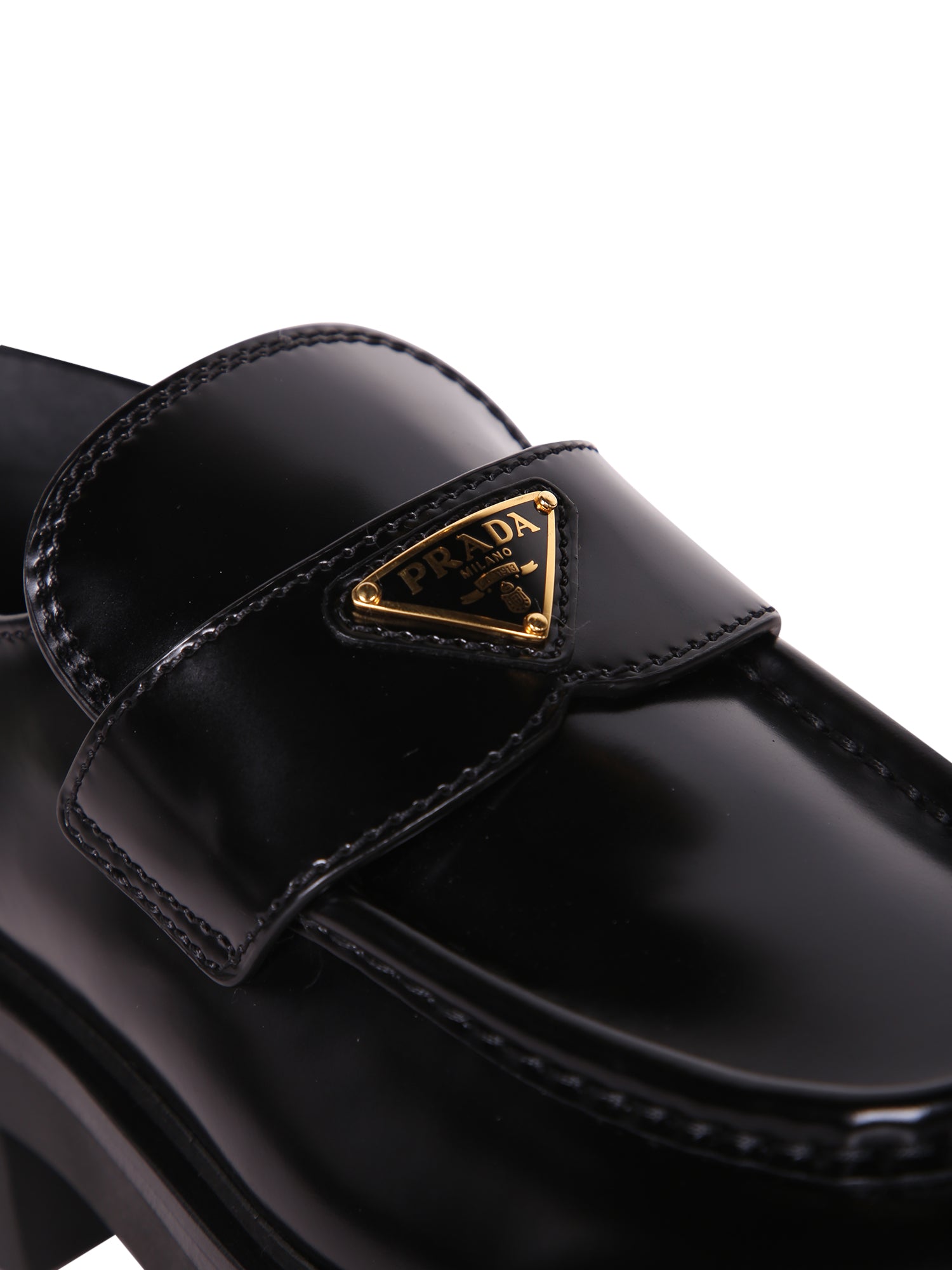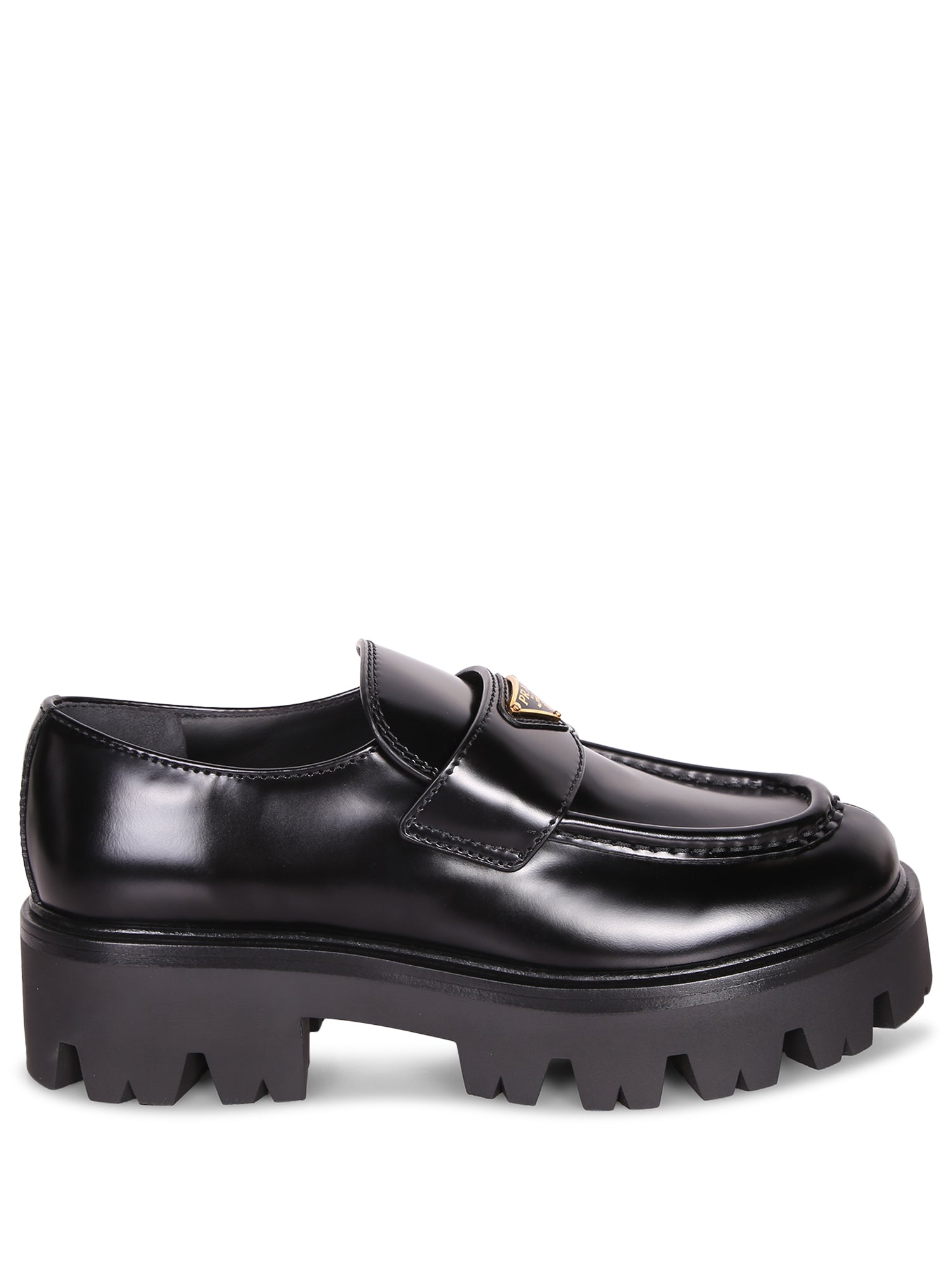 Smooth leather loafer. Thick rubber sole. Golden PRADA logo detail.