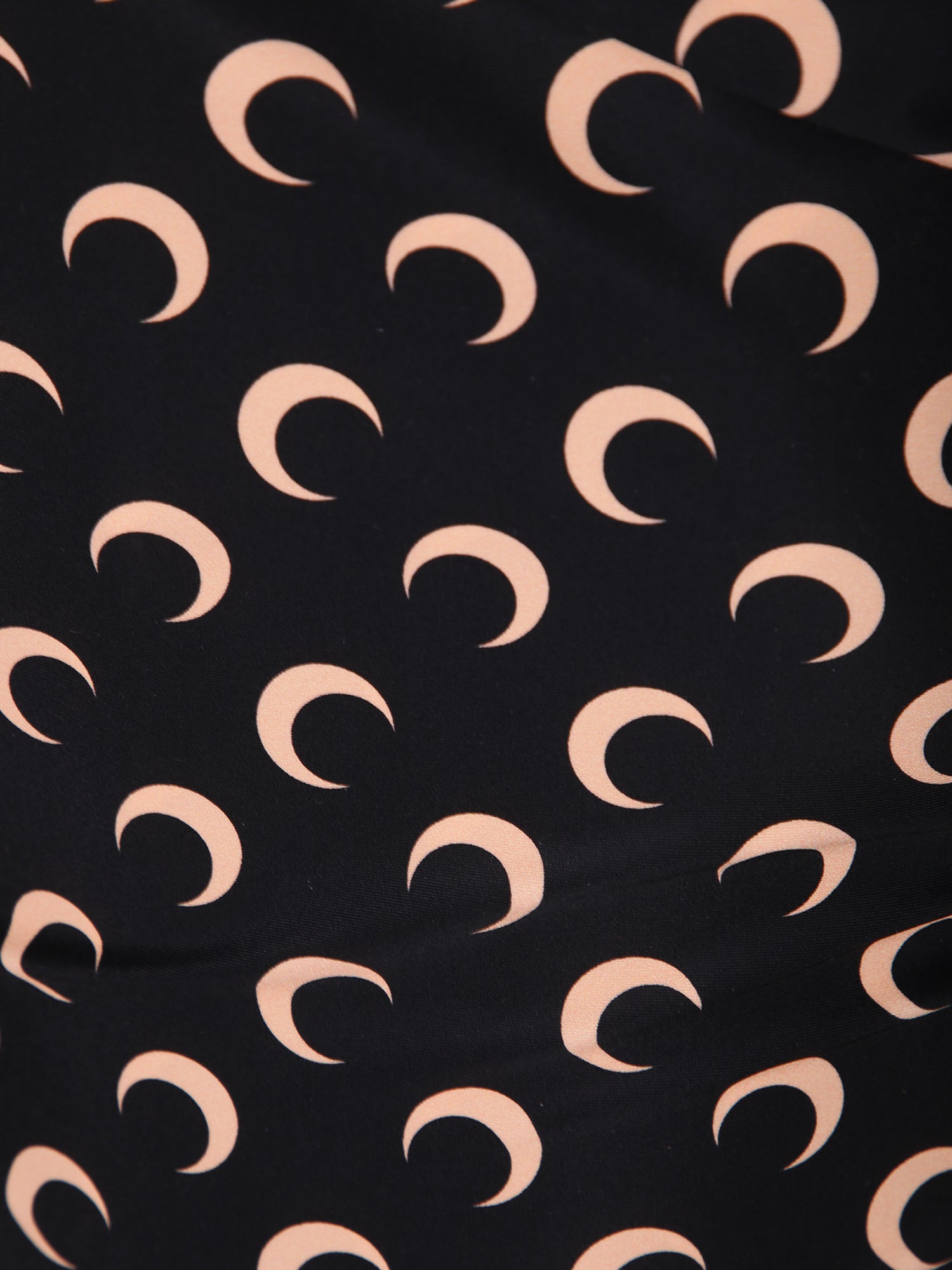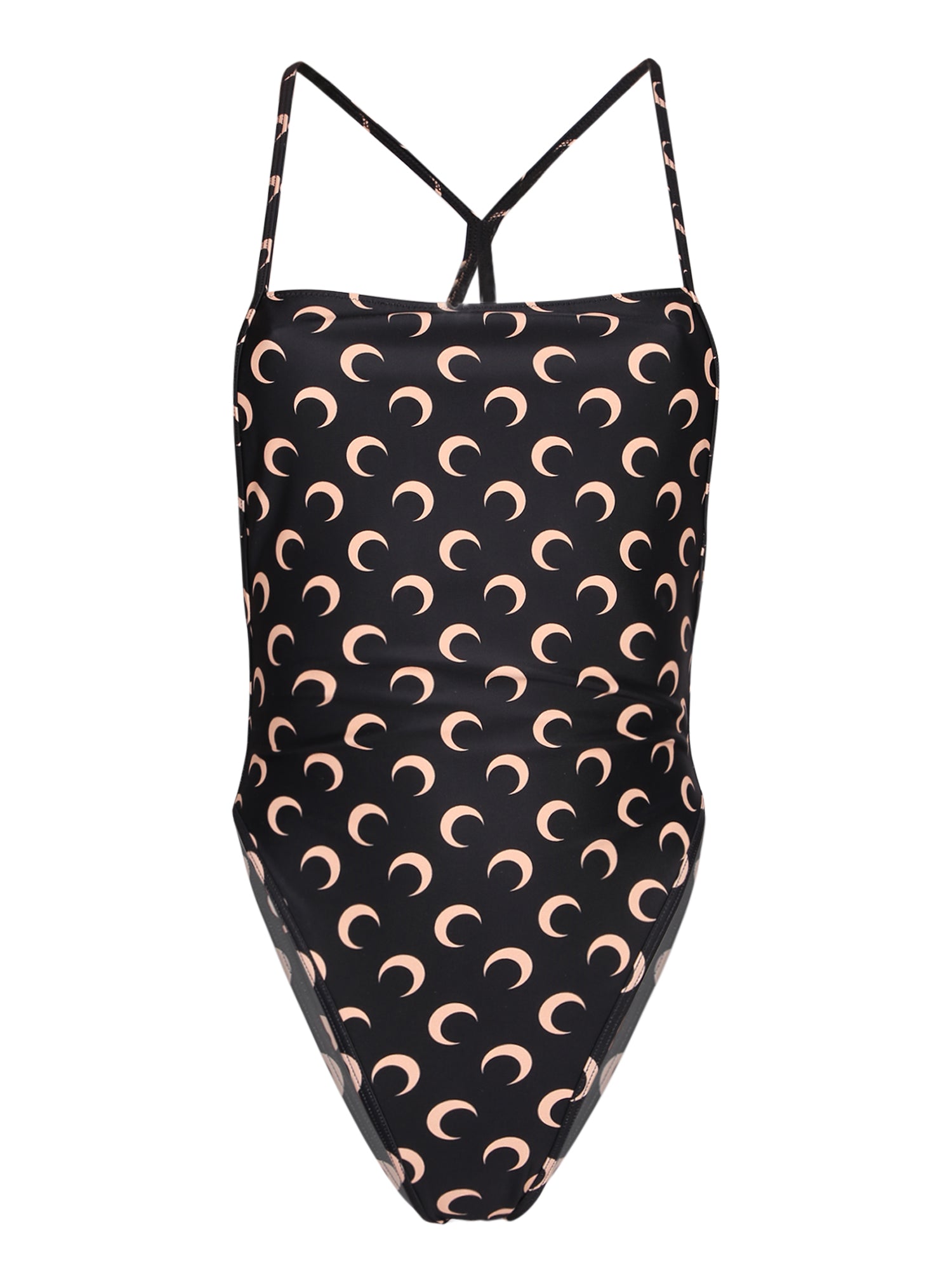 Black one-piece swimsuit featuring thin adjustable straps. Adorned with an iconic beige crescent moon print.