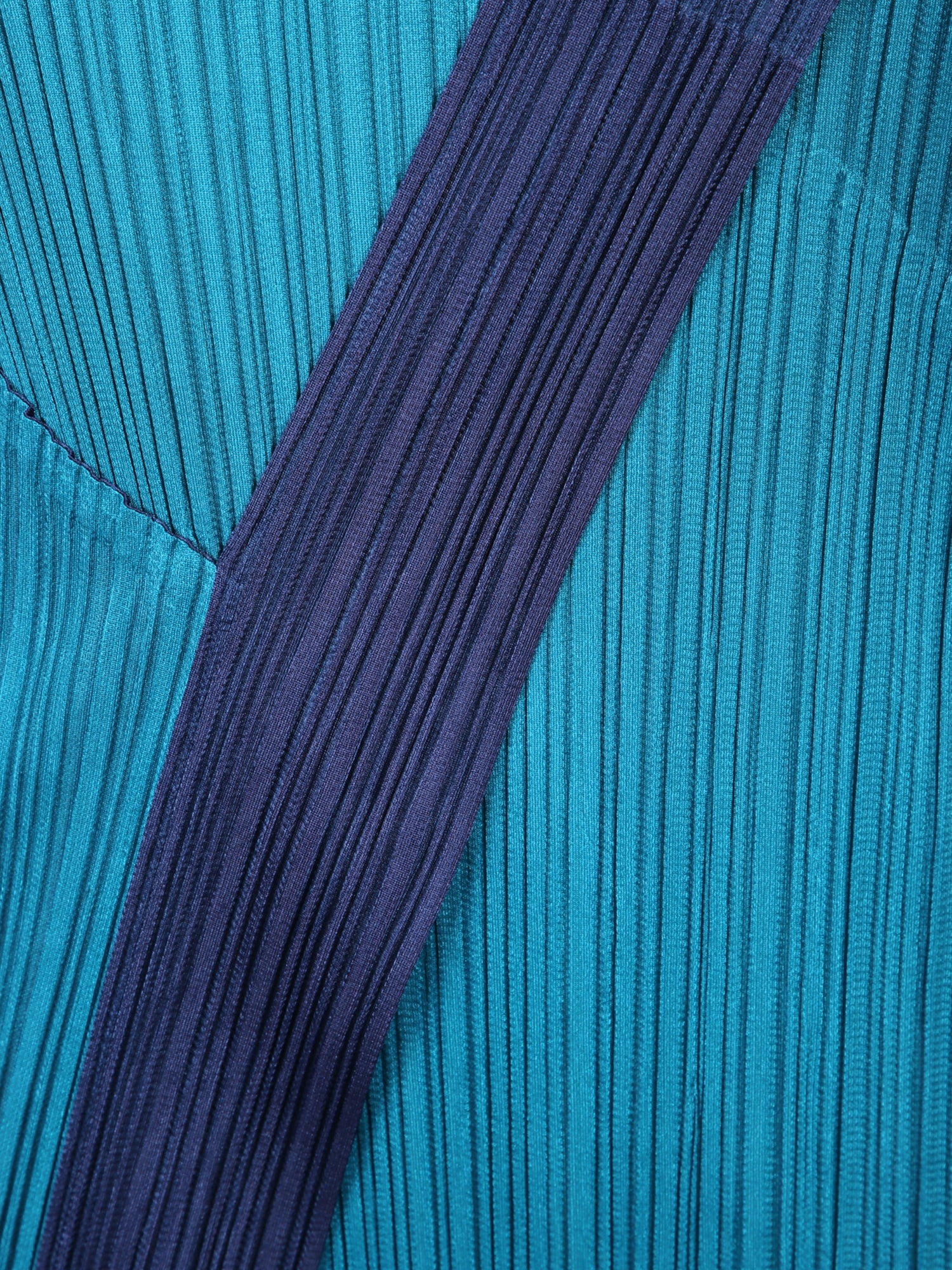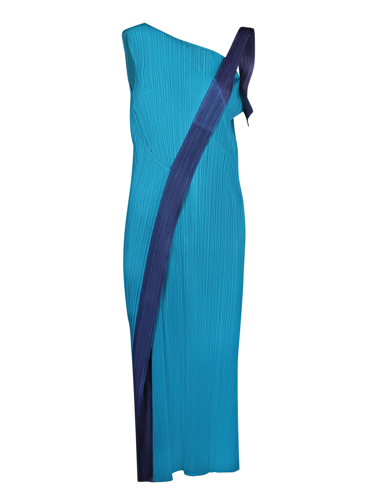 One-shoulder dress with asymmetrical lines. Pleated fabric in shades of turquoise and blue.