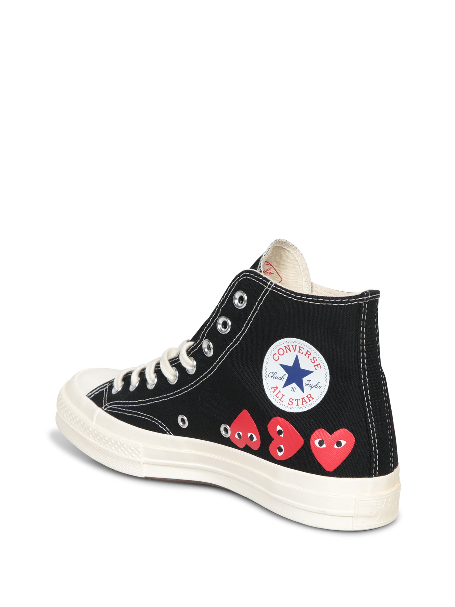 A playful art touch merges with urban style in the Comme des Garcons Play Multi Heart High sneakers. The iconic design with contrasting hearts offers a distinctive aesthetic, perfect for those who love unique details and bold styles.