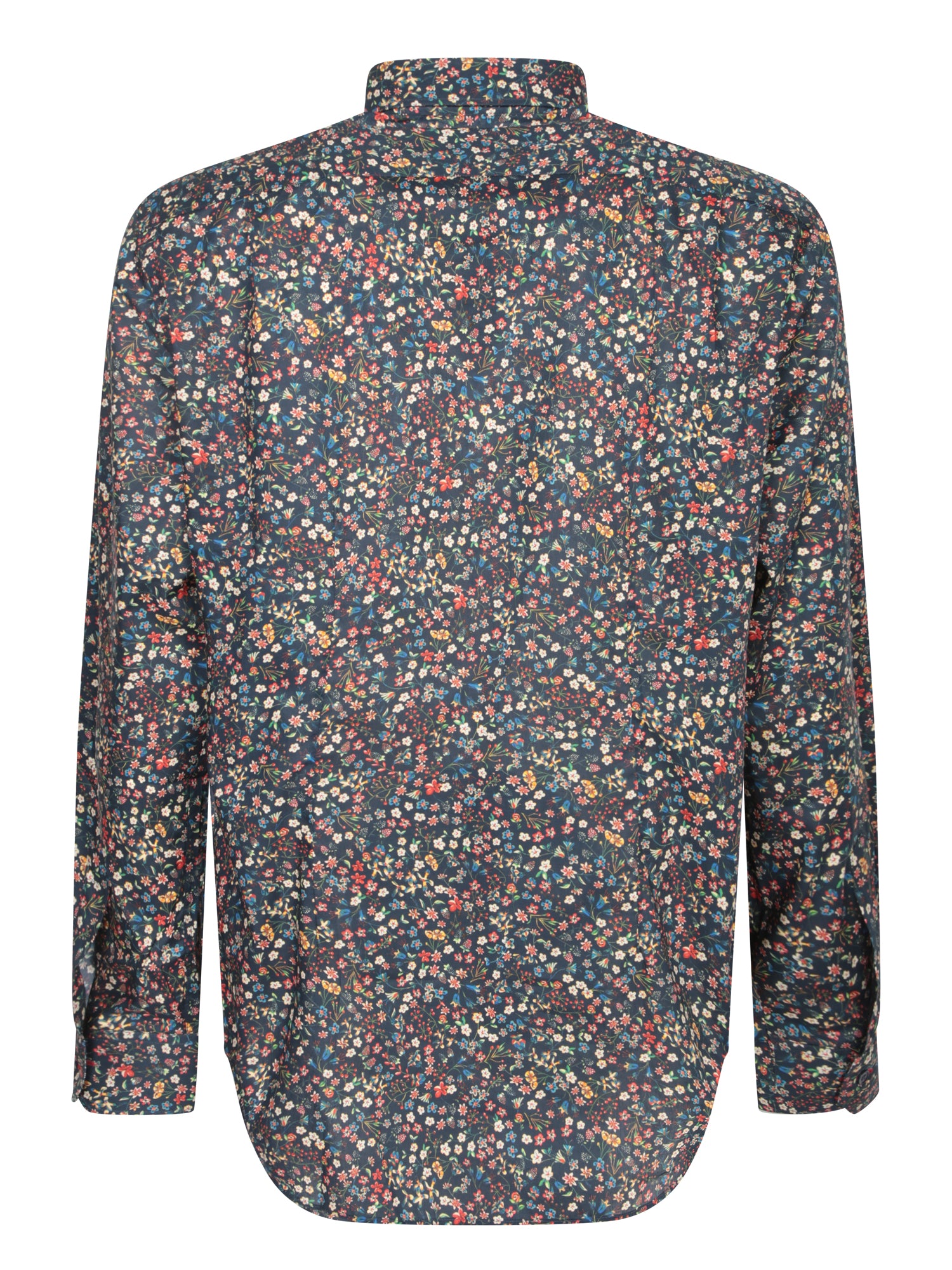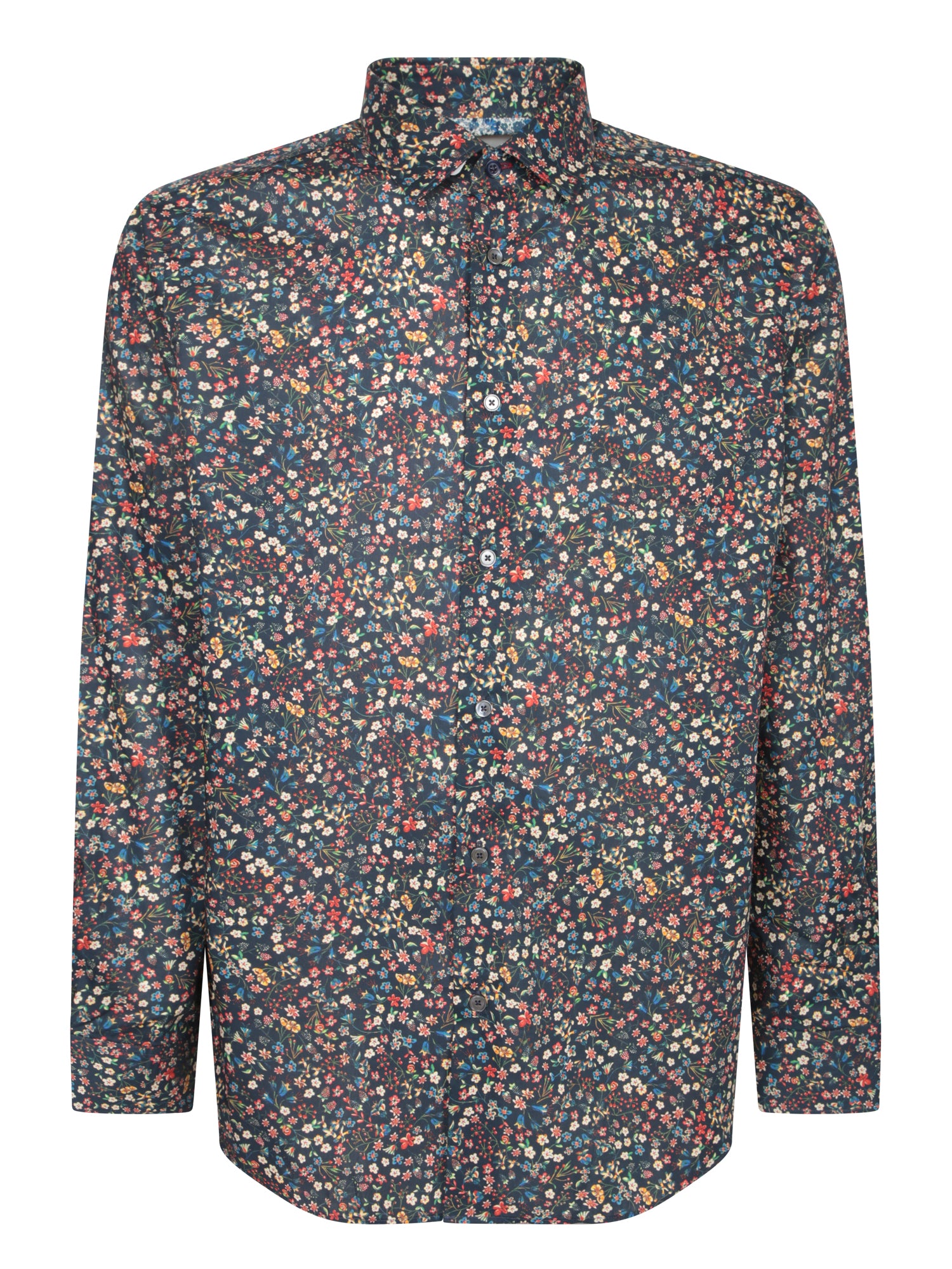 Long sleeve shirt, cotton fabric, multicolor floral pattern on blue base, classic collar, front button closure.