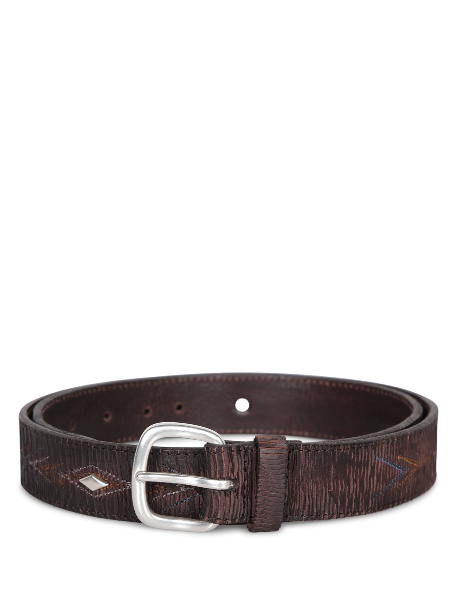 Dark brown leather belt with multicolor geometric embroidery. Square silver-tone metal buckle. Five adjustment holes.
