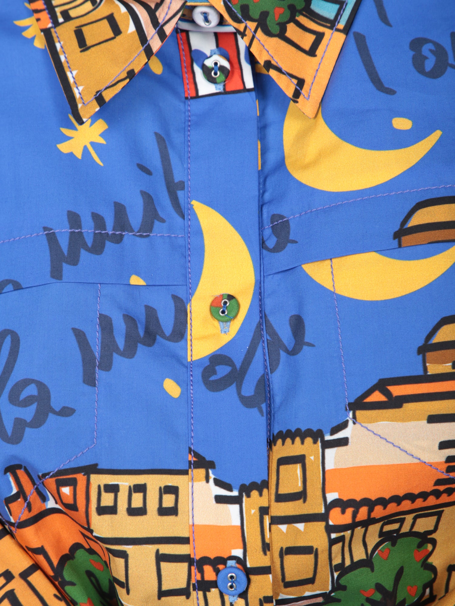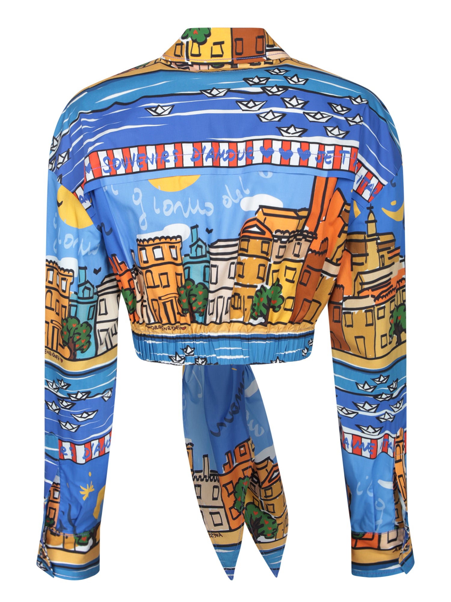 Discover the boldness of the Alessandro Enriquez designed shirt, featuring a front knot that emphasizes the silhouette and a colorful print capturing the vibrant essence of coastal cities.