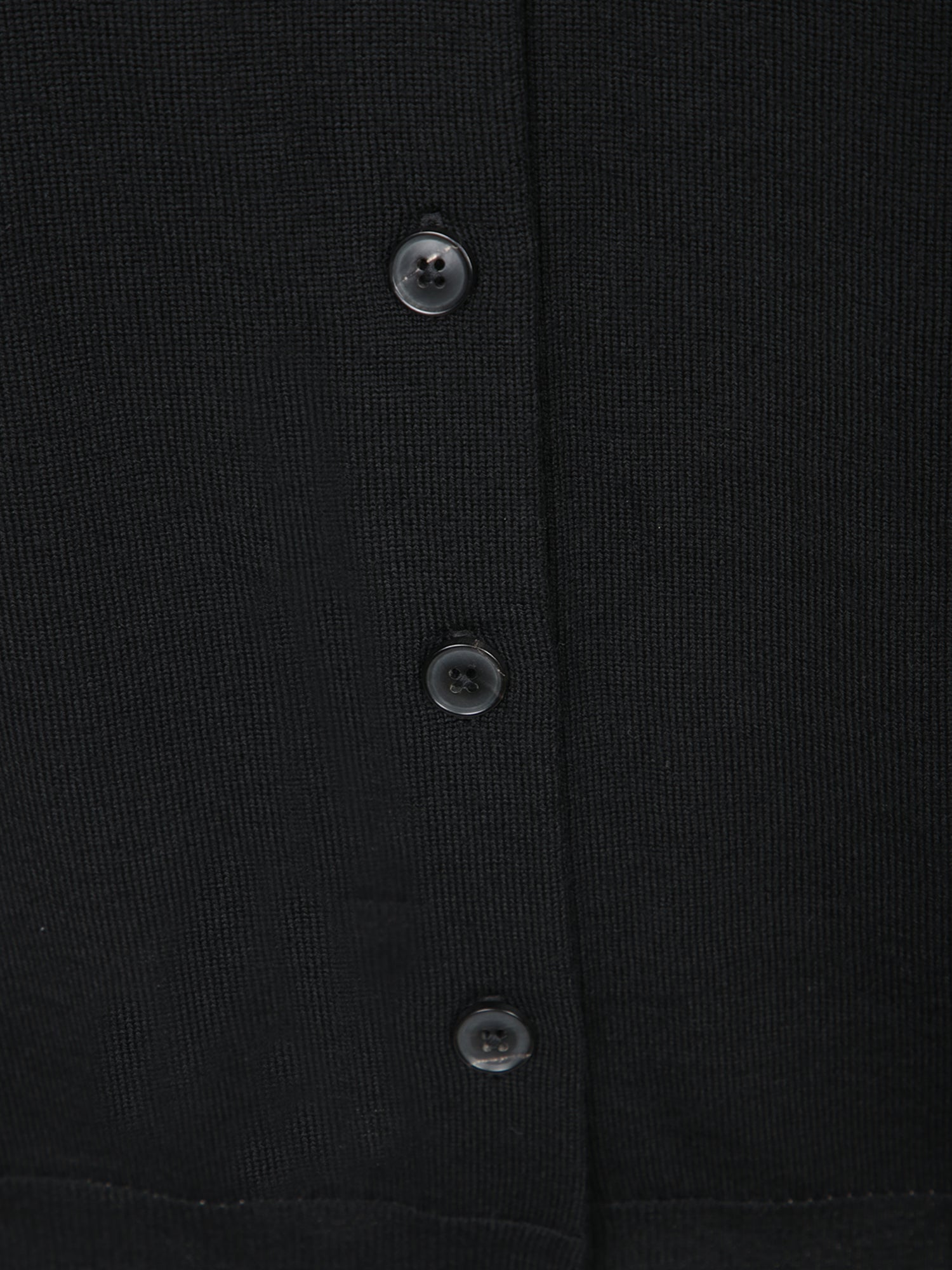 Black knit cardigan with front buttons. Multicolored striped sleeve cuffs.