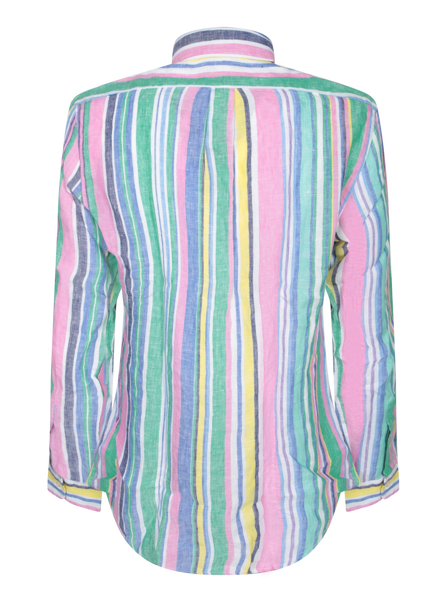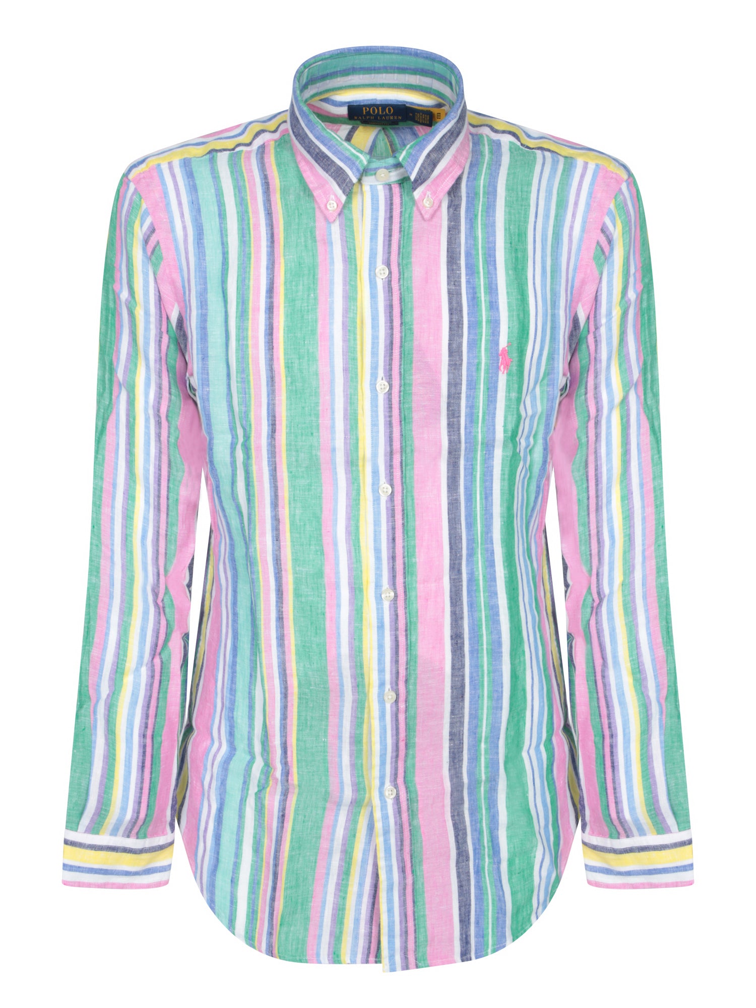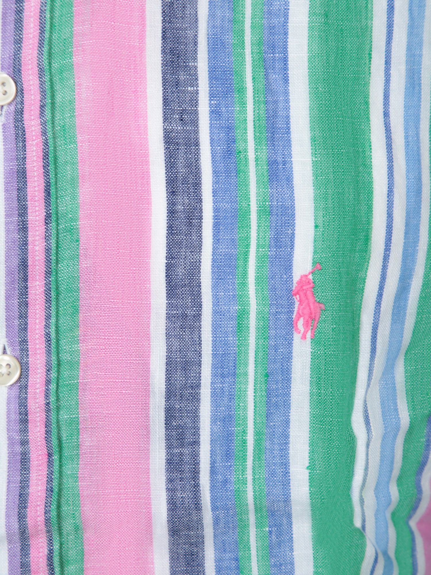 Explore casual elegance with this Polo Ralph Lauren linen shirt. Featuring a vibrant multicolor stripe motif and a classic silhouette, it provides a perfect balance between comfort and sophisticated style.