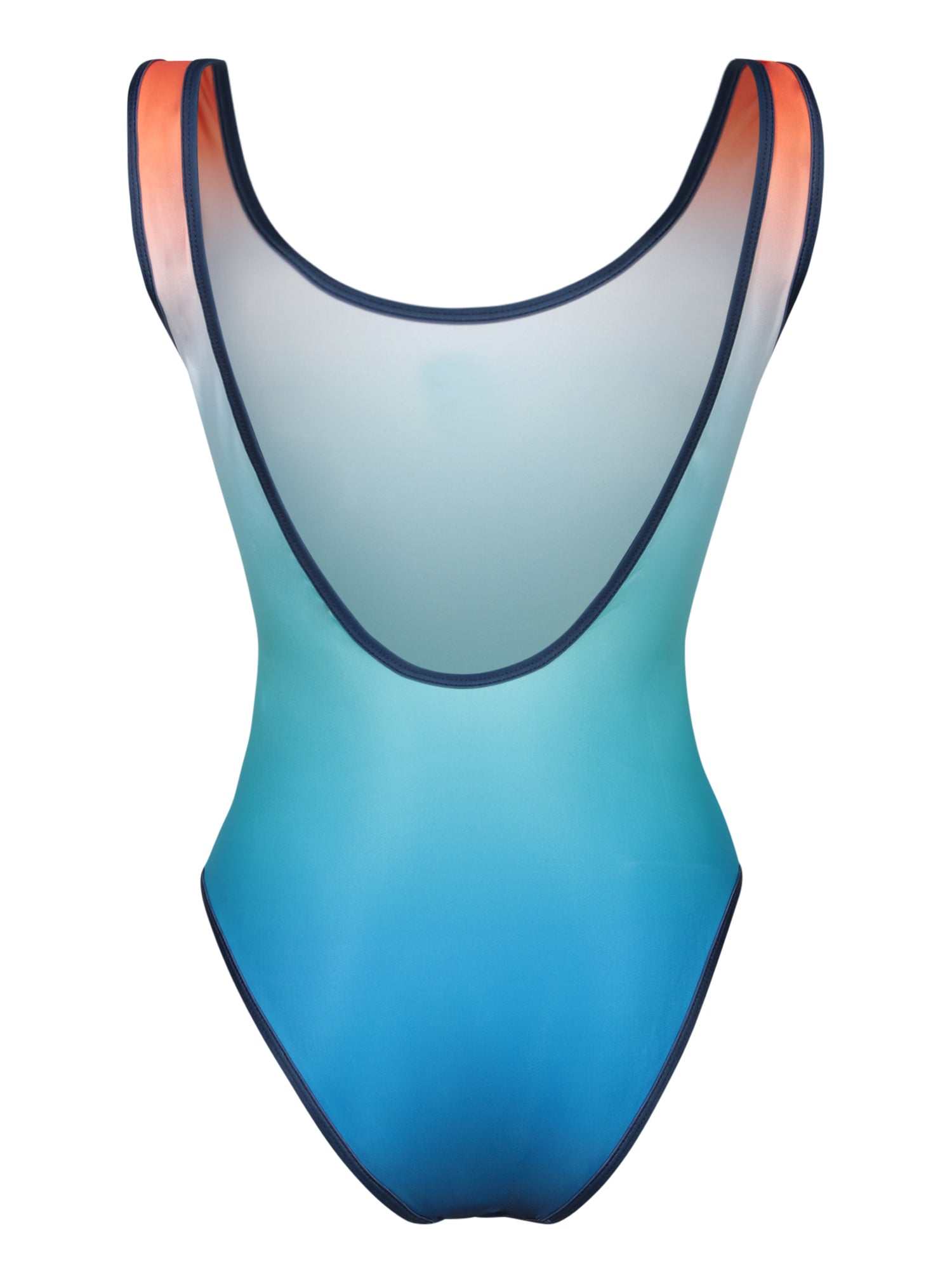 One-piece swimsuit. Gradient print with frontal logo. U-neckline.