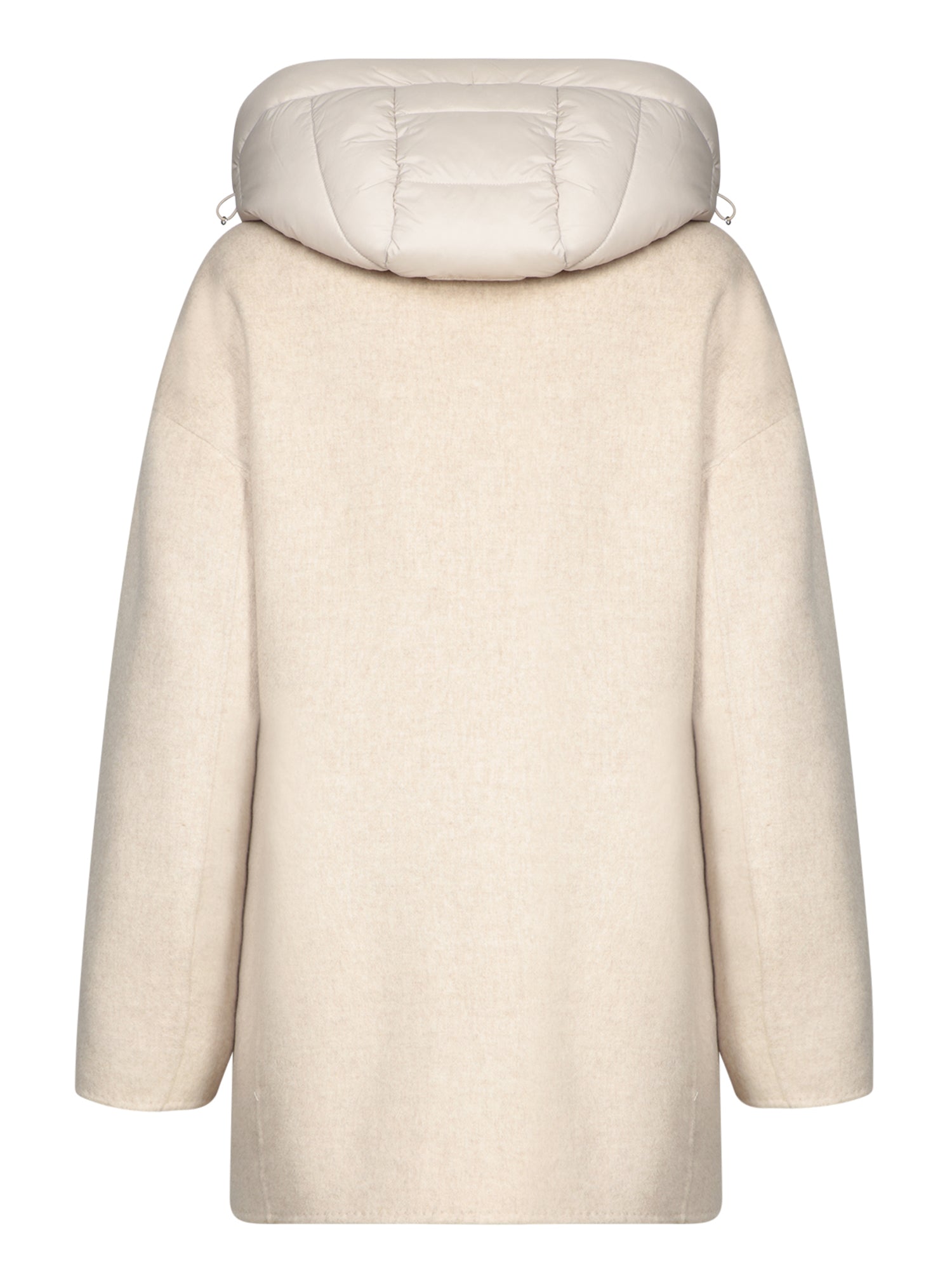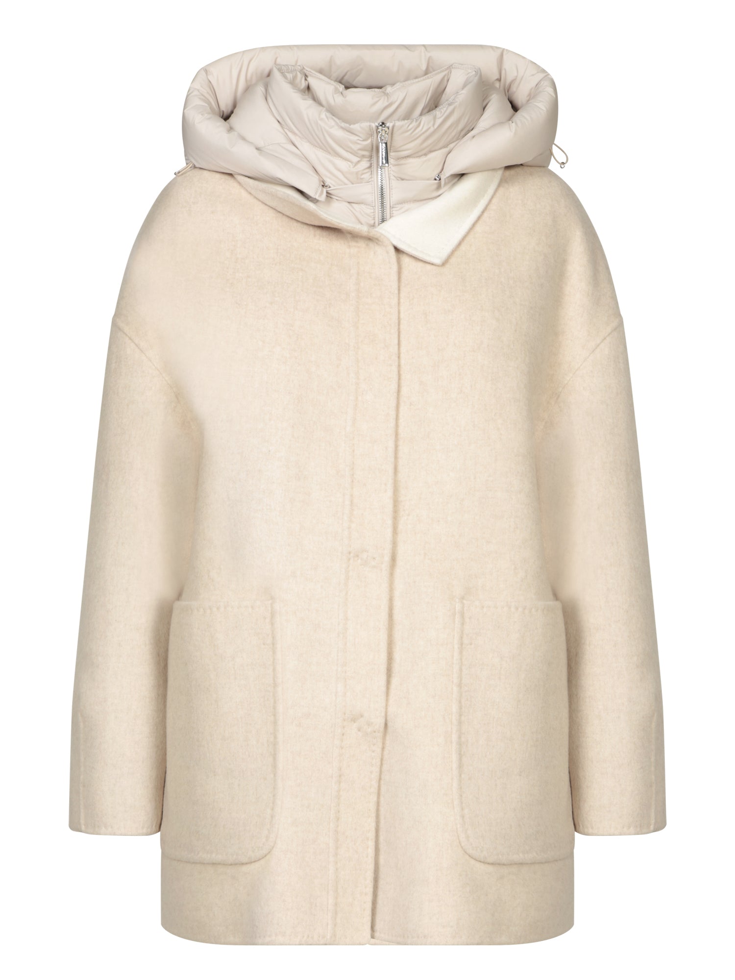 This elegant Moorer jacket in sand color features a sophisticated angora wool design with a padded hood interior for maximum comfort and warmth. The clean lines and refined silhouette underscore a luxurious contemporary aesthetic.
